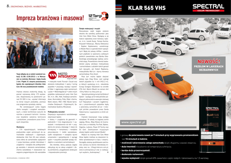 8 | EKONOMIA, BIZNES, MARKETING Targi odbędą się w ostatni weekend wakacji 31.08.–2.09.2012 r. w Warszawie na Lotnisku Bemowo i będą trwały 3 dni. Piątek 31 sierpnia przeznaczony będzie dla największych klientów Inter Cars SA oraz przedstawicieli mediów. Impreza stwarza znakomitą okazję, by poznać najnowszą ofertę 170 wystawców, eksponowaną na powierzchni ponad 25 000 m kw., uzyskać informacje na temat nowych produktów, promocji oraz programów sprzedaży ratalnej. Na zwiedzających czeka bogata oferta narzędzi i urządzeń warsztatowych, a także komfortowe warunki do rozmów o sprawach techniki i biznesu oraz bezpłatne szkolenia techniczne i produktowe, prowadzone przez firmowych ekspertów. Wystawcy: • 170 najważniejszych, światowych producentów części zamiennych do samochodów osobowych i ciężarowych, dostawców Inter Cars SA oraz rozbudowana oferta do samochodów azjatyckich • prasa branżowa, portale internetowe • urządzenia i narzędzia dla profesjonalnego warsztatu • akcesoria samochodowe, chemia warsztatowa • nowoczesne rozwiązania programistyczne dla warsztatów Autonaprawa | Czerwiec 2012 • motocykle marek Triumph i Ducati oraz akcesoria motocyklowe • opony i tuning pojazdów • przyczepy, naczepy i wywrotki Feber • regeneracja części zamiennych Lauber • Motointegrator.pl • wiele innych projektów realizowanych przez Inter Cars SA, m.in.: Blic, Koło, Instalacje samochodowe, Akumulatory, Flota, Oleje i chemia, Marki własne, RSO i RSC (Rynek Samochodów Osobowych i Ciężarowych), Samochodowe Systemy Wtryskowe. Profesjonalny warsztat Ekspozycja wyposażenia warsztatowego obejmować będzie: • testery • urządzenia do geometrii • podnośniki • linie diagnostyczne • wyważarki i montażownice do kół • urządzenia do serwisu olejowego • stacje do klimatyzacji • kompresory i narzędzia pneumatyczne • meble warsztatowe, szafki narzędziowe • narzędzia ręczne uniwersalne i specjalistyczne • wyciągi spalin • wszystkie pozostałe sprzęty niezbędne w warsztacie samochodowym Dla klientów, którzy podczas targów zdecydują się na zakup urządzeń i złożą zamówienia, przygotowano atrakcyjne i niepowtarzalne promocje. Święto motoryzacji i muzyki Rozrywkowa część targów zostanie otwarta dla szerokiej publiczności jako Inter Cars Motor Show. Wystąpią w jej trakcie najbardziej znani kierowcy rajdowi, m.in. Leszek Kuzaj, Tomasz Kuchar, Krzysztof Hołowczyc, Maciej Oleksowicz i Kajetan Kajetanowicz, uczestnicząc w Master Race z superodcinkiem specjalnym! Będą też pokazy driftów i zawrotnych prędkości w wykonaniu czołowych polskich zawodników oraz Bartka Ostałowskiego prowadzącego rajdowy samochód stopą. Przewidziano również kaskaderskie popisy akrobacji motocyklowej i samochodowe z udziałem takich gwiazd tych dyscyplin, jak Hubert Raptowny, motocyklistka Mai-Lin i słynny kierowca samochodowy Terry Grant. Poza tym można będzie obejrzeć pokazy typu Drag Show, czyli wyścigi dwóch pojazdów na ¼ mili (402,3 m), w których wystartują m.in.: rekordzista Europy Grzegorz Staszewski na corvette VTG 4x4, Marcin Blauth na camaro 4x4 i Dimy Nahul na chevy pick up. Specjalną atrakcją ma być też Globe of Speed – występy aż 6 motocyklistów jeżdżących jednocześnie wewnątrz stalowej kuli! Najszybsze i zarazem najgłośniejsze z prezentowanych pojazdów będą z pewnością samochód jet-car i motocykl jet-bike prowadzone przez Gerda Habermanna i wyposażone w silniki odrzutowe. Imprezie towarzyszyć mają występy estradowe. W sobotę na targowej scenie zagrają: Mrozu, Maja Kleszcz & Incarnations June, w niedzielę: Fox Feat, Sqbass, Organka, Lubrano, Power Of Trynity oraz DJ Cent. Zwieńczeniem muzycznych atrakcji będzie wielki koncert Brodki! Wejście na imprezę Inter Cars Motor Show będzie możliwe za okazaniem biletów sprzedawanych w lipcu i sierpniu. Szczegóły zostaną opublikowane pod koniec czerwca na stronie internetowej imprezy oraz na: 12targi.intercars.com.pl, www.e-autonaprawa.pl oraz w wakacyjnym wydaniu „Autonaprawy”. n Fot. archiwum Impreza branżowa i masowa!