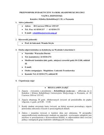 PRZEWODNIK DYDAKTYCZNY NA ROK AKADEMICKI 2011/2012 NAZWA JEDNOSTKI: Katedra i Klinika Rehabilitacji U.M. w Poznaniu 1. Adres jednostki: Adres: 28 Czerwca 1956 nr 135/147 Tel. /Fax: 61 8310-217 / 61 8310-173 E-mail: [email protected] 2. Kierownik jednostki: Prof. dr hab.med. Wanda Stryła 3. Osoba odpowiedzialna za dydaktykę na Wydziale Lekarskim I: Nazwisko Warzecha Dorota Tel. kontaktowy: 61 8310-274 Możliwość kontaktu (dni, godz., miejsce) czwartki godz.10-12.00, oddział IE E-mail: Osoba zastępująca: Magdalena Łańczak-Trzaskowska Kontakt Tel. 61 8310-273, oddział IE 4. Organizacja zajęć REGULAMIN ZAJĘĆ 1. Zajęcia – ćwiczenia z przedmiotu – Rehabilitacja medyczna - odbywają się w Katedrze i Klinice Rehabilitacji Uniwersytetu Medycznego w Poznaniu, ul. 28 Czerwca 1956 nr 135/147. 2. Zajęcia obejmują 30 godz. zblokowanych ćwiczeń od poniedziałku do piątku włącznie, w godz. od 8.00 – 13.00. 3. Każdy student otrzymuje kartę ćwiczeń, na której asystent prowadzący zajęcia potwierdza zaliczenie ćwiczeń w poszczególnych dniach. 4. Zakres i tematyka ćwiczeń w każdym dniu jest odmienna. W przypadku usprawiedliwionej nieobecności studenta na zajęciach wyrównanie zaległości jest możliwe w porozumieniu z Kierownikiem Kliniki, w odpowiednim dniu ćwiczeń jednej z następnych grup studentów odrabiających ćwiczenia. 5. Nieusprawiedliwione opuszczenie nawet 1 dnia ćwiczeń jest równoznaczne z ich nie zaliczeniem. 6. Spóźnienia na ćwiczenia wpisuje się do karty ćwiczeń. Dwa spóźnienia równają się nie zaliczeniu ćwiczeń. 7. Zaliczenie zajęć – ćwiczeń w formie testu odbywa się w piątek. 8. Warunkiem dopuszczenia do kolokwium jest zaliczenie wszystkich dni ćwiczeń. 9. Student, który za zgodą Kierownika Kliniki odrabia ćwiczenia z inną grupą zalicza kolokwium również z tą grupą. 10. Na zajęcia student przychodzi w białym fartuchu i zmienia obuwie. PROGRAM ZAJĘĆ Poniedziałek 8.00 – 9.00 9.00 – 10.00 10.00 – 10.30 10.30 – 11.30 11.30 – 13.00 Udział w wizycie lekarskiej Pojęcie kompleksowej rehabilitacji, kierunki rehabilitacji Przerwa Systematyka ćwiczeń, fizykoterapia. Pojęcie niepełnosprawności Wady postawy, skoliozy – zasady usprawniania Wtorek 8.00 – 9.00 Udział w wizycie lekarskiej 9.00 – 10.30 Omawianie przypadków klinicznych 10.30 – 11.00 Przerwa 11.00 – 13.00 Postępowanie usprawniające w urazach czaszkowo-mózgowych, udarach i innych uszkodzeniach o.u.n. (np.guzy) Środa 8.00 – 9.00 Udział w wizycie lekarskiej 9.00 – 10.30 Omawianie przypadków klinicznych 10.30 – 11.00 Przerwa 11.00 – 13.00 Usprawnianie w uszkodzeniach obwodowego układu nerwowego. Zmiany zwyrodnieniowe stawów i usprawnianie po endoprotezo plastyce stawu biodrowego i kolanowego. Usprawnianie po złamaniach kończyn – leczenie zachowawcze Czwartek 8.00 – 9.00 9.00 – 10.30 10.30 – 11.00 11.00 – 13.00 górnych Udział w wizycie lekarskiej Omawianie przypadków klinicznych Przerwa Zasady usprawniania po amputacjach kończyn dolnych i 2 Piątek 8.00 – 9.00 Udział w wizycie lekarskiej 9.00 – 10.30 Omawianie przypadków klinicznych 10.30 – 11.00 Przerwa 11.00 – 11.30 Usprawnianie w zespołach bólowych kręgosłupa. Osteoporoza, zasady postępowania usprawniającego. 11.30 – 13.00 Zaliczenie – test 5. Program nauczania Wymagania wstępne: pojęcie rehabilitacji Przygotowanie do zajęć: badanie ortopedyczne i neurologiczne Wymagania końcowe: zasady usprawniania w omawianych jednostkach chorobowych 6. Cele i treści merytoryczne przedmiotu Zapoznanie z metodami usprawniania w najczęstszych schorzeniach neurologicznych i ortopedycznych 7. Tematy wykładów: 8. Tematy seminariów: 9. Tematy ćwiczeń: 1. 2. 3. 4. 5. 6. 7. Pojęcie kompleksowej rehabilitacji. Kierunki rehabilitacji Systematyka ćwiczeń. Fizykoterapia Pojęcie niepełnosprawności Wady postawy, skoliozy – zasady usprawniania Usprawnianie po złamaniach kończyn (leczenie zachowawcze) Rehabilitacja w udarach mózgu Postępowanie usprawniające w urazach czaszkowo-mózgowych i innych uszkodzeniach ośrodkowego układu nerwowego (np. guzy) 8. Rehabilitacja w urazach rdzenia kręgowego 9. Usprawnianie w uszkodzeniach obwodowego układu nerwowego. 10. Zasady usprawniania po amputacjach kończyn dolnych 11. Zasady usprawniania po amputacjach kończyn górnych 12. Zmiany zwyrodnieniowe stawów 13. Usprawnianie po endoprotezoplastyce stawu biodrowego, kolanowego, barkowego i łokciowego 3 14. Postępowanie w ostrych zespołach bólowych kręgosłupa 15. Usprawnianie w zmianach zwyrodnieniowych kręgosłupa 16. Osteoporoza - zasady postępowania usprawniającego 10. Zasady i forma oceny wyników nauczania i zaliczenia zajęć oraz przedmiotu: Zaliczenie przedmiotu – Rehabilitacja medyczna – uzyskuje się po odbyciu 30 godzin zajęć – ćwiczeń trwających 1 tydzień (od poniedziałku do piątku włącznie) w godz. 8.00 – 13.00. 1. Zajęcia odbywają się w grupach studenckich według ustaleń Dziekanatu Wydziału Lekarskiego. 2. Zaliczenie zajęć odbywa się w piątek – w ostatnim dniu zajęć w formie testu. 11. Materiały dydaktyczne, literatura obowiązująca i uzupełniająca: - Ortopedia i Rehabilitacja”, tom I i II, pod redakcją W. Marciniaka, A. Szulca, PZWL, Warszawa, 2003. „Rehabilitacja medyczna”, II wydanie, pod redakcją W. Degi i K. Milanowskiej, Wydawnictwo PZWL, Warszawa, 1993. „Rehabilitacja medyczna” t. I i II pod redakcją Andrzeja Kwolka, 2003 „Rehabilitacja medyczna”, I wydanie, pod redakcją Jerzego Kiwerskiego, Wydawnictwo Lekarskie PZWL, Warszawa, 2006. „Przegląd Nauk o Zdrowiu”, czasopismo WNoZ Uniwersytetu Medycznego w Poznaniu, pod redakcją Tomasza Opali Rehabilitation of the spine a practition – Craig Liebenson Physical Rehabilitation, O’Sullivan S. Essentials of physical medicine and rehabilitation, Frontera, Silver, Rizzo Stroke rehabilitation – Janet Carr, Robe