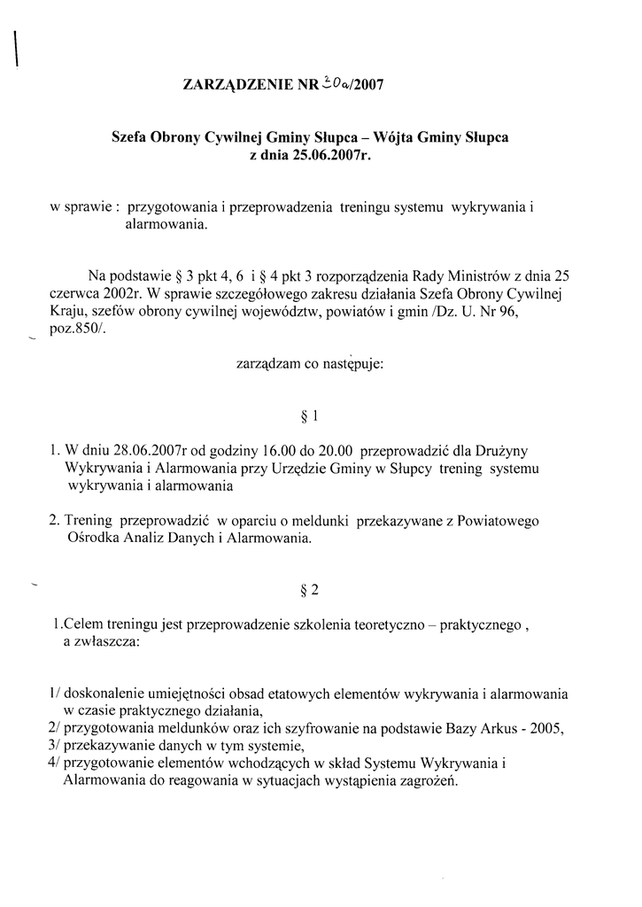 ZAP.ZĄDZE NIE NR "}0 ą,/2007 Szefaobrony Cywilnej Gminy Słupca- Wójta Gminy Słupca z dnia 25.06.2007r. w sprawie : przygotowaniai przeprowadzetia treningusystemu wykrywania i alarmowania. Napodstawie$ 3 pkt 4,6 i $ 4pkt 3rozporządzeniaRadyMinistrow zdnta25 czerwca2))Zr. W sprawieszczęgołowego zakresudziałania Szefaobrony Cywilnej Kraju,szefowobronycywilnejwojewództw,powiatowi gminlDz.IJ, Nr 96, poz.850l. zarządzamco następuj e: $1 1. W dniu 28.06.2007r od godziny16.00do 20.00 przeprowadzic dla Druzyny Wykrywaniai Alarmowaniaprzy IJrzędzieGminy w Słupcytrening systemu wykrywaniai alarmowania 2. Trening przeprowadzicw oparciuo meldunki przekazryanęz Powiatowego ośrodkaAnaliz Danychi Alarmowania. $2 l.Celem treningujest przeprowadzenieszkolenia teoretyczno- praktycznego, a zwłaszcza: l/ doskonalenieumiejętnoŚciobsad etatowychelementów wykrywania i alarmowania w czasie praktycznego dziatanra, 2l przygotowaniameldunkow oraz ich szyfrowaniena podstawieBazy Arkus - 2005, 3l przekazywanie danych w tym systemie, 4l przygotowanieelementów wchodzącychw składSystemu Wykrywania i Alarmowania do reagowaniaw sytuacjachwystąpieniazagrozei. $3 2. w treningu udział biorą: - Druzyna Wykrywania i Alarmowania przy lJrzędzie Gminy Słupca 20,ń obsadyetatowej, - Punkty Alarmowania w sołectwach: o o o o \- Drążna Młodojewo Marcewo Piotrowice 3. Komendant DWA nalviązełączność telefoniCznąi radiowąw czasie treningu z Powiatowym oŚrodkiem Ana|izy Danych i' Alarmowania w Słupcy $4 1.Szkolenie teoretyczne obsadbiorących udziałw treninguprzeprowadzi komendant formacji. 2.odpowtedztałnymza Sprawneprzygotowaniei przeprowadzeniętreningu czynię Inspektorads. wojskowych i OC oraz KomendantaDWA $s Zarządzeniewchodzi w życiez dniem podpisania. wÓ/T GMINY (-/p GraWKanł I