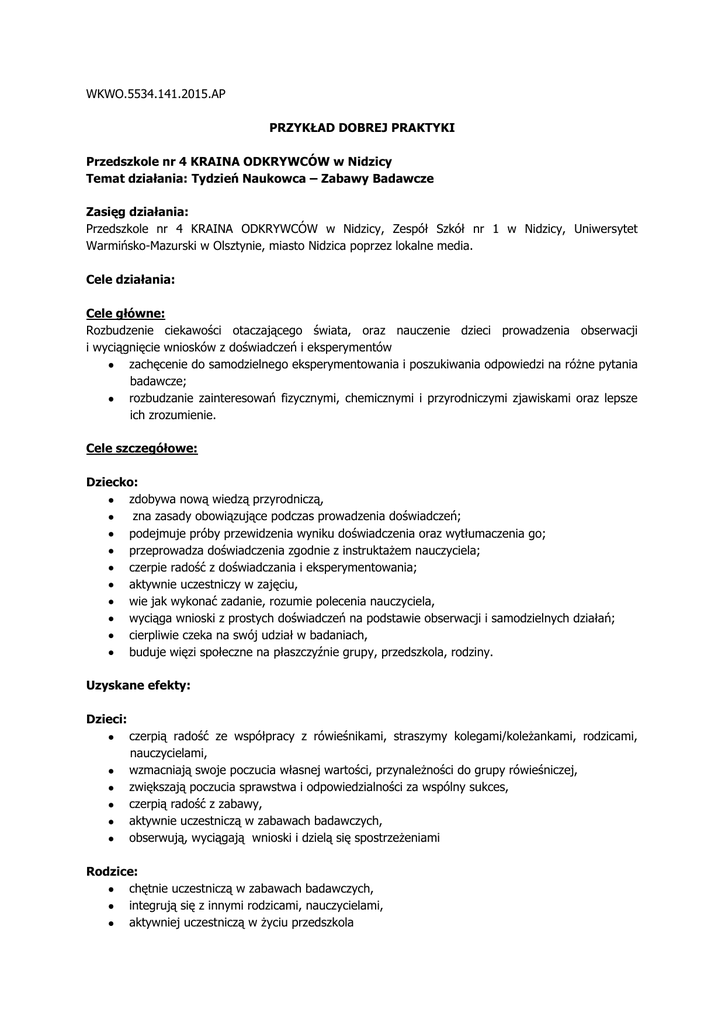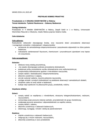WKWO.5534.141.2015.AP PRZYKŁAD DOBREJ PRAKTYKI Przedszkole nr 4 KRAINA ODKRYWCÓW w Nidzicy Temat działania: Tydzień Naukowca – Zabawy Badawcze Zasięg działania: Przedszkole nr 4 KRAINA ODKRYWCÓW w Nidzicy, Zespół Szkół nr 1 w Nidzicy, Uniwersytet Warmińsko-Mazurski w Olsztynie, miasto Nidzica poprzez lokalne media. Cele działania: Cele główne: Rozbudzenie ciekawości otaczającego świata, oraz nauczenie dzieci prowadzenia obserwacji i wyciągnięcie wniosków z doświadczeń i eksperymentów zachęcenie do samodzielnego eksperymentowania i poszukiwania odpowiedzi na różne pytania badawcze; rozbudzanie zainteresowań fizycznymi, chemicznymi i przyrodniczymi zjawiskami oraz lepsze ich zrozumienie. Cele szczegółowe: Dziecko: zdobywa nową wiedzą przyrodniczą, zna zasady obowiązujące podczas prowadzenia doświadczeń; podejmuje próby przewidzenia wyniku doświadczenia oraz wytłumaczenia go; przeprowadza doświadczenia zgodnie z instruktażem nauczyciela; czerpie radość z doświadczania i eksperymentowania; aktywnie uczestniczy w zajęciu, wie jak wykonać zadanie, rozumie polecenia nauczyciela, wyciąga wnioski z prostych doświadczeń na podstawie obserwacji i samodzielnych działań; cierpliwie czeka na swój udział w badaniach, buduje więzi społeczne na płaszczyźnie grupy, przedszkola, rodziny. Uzyskane efekty: Dzieci: czerpią radość ze współpracy z rówieśnikami, straszymy kolegami/koleżankami, rodzicami, nauczycielami, wzmacniają swoje poczucia własnej wartości, przynależności do grupy rówieśniczej, zwiększają poczucia sprawstwa i odpowiedzialności za wspólny sukces, czerpią radość z zabawy, aktywnie uczestniczą w zabawach badawczych, obserwują, wyciągają wnioski i dzielą się spostrzeżeniami Rodzice: chętnie uczestniczą w zabawach badawczych, integrują się z innymi rodzicami, nauczycielami, aktywniej uczestniczą w życiu przedszkola Nauczyciele: promują placówkę w środowisku lokalnym, nawiązują współpracę z innymi placówkami, angażują rodziców do aktywnego udziału w życiu przedszkola, rozbudzają zainteresowanie i zamiłowanie u dzieci do nauki Wnioski z realizacji: Dzięki zabawom badawczym dzieci rozwijają swoją aktywność poznawczą, czerpią radość z odkrywania. Wszelkie zabawy badawcze są organizowane w taki sposób, aby zachęcić dziecko do uczestnictwa w nich, a także pobudzić do myślenia. W Tygodniu Naukowca biorą udział wszystkie grupy wiekowe znajdujące się w przedszkolu. Jego realizacja umożliwia każdemu dziecku poszerzenie i pogłębienie wiadomości zgodnie z indywidualnymi możliwościami, przy wykorzystaniu różnorodnych środków, form i metod pracy. Straszaki co roku z niecierpliwością czekają na eksperymenty, które przynoszą im podekscytowanie i radość ze zdobytej wiedzy. Dla nas to wielki sukces jeśli chociaż część dzieci została zarażona zamiłowaniem i zainteresowaniem do nauki. Przedszkolaki nie tylko w trakcie tych kilku dni zdobywają nową wiedzą, ale również integrują się ze sobą, ze starszymi kolegami i koleżankami, a także z rodzicami. Strona WWW szkoły z prezentacją dobrej praktyki: http://www.przedszkole4.nidzica.pl/ - galeria wydarzeń (wydarzenia ogólnoprzedszkolne), rok szkolny 2014/2015, 2015/2016 https://www.facebook.com/przedszkole.wnidzicy?fref=ts Autorzy dobrej praktyki: Kadra pedagogiczna