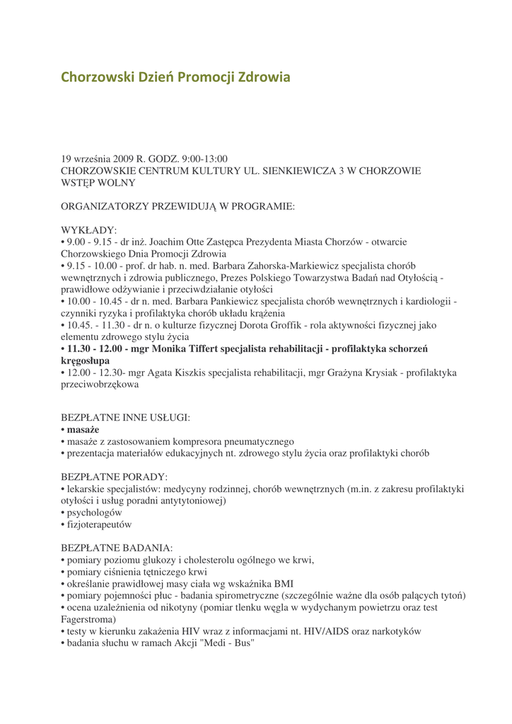 19 wrze nia 2009 R. GODZ. 9:00-13:00 CHORZOWSKIE CENTRUM KULTURY UL. SIENKIEWICZA 3 W CHORZOWIE WST P WOLNY ORGANIZATORZY PRZEWIDUJ W PROGRAMIE: WYKŁADY: • 9.00 - 9.15 - dr in . Joachim Otte Zast pca Prezydenta Miasta Chorzów - otwarcie Chorzowskiego Dnia Promocji Zdrowia • 9.15 - 10.00 - prof. dr hab. n. med. Barbara Zahorska-Markiewicz specjalista chorób wewn trznych i zdrowia publicznego, Prezes Polskiego Towarzystwa Bada nad Otyło ci prawidłowe od ywianie i przeciwdziałanie otyło ci • 10.00 - 10.45 - dr n. med. Barbara Pankiewicz specjalista chorób wewn trznych i kardiologii czynniki ryzyka i profilaktyka chorób układu kr enia • 10.45. - 11.30 - dr n. o kulturze fizycznej Dorota Groffik - rola aktywno ci fizycznej jako elementu zdrowego stylu ycia • 11.30 - 12.00 - mgr Monika Tiffert specjalista rehabilitacji - profilaktyka schorze kr gosłupa • 12.00 - 12.30- mgr Agata Kiszkis specjalista rehabilitacji, mgr Gra yna Krysiak - profilaktyka przeciwobrz kowa BEZPŁATNE INNE USŁUGI: • masa e • masa e z zastosowaniem kompresora pneumatycznego • prezentacja materiałów edukacyjnych nt. zdrowego stylu ycia oraz profilaktyki chorób BEZPŁATNE PORADY: • lekarskie specjalistów: medycyny rodzinnej, chorób wewn trznych (m.in. z zakresu profilaktyki otyło ci i usług poradni antytytoniowej) • psychologów • fizjoterapeutów BEZPŁATNE BADANIA: • pomiary poziomu glukozy i cholesterolu ogólnego we krwi, • pomiary ci nienia t tniczego krwi • okre lanie prawidłowej masy ciała wg wska nika BMI • pomiary pojemno ci płuc - badania spirometryczne (szczególnie wa ne dla osób pal cych tyto ) • ocena uzale nienia od nikotyny (pomiar tlenku w gla w wydychanym powietrzu oraz test Fagerstroma) • testy w kierunku zaka enia HIV wraz z informacjami nt. HIV/AIDS oraz narkotyków • badania słuchu w ramach Akcji "Medi - Bus" Centrum Synergia, NZOZ Przychodnia Lekarska "Przychodnia", NZOZ "Remedium", NZOZ "Nasza Poradnia", NZOZ "Energomonta - Chorzów", NZOZ "ADO - MED. 2", Przychodnia Lekarska Starochorzowskiej Fundacji Zdrowia i Ekologii, Novia Sp. zo.o., NZOZ ERA-MED., NZOZ w. Pawła 11 A, Powiatowa Stacja Sanitarno - Epidemiologiczna, , NSZOZ " Limf Med.", rodowiskowy Dom Samopomocy dla Osób z Zaburzeniami Zdrowia Psychicznego, "Medicus" Aparaty Słuchowe, SPZOZ Szpital Specjalistyczny. ródło: Urz d Miasta Chorzów