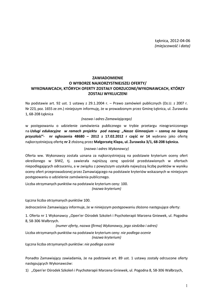 Łęknica, 2012-04-06 (miejscowość i data) ZAWIADOMIENIE O WYBORZE NAJKORZYSTNIEJSZEJ OFERTY/ WYKONAWCACH, KTÓRYCH OFERTY ZOSTAŁY ODRZUCONE/WYKONAWCACH, KTÓRZY ZOSTALI WYKLUCZENI Na podstawie art. 92 ust. 1 ustawy z 29.1.2004 r. – Prawo zamówień publicznych (Dz.U. z 2007 r. Nr 223, poz. 1655 ze zm.) niniejszym informuję, że w prowadzonym przez Gminę Łęknica, ul. Żurawska 1, 68-208 Łęknica (nazwa i adres Zamawiającego) w postępowaniu o udzielenie zamówienia publicznego w trybie przetargu nieograniczonego na Usługi edukacyjne w ramach projektu pod nazwą: „Nasze Gimnazjum – szansą na lepszą przyszłość”- nr ogłoszenia 48680 – 2012 z 17.02.2012 r część nr 14 wybrano jako ofertę najkorzystniejszą ofertę nr 2 złożoną przez Małgorzatę Klapa, ul. Żurawska 3/1, 68-208 Łęknica. (nazwa i adres Wykonawcy) Oferta ww. Wykonawcy została uznana za najkorzystniejszą na podstawie kryterium oceny ofert określonego w SIWZ, tj. zawierała najniższą cenę spośród przedstawionych w ofertach niepodlegających odrzuceniu, a w związku z powyższym uzyskała najwyższą liczbę punktów w wyniku oceny ofert przeprowadzonej przez Zamawiającego na podstawie kryteriów wskazanych w niniejszym postępowaniu o udzielenie zamówienia publicznego. Liczba otrzymanych punktów na podstawie kryterium ceny: 100. (nazwa kryterium) Łączna liczba otrzymanych punktów 100. Jednocześnie Zamawiający informuje, że w niniejszym postępowaniu złożono następujące oferty: 1. Oferta nr 1 Wykonawcy „Open’er Ośrodek Szkoleń i Psychoterapii Marzena Gniewek, ul. Pogodna 8, 58-306 Wałbrzych. (numer oferty, nazwa (firma) Wykonawcy, jego siedziba i adres) Liczba otrzymanych punktów na podstawie kryterium ceny: nie podlega ocenie (nazwa kryterium) Łączna liczba otrzymanych punktów: nie podlega ocenie Ponadto Zamawiający zawiadamia, że na podstawie art. 89 ust. 1 ustawy zostały odrzucone oferty następujących Wykonawców: 1) „Open’er Ośrodek Szkoleń i Psychoterapii Marzena Gniewek, ul. Pogodna 8, 58-306 Wałbrzych, 1 (numer oferty, nazwa (firma) Wykonawcy, jego siedziba i adres) Uzasadnienie prawne: Oferta Wykonawcy została odrzucona na mocy art. 89 ust. 1 pkt 1) i 8) w związku z art. 82 ust. 2 wymienionej ustawy. Uzasadnienie faktyczne: Wykonawca złożył ofertę w postępowaniu nie dochowując wymogu wynikającego z art. 82 ust. 2 ustawy Prawo zamówień publicznych (tekst jednolity: Dz. U. z 2010 r. Nr 113, poz. 759 ze zm.), polegającego na zachowaniu formy pisemnej. Wykonawca złożył bowiem formularz oferty nie opatrzony własnoręcznym podpisem. Znak graficzny umieszczony w miejscu przewidzianym na podpisanie oferty i parafowanie oferty jest skanem podpisu. Faksymile, które może być odciśnięte na dokumencie przez inną osobę jest jedynie kopią podpisu i nie spełnia warunku własnoręczności. Brak prawidłowego własnoręcznego podpisania oferty nie może być konwalidowany w postępowaniu o udzielenie zamówienia publicznego, skutkuje brakiem zachowania pisemnej formy oferty i powoduje konieczność odrzucenia oferty na podstawie art. 89 ust. 1 pkt 1 i 8. Zamawiający zawiadamia ponadto, że nie wykluczono z postępowania żadnego wykonawcy. Umowa w sprawie zamówienia publicznego może zostać zawarta zostać zawarta w terminie określonym w art. 94 ust. 1 pkt 2 ustawy Prawo zamówień publicznych (Dz.U. 2010 nr 113 poz. 759 z późn. zm.), to jest w po upływie 10 dni od dnia przesłania zawiadomienia o wyborze najkorzystniejszej oferty. Burmistrz Miasta Łęknicy Jan Bieniasz 2