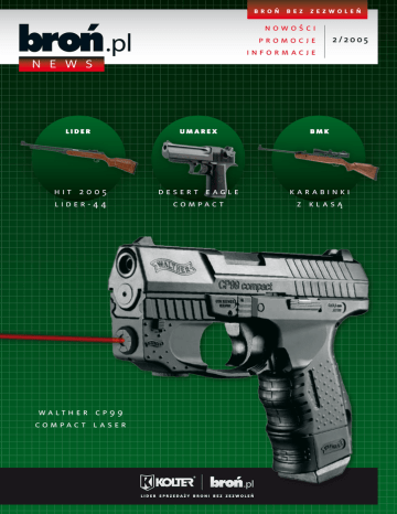 broń bez zezwoleń nowości promocje informacje n e w s 2/20 05 lider umare x bmk hit 2005 lider-44 desert eagle compact karabinki z klasą wa lther cp99 compact laser karabinki pneumatyczne | lider www.lider.bron.pl lider rynku – lider ceny y lider-3 z lufa gwintowana z prędkość początkowa: 230 m/sec z kaliber: 4,5 mm z długość: 1120 mm z długość lufy: 476 mm z waga: 2,8 kg z energia pocisku poniżej 17 J y lider-15 249 zł 179 zł z blokada zatrzasku lufy z zrzut napiętej sprężyny z kolba z baką policzkową oraz stopką z regulowane przyrządy celownicze w 500 szt. śrutu w zestaw tarcz nowa cena: 299 zł 249 zł z karabinek klasycznie łamany z regulowane przyrządy celownicze w pionie i w poziomie z bezpiecznik automatyczny z kolba buk, matowa z możliwość zamontowania lunety (szyna 11 mm) z idealny model dla młodych strzelców w komplecie: w 500 szt. śrutu w zestaw tarcz cena: nr. art. L06.0401 z lufa gwintowana z prędkość początkowa: 230 m/s z długość: 960 mm z długość lufy: 380 mm z waga: 3,25 kg z energia pocisku poniżej 17J y lider-12 y lider-31 349 zł 279 zł z stała lufa – boczny naciąg z zwalniacz dźwigni naciągu z regulowane przyrządy celownicze z bezpiecznik automatyczny z możliwość zamontowania lunety (szyna 11 mm) w komplecie: w 500 szt. śrutu w zestaw tarcz cena: 299 zł nr. art. L12.0401 z lufa gwintowana z prędkość początkowa: 230 m/s z długość: 1010 mm z długość lufy: 430 mm z waga: 2,6 kg z energia pocisku poniżej 17J z karabinek klasycznie łamany z regulowane przyrządy celownicze z bezpiecznik automatyczny z możliwość zamontowania lunety (szyna 11 mm) z kolba buk – monte carlo, matowa w komplecie: w 500 szt. śrutu w zestaw tarcz cena: nr. art. L31.0401 z lufa gwintowana, stała z prędkość początkowa: 230 m/s z długość: 900/663 mm, długość lufy: 470 mm z waga: 3,25 kg z kaliber: 4,5 mm z energia pocisku poniżej 17J w komplecie: (w pionie i poziomie) z możliwość zamontowania lunety (szyna 11 mm) nr. art. L15.0401 z lufa gwintowana z prędkość początkowa: 230 m/sec z długość: 930 mm z długość lufy: 370 mm z waga: 2,3 kg z kaliber: 4,5 mm z energia pocisku poniżej 17 J y lider-6 nowa cena: nr. art. L03.0401 299 zł z regulowana szczerbinka z bezpiecznik manualny z możliwość zamontowania lunety (szyna 11 mm) z replika karabinu bojowego AK-47 z boczny naciąg, składana, metalowa kolba w komplecie: w 500 szt. śrutu w zestaw tarcz zamówienia: tel. (0-34) 366-43-66 | adresy sklepów firmowych i patronackich na ostatniej stronie | www.bron.pl karabinki pneumatyczne | lider www.lider.bron.pl lider rynku – lider ceny y lider-44 Wielka Letnia promocja! nr. art. L44.0401 z lufa gwintowana z kaliber 4,5 lub 5,5 mm z waga: 3,3 kg z długość: 1050 mm, długość lufy: 455 mm z prędkość początkowa: 240 m/s z energia pocisku: poniżej 17 Jouli z regulowana szczerbinka (w pionie i poziomie) z możliwość zamontowania lunety (szyna 11 mm) z stała lufa – dolny naciąg sprężyny – zapewnia dużą celność oraz trwałość sprzętu regulowana muszka y lider-44 regulowana szczerbinka dolny naciąg sprężyny SET – zestaw promocyjny w komplecie: w 500 szt. śrutu w zestaw tarcz 299 zł cena: 199 zł szyna 11 mm pod lunetę baka policzkowa gumowa stopka uchwyty do paska 2 nr. art. L44.0402.Z 1 1 2 3 4 5 6 199 89 39 39 29 15 wiatrówka lider-44 luneta 4 x 20 kulochwyt + 20 tarcz pokrowiec zawieszka na śrut śrut 500 szt. wartość zł zł zł zł zł zł 410 zł teraz tylko 5 4 299 zł oszczędzasz: y lider w-38 nr. art. 2.0438 z pistolet pneumatyczny, sprężynowy 1-strzałowy z lufa gwintowana z korpus wzorowany na modelu Walther P38 cena: z prędkość pocz. 130 m/s z długość: 325 mm z waga: 1,1 kg z energia pocisku: < 17J z możliwość zamontowania celowników kolimatorowych 139 zł 3 cena zestawu: 6 110 zł y lider w-99 nr. art. 2.0499 z pistolet pneumatyczny, na modelu Walther P99 celowników kolimatorowych S-22 nr. art. 2.422 z pistolet pneumatyczny, sprężynowy 1-strzałowy z lufa gwintowana z korpus wzorowany z prędkość pocz. 130 m/s z długość: 325 mm z waga: 1,1 kg z energia pocisku: < 17J z możliwość zamontowania y lider sprężynowy 1-strzałowy cena: 139 zł z lufa gwintowana z drewniana rękojeść z prędkość pocz. 130 m/s z długość: 325 mm z waga: 1,1 kg z energia pocisku: < 17J z możliwość zamontowania cena: 139 zł celowników kolimatorowych zamówienia: tel. (0-34) 366-43-66 | adresy sklepów firmowych i patronackich na ostatniej stronie | www.bron.pl karabinki pneumatyczne | bmk www.bmk.bron.pl british mark – karabinki z klasą y bmk-11 329 zł z lufa gwintowana z prędkość początkowa: 240 m/sec z długość: 1050 mm z długość lufy: 440 mm z waga: 2,6 kg z kaliber: 4,5 mm z energia pocisku poniżej 17 J z karabinek klasycznie łamany y bmk-19 w 500 szt. śrutu w zestaw tarcz cena: 499 zł 399 zł z bezpiecznik manualny spustowy z klasycznie łamana lufa z energia pocisku poniżej 17J z możliwość zamontowania lunety (szyna 11 mm) w komplecie: w 500 szt. śrutu w zestaw tarcz cena: 599 zł z bezpiecznik automatyczny z karabinek klasycznie łamany z energia pocisku poniżej 17J z możliwość zamontowania lunety (szyna 11 mm) z zrzut napiętej sprężyny z dostępna również wersja z kolbą orzechową w komplecie: w 500 szt. śrutu w zestaw tarcz cena: 749 zł z karabinek z bocznym naciągiem z baka policzkowa niska z bezpiecznik automatyczny + dodatkowy naciągu z regulowane przyrządy celownicze w pionie i w poziomie z możliwość zamontowania lunety (szyna 11 mm) w komplecie: w 500 szt. śrutu w zestaw tarcz cena (bez lunety) nr. art. BMK.3045 z lufa gwintowana z prędkość początkowa: 280 m/s z długość całkowita: 1100 mm z długość lufy: 440 mm z waga: 4 kg z kaliber: 4,5 mm lub 5,5 mm z bezpiecznik automatyczny + dod. bezpiecznik naciągu w komplecie: nr. art. BMK.2145 z lufa gwintowana z prędkość początkowa: 280 m/
