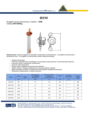HSM Wciągnik ręczny łańcuchowy z hakiem - HSM. Udźwig 500-5000kg. Zastosowanie: Idealny wciągnik do wszystkich zastosowań przemysłowych - szczególnie budownictwa i utrzymania ruchu - ze względu na wytrzymałą, zwartą i lekką konstrukcję. • • • • • • • • Solidna konstrukcja. Hamulec przeciążeniowy pozwalający na precyzyjne zatrzymywanie i przemieszczanie ładunku. Łańcuchy nośny i manewrowy ocynkowany. Łańcuch nośny hartowany. Płynna praca i dokładne pozycjonowanie ładunku. Szybki montaż i obsługa urządzenia za pomocą zwykłych narzędzi. Niska zabudowa pozwala na optymalne wykorzystanie dostępnej przestrzeni. Możliwość zintegrowania z wózkiem jezdnym. Model Udźwig Liczba cięgien kg Siła ciągnięcia przy obciążeniu nominalnym Masa przy standar. wysokości podnoszenia (3m) Wymiar A Wysokość podnoszenia daN kg mm mb HSM 500 500 1 25 8,6 260 HSM 1000 1.000 1 27 11,3 284 HSM 1500 1.500 1 30 16,3 400 HSM 2000 2.000 1 34 20,4 381 HSM 3000 3.000 1 38 30,0 435 HSM 5000 5.000 3 36 34,0 575 Zaznacz wybrany model