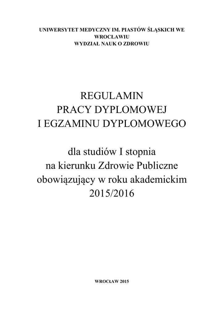 UNIWERSYTET MEDYCZNY IM. PIASTÓW ŚLĄSKICH WE WROCŁAWIU WYDZIAŁ NAUK O ZDROWIU REGULAMIN PRACY DYPLOMOWEJ I EGZAMINU DYPLOMOWEGO dla studiów I stopnia na kierunku Zdrowie Publiczne obowiązujący w roku akademickim 2015/2016 WROCŁAW 2015 § 1. Postanowienia ogólne 1. Użyte w niniejszym regulaminie pojęcia oznaczają: a. uczelnia – Uniwersytet Medyczny im. Piastów Śląskich we Wrocławiu, b. praca dyplomowa – praca pisemna studenta napisana zgodnie z zasadami określonymi w dalszej części niniejszego regulaminu, stanowiąca podstawę egzaminu dyplomowego, c. egzamin dyplomowy – egzamin teoretyczny, do którego student przystępuje po uzyskaniu absolutorium (tj. po uzyskaniu zaliczeń wszystkich przewidzianych programem studiów przedmiotów), stanowiący podstawę uzyskania dyplomu ukończenia wyższych studiów zawodowych (I stopnia), d. promotor – nauczyciel akademicki, posiadający co najmniej tytuł zawodowy magistra lub równorzędny, zatrudniony w jednostce organizacyjnej Uniwersytetu Medycznego we Wrocławiu, pod kierunkiem naukowym którego student przygotowuje pracę dyplomową, e. recenzent – nauczyciel akademicki, posiadający co najmniej stopień naukowy doktora, zatrudniony w jednostce organizacyjnej Uniwersytetu Medycznego we Wrocławiu, który przeprowadza recenzję pracy dyplomowej. f. abiturient – student, która uzyskał zaliczenia wszystkich przedmiotów objętych programem studiów I stopnia i został dopuszczony do egzaminu dyplomowego, g. absolwent – osoba, która po uzyskaniu zaliczeń wszystkich przedmiotów objętych programem studiów, zdała egzamin dyplomowy i uzyskała tytuł zawodowy licencjata. h. komisja egzaminacyjna – komisja składająca się co najmniej z 3 osób – nauczycieli akademickich zatrudnionych w jednostce organizacyjnej Uniwersytetu Medycznego we Wrocławiu - powołana przez Dziekana w celu przeprowadzenia egzaminu dyplomowego. 2. Do egzaminu dyplomowego dopuszczony może zostać wyłącznie abiturient, który: a. uzyskał zaliczenie ze wszystkich przedmiotów objętych programem studiów I stopnia na kierunku Zdrowie Publiczne, b. przed przeprowadzeniem recenzji i oceny promotora uzyskał dopuszczenie pracy do obrony, po przeprowadzeniu procedury sprawdzenia jej w systemie antyplagiatowym, o którym mowa w Zarządzeniu nr 48/XV R/2012 Rektora Akademii Medycznej we Wrocławiu z dnia 20 lipca 2012r. c. złożył w określonym przez Dziekana terminie zatwierdzoną przez promotora pracę dyplomową, d. nie zalega wobec uczelni z jakimikolwiek opłatami wynikającymi z odrębnych przepisów lub umów jakie zawarł w związku ze studiowaniem, e. uzyskał od promotora i recenzenta co najmniej ocenę dostateczną pracy dyplomowej. 3. Celem egzaminu dyplomowego jest potwierdzenie kompetencji abiturienta w obszarze wiedzy, umiejętności i postaw w zakresie określonym programem kształcenia na kierunku Zdrowie Publiczne I stopnia. 1 § 2. Praca dyplomowa 1. Praca dyplomowa jest pracą pisemną, będącą częścią egzaminu dyplomowego, której napisanie i obrona stanowi warunek ukończenia studiów I stopnia i uzyskania tytułu zawodowego licencjata. 2. Praca dyplomowa musi być przygotowana ze znajomością metodyki badań naukowych, zasad opracowywania wyników i wnioskowania naukowego. 3. Praca dyplomowa powinna spełniać warunki opisane w Instrukcji pisania prac dyplomowych na kierunku Zdrowia Publicznego I stopnia na Wydziale Nauk o Zdrowiu Uniwersytetu Medycznego we Wrocławiu, stanowiącej zał. nr 5 do niniejszego regulaminu. 4. Praca dyplomowa może mieć charakter: a. badawczy (empiryczny), b. projektowy (empiryczny lub teoretyczny), c. kazuistyczny (teoretyczny) d. stanowić studium przypadku 5. Za pracę dyplomową może być uznana praca powstała w ramach studenckiego ruchu naukowego. 6. W przypadku prac dyplomowych empirycznych, dotyczących badań z udziałem pacjentów, lub stanowiących część projektu będącego eksperymentem medycznym, promotor może polecić studentowi przed podjęciem badań uzyskanie pisemnej zgody Komisji Bioetyki przy Uniwersytecie Medycznym we Wrocławiu. 7. Student zobowiązany jest do wybrania promotora do dnia wyznaczonego przez Dziekana, jednak nie później niż do końca roku akademickiego poprzedzającego ostatni rok studiów I stopnia. 8. Nauczyciel akademicki ma prawo nie wyrazić zgody na przyjęcie obowiązków promotora pracy w szczególności w przypadku: a. podejmowania przez studenta tematyki pracy, która nie jest specjalnością naukową nauczyciela, b. braku możliwości sprawowania dostatecznej opieki naukowej nad studentem, c. przekroczenia dozwolonej odrębnymi przepisami liczby studentów, będących dotychczas pod opieką naukową nauczyciela. 9. Dziekan na podstawie umotywowanego i zaopiniowanego przez promotora wniosku studenta może wyrazić zgodę na zmianę promotora, jednak nie później niż do końca przedostatniego semestru studiów I stopnia. 10. Wobec braku postępów studenta w pisaniu pracy dyplomowej promotor ma prawo złożyć pisemną rezygnację z pełnienia funkcji promotora. Rezygnację taką może złożyć Dziekanowi nie później niż do końca przedostatniego semestru studiów I stopnia. 11. W sytuacji długotrwałej nieobecności promotora, która mogłaby wpłynąć na opóźnienie terminu ukończenia studiów, Dziekan jest zobowiązany do wyznaczenia innego promotora. 2 12. Na wniosek studenta, zaopiniowany przez promotora, Dziekan może wyrazić zgodę na napisanie pracy dyplomowej w języku obcym. Praca napisana w języku obcym musi zawierać tytuł i streszczenie w języku polskim. 13. Praca dyplomowa może być przygotowywana za zgodą Dziekana poza Uczelnią, tj. w innej uczelni, w tym zagranicznej, na podstawie podpisanych umów i porozumień z tymi uczelniami. 14. Temat pracy dyplomowej jest ustalany przez promotora w porozumieniu ze studentem najpóźniej przed rozpoczęciem ostatniego semestru studiów. W szczególnie