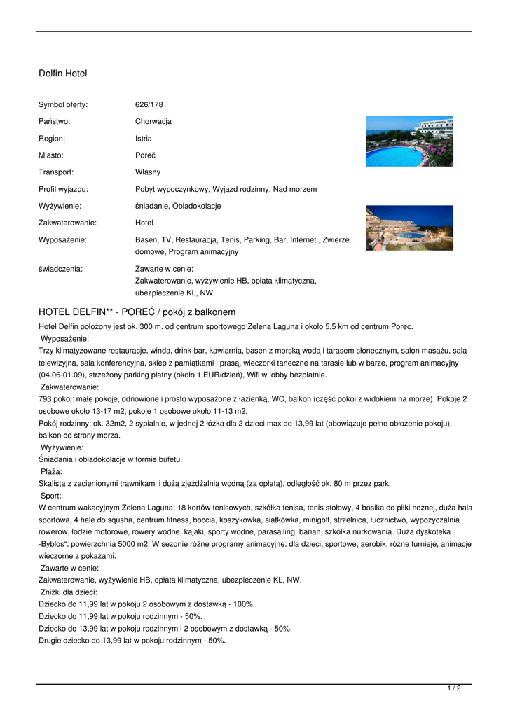 Delfin Hotel Symbol oferty: 626/178 Państwo: Chorwacja Region: Istria Miasto: Poreč Transport: Własny Profil wyjazdu: Pobyt wypoczynkowy, Wyjazd rodzinny, Nad morzem Wyżywienie: śniadanie, Obiadokolacje Zakwaterowanie: Hotel Wyposażenie: Basen, TV, Restauracja, Tenis, Parking, Bar, Internet , Zwierze świadczenia: Zawarte w cenie: domowe, Program animacyjny Zakwaterowanie, wyżywienie HB, opłata klimatyczna, ubezpieczenie KL, NW. HOTEL DELFIN** - POREĆ / pokój z balkonem Hotel Delfin położony jest ok. 300 m. od centrum sportowego Zelena Laguna i około 5,5 km od centrum Porec. Wyposażenie: Trzy klimatyzowane restauracje, winda, drink-bar, kawiarnia, basen z morską wodą i tarasem słonecznym, salon masażu, sala telewizyjna, sala konferencyjna, sklep z pamiątkami i prasą, wieczorki taneczne na tarasie lub w barze, program animacyjny (04.06-01.09), strzeżony parking płatny (około 1 EUR/dzień), Wifi w lobby bezpłatnie. Zakwaterowanie: 793 pokoi: małe pokoje, odnowione i prosto wyposażone z łazienką, WC, balkon (część pokoi z widokiem na morze). Pokoje 2 osobowe około 13-17 m2, pokoje 1 osobowe około 11-13 m2. Pokój rodzinny: ok. 32m2, 2 sypialnie, w jednej 2 łóżka dla 2 dzieci max do 13,99 lat (obowiązuje pełne obłożenie pokoju), balkon od strony morza. Wyżywienie: Śniadania i obiadokolacje w formie bufetu. Plaża: Skalista z zacienionymi trawnikami i dużą zjeżdżalnią wodną (za opłatą), odległość ok. 80 m przez park. Sport: W centrum wakacyjnym Zelena Laguna: 18 kortów tenisowych, szkółka tenisa, tenis stołowy, 4 bosika do piłki nożnej, duża hala sportowa, 4 hale do squsha, centrum fitness, boccia, koszykówka, siatkówka, minigolf, strzelnica, łucznictwo, wypożyczalnia rowerów, łodzie motorowe, rowery wodne, kajaki, sporty wodne, parasailing, banan, szkółka nurkowania. Duża dyskoteka -Byblos“: powierzchnia 5000 m2. W sezonie różne programy animacyjne: dla dzieci, sportowe, aerobik, różne turnieje, animacje wieczorne z pokazami. Zawarte w cenie: Zakwaterowanie, wyżywienie HB, opłata klimatyczna, ubezpieczenie KL, NW. Zniżki dla dzieci: Dziecko do 11,99 lat w pokoju 2 osobowym z dostawką - 100%. Dziecko do 11,99 lat w pokoju rodzinnym - 50%. Dziecko do 13,99 lat w pokoju rodzinnym i 2 osobowym z dostawką - 50%. Drugie dziecko do 13,99 lat w pokoju rodzinnym - 50%. 1/2 TERMINY: od: 2017-05-27 do: 2017-06-03 (8 dni), miejsca: zamów cena od: 1003 PLN = 242 EUR od: 2017-06-03 do: 2017-06-10 (8 dni), miejsca: zamów cena od: 1061 PLN = 256 EUR od: 2017-06-10 do: 2017-06-17 (8 dni), miejsca: zamów cena od: 1061 PLN = 256 EUR od: 2017-06-17 do: 2017-06-24 (8 dni), miejsca: zamów cena od: 1061 PLN = 256 EUR od: 2017-06-24 do: 2017-07-01 (8 dni), miejsca: zamów cena od: 1322 PLN = 319 EUR od: 2017-07-01 do: 2017-07-08 (8 dni), miejsca: zamów cena od: 1380 PLN = 333 EUR od: 2017-07-08 do: 2017-07-15 (8 dni), miejsca: zamów cena od: 1496 PLN = 361 EUR od: 2017-07-15 do: 2017-07-22 (8 dni), miejsca: zamów cena od: 1496 PLN = 361 EUR od: 2017-07-22 do: 2017-07-29 (8 dni), miejsca: zamów cena od: 1496 PLN = 361 EUR od: 2017-07-29 do: 2017-08-05 (8 dni), miejsca: zamów cena od: 1496 PLN = 361 EUR od: 2017-08-05 do: 2017-08-12 (8 dni), miejsca: zamów cena od: 1380 PLN = 333 EUR od: 2017-08-12 do: 2017-08-19 (8 dni), miejsca: zamów cena od: 1380 PLN = 333 EUR od: 2017-08-19 do: 2017-08-26 (8 dni), miejsca: zamów cena od: 1293 PLN = 312 EUR od: 2017-08-26 do: 2017-09-02 (8 dni), miejsca: zamów cena od: 1206 PLN = 291 EUR od: 2017-09-02 do: 2017-09-09 (8 dni), miejsca: zamów cena od: 1061 PLN = 256 EUR od: 2017-09-09 do: 2017-09-16 (8 dni), miejsca: zamów cena od: 1003 PLN = 242 EUR CENNIK: Długość pobytu: 8 dni 8 dni 8 dni 8 dni 8 dni 8 dni 8 dni 8 dni Grupa cenowa: F A E B H C D G 11 11 11 11 11 11 11 2.5 2.5 2.5 2.5 2.5 2.5 2.5 (-) (-) (-) (-) (-) Ubezpieczenie (obligatoryjne) (*) Ubezpieczenie KL, NW, SKI 11 (*) Turystyczny Fundusz Gwarancyjny 2.5 Pobyt w obiekcie (do wyboru) (*) Pok. 2 os. standardowo dla osób: 2 minimalnie: 1 maksymalnie: 3 (-) (-) (-) Rodzaj osoby (do wyboru) Dziecko 0-11 Dziecko 12-13 lat (*) Osoba dorosła (-) (-) (-) (-) (-) (-) (-) (-) 161 116 175 123 140 154 161 151 322 231 350 245 280 308 322 301 Waluta: EUR Aktualne ceny z systemu S.A.R.T. (-) - cena usługi, podatku kalkulowana przy osobie lub gratis (*) - kwota wliczona w cenę standardową 2/2