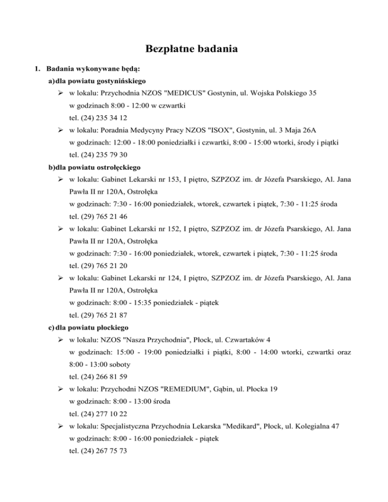 Bezpłatne badania 1. Badania wykonywane będą: a) dla powiatu gostynińskiego w lokalu: Przychodnia NZOS "MEDICUS" Gostynin, ul. Wojska Polskiego 35 w godzinach 8:00 - 12:00 w czwartki tel. (24) 235 34 12 w lokalu: Poradnia Medycyny Pracy NZOS "ISOX", Gostynin, ul. 3 Maja 26A w godzinach: 12:00 - 18:00 poniedziałki i czwartki, 8:00 - 15:00 wtorki, środy i piątki tel. (24) 235 79 30 b)dla powiatu ostrołęckiego w lokalu: Gabinet Lekarski nr 153, I piętro, SZPZOZ im. dr Józefa Psarskiego, Al. Jana Pawła II nr 120A, Ostrołęka w godzinach: 7:30 - 16:00 poniedziałek, wtorek, czwartek i piątek, 7:30 - 11:25 środa tel. (29) 765 21 46 w lokalu: Gabinet Lekarski nr 152, I piętro, SZPZOZ im. dr Józefa Psarskiego, Al. Jana Pawła II nr 120A, Ostrołęka w godzinach: 7:30 - 16:00 poniedziałek, wtorek, czwartek i piątek, 7:30 - 11:25 środa tel. (29) 765 21 20 w lokalu: Gabinet Lekarski nr 124, I piętro, SZPZOZ im. dr Józefa Psarskiego, Al. Jana Pawła II nr 120A, Ostrołęka w godzinach: 8:00 - 15:35 poniedziałek - piątek tel. (29) 765 21 87 c) dla powiatu płockiego w lokalu: NZOS "Nasza Przychodnia", Płock, ul. Czwartaków 4 w godzinach: 15:00 - 19:00 poniedziałki i piątki, 8:00 - 14:00 wtorki, czwartki oraz 8:00 - 13:00 soboty tel. (24) 266 81 59 w lokalu: Przychodni NZOS "REMEDIUM", Gąbin, ul. Płocka 19 w godzinach: 8:00 - 13:00 środa tel. (24) 277 10 22 w lokalu: Specjalistyczna Przychodnia Lekarska "Medikard", Płock, ul. Kolegialna 47 w godzinach: 8:00 - 16:00 poniedziałek - piątek tel. (24) 267 75 73 2. Osoby objęte badaniami będą rejestrowane w dni robocze: a) dla powiatu gostynińskiego w lokalu: Przychodnia NZOS "MEDICUS" Gostynin, ul. Wojska Polskiego 35 w godzinach: 8:00 - 18:00 pod numerem tel. (24) 235 34 12 w lokalu: Poradnia Medycyny Pracy NZOS "ISOX", Gostynin, ul. 3 Maja 26A w godzinach: 8:00 - 15:00 pod numerem tel. (24) 235 79 30 b) dla powiatu ostrołęckiego w lokalu: I piętro SZPZOZ im. dr Józefa Psarskiego, Al. Jana Pawła II nr 120A, Ostrołęka w godzinach: 7:30 - 15:05 pod numerem tel. (29) 765 21 23 c) dla powiatu płockiego w lokalu: NZOS "Nasza Przychodnia", Płock, ul. Czwartaków 4 w godzinach: 8:00 - 18:00 pod numerem tel. (24) 266 81 59 w lokalu: Przychodni NZOS "REMEDIUM", Gąbin, ul. Płocka 19 w godzinach: 8:00 - 18:00 pod numerem tel. (24) 277 10 22 w lokalu: Specjalistyczna Przychodnia Lekarska "Medikard", Płock, ul. Kolegialna 47 w godzinach: 8:00 - 18:00 pod numerem tel. (24) 267 75 73