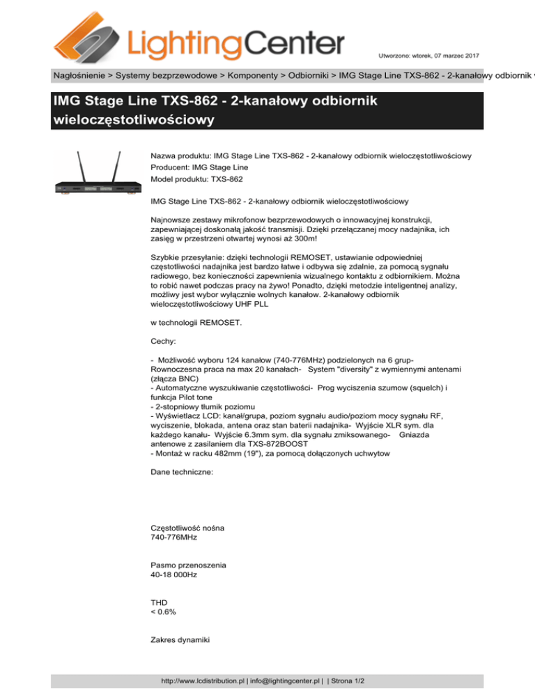 Utworzono: wtorek, 07 marzec 2017 Nagłośnienie > Systemy bezprzewodowe > Komponenty > Odbiorniki > IMG Stage Line TXS-862 - 2-kanałowy odbiornik w IMG Stage Line TXS-862 - 2-kanałowy odbiornik wieloczęstotliwościowy Nazwa produktu: IMG Stage Line TXS-862 - 2-kanałowy odbiornik wieloczęstotliwościowy Producent: IMG Stage Line Model produktu: TXS-862 IMG Stage Line TXS-862 - 2-kanałowy odbiornik wieloczęstotliwościowy Najnowsze zestawy mikrofonow bezprzewodowych o innowacyjnej konstrukcji, zapewniającej doskonałą jakość transmisji. Dzięki przełączanej mocy nadajnika, ich zasięg w przestrzeni otwartej wynosi aż 300m! Szybkie przesyłanie: dzięki technologii REMOSET, ustawianie odpowiedniej częstotliwości nadajnika jest bardzo łatwe i odbywa się zdalnie, za pomocą sygnału radiowego, bez konieczności zapewnienia wizualnego kontaktu z odbiornikiem. Można to robić nawet podczas pracy na żywo! Ponadto, dzięki metodzie inteligentnej analizy, możliwy jest wybor wyłącznie wolnych kanałow. 2-kanałowy odbiornik wieloczęstotliwościowy UHF PLL w technologii REMOSET. Cechy: - Możliwość wyboru 124 kanałow (740-776MHz) podzielonych na 6 grupRownoczesna praca na max 20 kanałach- System "diversity" z wymiennymi antenami (złącza BNC) - Automatyczne wyszukiwanie częstotliwości- Prog wyciszenia szumow (squelch) i funkcja Pilot tone - 2-stopniowy tłumik poziomu - Wyświetlacz LCD: kanał/grupa, poziom sygnału audio/poziom mocy sygnału RF, wyciszenie, blokada, antena oraz stan baterii nadajnika- Wyjście XLR sym. dla każdego kanału- Wyjście 6.3mm sym. dla sygnału zmiksowanego- Gniazda antenowe z zasilaniem dla TXS-872BOOST - Montaż w racku 482mm (19"), za pomocą dołączonych uchwytow Dane techniczne: Częstotliwość nośna 740-776MHz Pasmo przenoszenia 40-18 000Hz THD < 0.6% Zakres dynamiki http://www.lcdistribution.pl | [email protected] | | Strona 1/2 Utworzono: wtorek, 07 marzec 2017 Nagłośnienie > Systemy bezprzewodowe > Komponenty > Odbiorniki > IMG Stage Line TXS-862 - 2-kanałowy odbiornik w IMG Stage Line TXS-862 - 2-kanałowy odbiornik wieloczęstotliwościowy > 105dB Napięcie wyjściowe 100mV (XLR), 100mV (6.3mm) Połączenia XLR, sym., 6.3mm, sym. Zasilanie z doł. zasilacza Czas pracy - Wymiary 420x54x230mm Waga 2kg http://www.lcdistribution.pl | [email protected] | | Strona 2/2