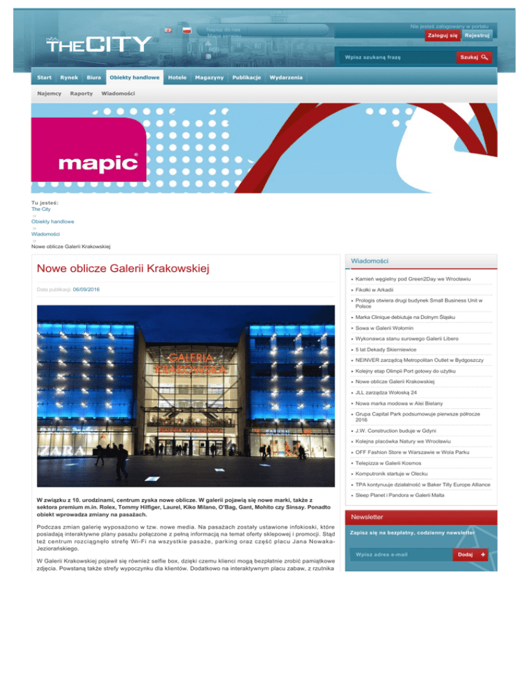 | Nie jesteś zalogowany w portalu Napisz do nas Mapa serwisu Zaloguj się Rejestruj RSS Start Rynek Najemcy Biura Raporty Obiekty handlowe Hotele Magazyny Wpisz szukaną frazę Publikacje Szukaj Wydarzenia Wiadomości Tu jesteś: The City Obiekty handlowe Wiadomości Nowe oblicze Galerii Krakowskiej Nowe oblicze Galerii Krakowskiej Wiadomości Kamień węgielny pod Green2Day we Wrocławiu Data publikacji: 06/09/2016 Fikołki w Arkadii Prologis otwiera drugi budynek Small Business Unit w Polsce Marka Clinique debiutuje na Dolnym Śląsku Sowa w Galerii Wołomin Wykonawca stanu surowego Galerii Libero 5 lat Dekady Skierniewice NEINVER zarządcą Metropolitan Outlet w Bydgoszczy Kolejny etap Olimpii Port gotowy do użytku Nowe oblicze Galerii Krakowskiej JLL zarządza Wołoską 24 Nowa marka modowa w Alei Bielany Grupa Capital Park podsumowuje pierwsze półrocze 2016 J.W. Construction buduje w Gdyni Kolejna placówka Natury we Wrocławiu OFF Fashion Store w Warszawie w Wola Parku Telepizza w Galerii Kosmos Komputronik startuje w Olecku TPA kontynuuje działalność w Baker Tilly Europe Alliance W związku z 10. urodzinami, centrum zyska nowe oblicze. W galerii pojawią się nowe marki, także z sektora premium m.in. Rolex, Tommy Hilfiger, Laurel, Kiko Milano, O’Bag, Gant, Mohito czy Sinsay. Ponadto obiekt wprowadza zmiany na pasażach. Podczas zmian galerię wyposażono w tzw. nowe media. Na pasażach zostały ustawione infokioski, które posiadają interaktywne plany pasażu połączone z pełną informacją na temat oferty sklepowej i promocji. Stąd też centrum rozciągnęło strefę Wi-Fi na wszystkie pasaże, parking oraz część placu Jana NowakaJeziorańskiego. Sleep Planet i Pandora w Galerii Malta Newsletter Zapisz się na bezpłatny, codzienny newsletter Wpisz adres e-mail W Galerii Krakowskiej pojawił się również selfie box, dzięki czemu klienci mogą bezpłatnie zrobić pamiątkowe zdjęcia. Powstaną także strefy wypoczynku dla klientów. Dodatkowo na interaktywnym placu zabaw, z rzutnika Dodaj wyświetlana będzie projekcja gier. Kraj: Poland Tagi: Laurel, O’Bag, Galeria Krakowska, Rolex, Tommy Hilfiger, Kiko Milano, Gant, Mohito, Sinsay Średnia ocena Na podobny temat Pasaż Grunwaldzki z nowymi najemcami SESTORE buduje dla Promod i L'Occitane Galeria Jastrzębie wynajęta w 100 proc. Rockcastle i Acteeum powierzają zarządzanie CBRE Budowa Galerii Wołomin za półmetkiem Piotr i Paweł wchodzi do Quick Parku KFC i Burger King dołączają do najemców Galerii Północnej biura CBRE CCC centra centrum handlowe Colliers International Cushman & Wakefield DTZ Echo handlowe Komentarze Zaloguj się aby móc dodawać nowe komentarze. Investment Gdańsk giełda GTC JLL Powrót do góry Jones Lang LaSalle Katowice Knight Kraków LPP Lublin magazyny mieszkania najemcy PKP Poznań Frank Raport Reserved Savills Skanska Szczecin przetarg The City O serwisie Regulamin Polityka prywatnościi Reklama www.wcentrum.pl Kontakt Property Media Group tel. +48 22 623 81 37 ul. Krzywickiego 34 tel. +48 22 622 09 31 02-078 Warszawa Formularz kontaktowy Copyright © 2011 - 2014 The City | All rights reserved | Polityka prywatności NIP 5213543170 REGON 142022595