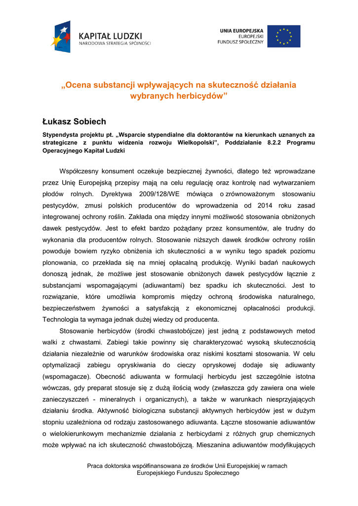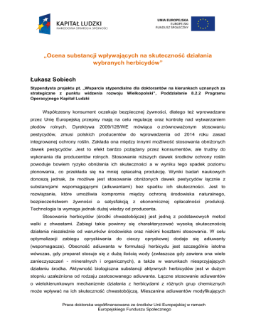 „Ocena substancji wpływających na skuteczność działania wybranych herbicydów” Łukasz Sobiech Stypendysta projektu pt. „Wsparcie stypendialne dla doktorantów na kierunkach uznanych za strategiczne z punktu widzenia rozwoju Wielkopolski”, Poddziałanie 8.2.2 Programu Operacyjnego Kapitał Ludzki Współczesny konsument oczekuje bezpiecznej żywności, dlatego też wprowadzane przez Unię Europejską przepisy mają na celu regulację oraz kontrolę nad wytwarzaniem płodów rolnych. Dyrektywa 2009/128/WE mówiąca o zrównoważonym stosowaniu pestycydów, zmusi polskich producentów do wprowadzenia od 2014 roku zasad integrowanej ochrony roślin. Zakłada ona między innymi możliwość stosowania obniżonych dawek pestycydów. Jest to efekt bardzo pożądany przez konsumentów, ale trudny do wykonania dla producentów rolnych. Stosowanie niższych dawek środków ochrony roślin powoduje bowiem ryzyko obniżenia ich skuteczności a w wyniku tego spadek poziomu plonowania, co przekłada się na mniej opłacalną produkcję. Wyniki badań naukowych donoszą jednak, że możliwe jest stosowanie obniżonych dawek pestycydów łącznie z substancjami wspomagającymi (adiuwantami) bez spadku ich skuteczności. Jest to rozwiązanie, które umożliwia kompromis między ochroną środowiska naturalnego, bezpieczeństwem żywności a satysfakcją z ekonomicznej opłacalności produkcji. Technologia ta wymaga jednak dużej wiedzy od producenta. Stosowanie herbicydów (środki chwastobójcze) jest jedną z podstawowych metod walki z chwastami. Zabiegi takie powinny się charakteryzować wysoką skutecznością działania niezależnie od warunków środowiska oraz niskimi kosztami stosowania. W celu optymalizacji zabiegu opryskiwania do cieczy opryskowej dodaje się adiuwanty (wspomagacze). Obecność adiuwanta w formulacji herbicydu jest szczególnie istotna wówczas, gdy preparat stosuje się z dużą ilością wody (zwłaszcza gdy zawiera ona wiele zanieczyszczeń - mineralnych i organicznych), a także w warunkach niesprzyjających działaniu środka. Aktywność biologiczna substancji aktywnych herbicydów jest w dużym stopniu uzależniona od rodzaju zastosowanego adiuwanta. Łączne stosowanie adiuwantów o wielokierunkowym mechanizmie działania z herbicydami z różnych grup chemicznych może wpływać na ich skuteczność chwastobójczą. Mieszanina adiuwantów modyfikujących Praca doktorska współfinansowana ze środków Unii Europejskiej w ramach Europejskiego Funduszu Społecznego (siarczan amonu, fosforan potasu, kwas cytrynowy) z odpowiednio dobranym surfaktantem lub olejem wykazuje często oddziaływanie synergistyczne i pozwala na znaczne obniżenie dawki herbicydu bez ograniczenia jego skuteczności chwastobójczej. Korzystając z wyników badań i analiz przeprowadzonych w trakcie realizacji pracy doktorskiej, chciałbym wprowadzić innowacyjną technologię stosowania adiuwantów w praktyce rolniczej, mającą na celu optymalizację stosowania pestycydów. Jej celem jest obniżenie dawek pestycydów co przekłada się na ograniczoną ilość wprowadzanych substancji aktywnych do środowiska naturalnego. Ponad to badania zakładają: - optymalizację dawek herbicydów stosowanych do regulacji zachwaszczenia roślin uprawnych; - obniżenie dawki herbicydu przy zachowaniu odpowiednich parametrów cieczy (napięcie powierzchniowe oraz kąt przylegania cieczy opryskowej) i uzyskanie podobnej skuteczności jak w przypadku zastosowania pełnej dawki; - ocenę substancji, które mogą wpływać na modyfikacje cieczy opryskowej i w ten sposób podnosić skuteczność chwastobójczą herbicydów. Zdobyta wiedza na temat syntezy adiuwantów w połączeniu z odpowiednim doborem wspomagacza do właściwego pestycydu może zostać wykorzystana do opracowania bardziej efektywnych adiuwantów, które w przyszłości mogą zostać opatentowane i w ten sposób wdrożone bezpośrednio do praktyki podnosząc innowacyjność regionu jakim jest Wielkopolska. Praca doktorska współfinansowana ze środków Unii Europejskiej w ramach Europejskiego Funduszu Społecznego