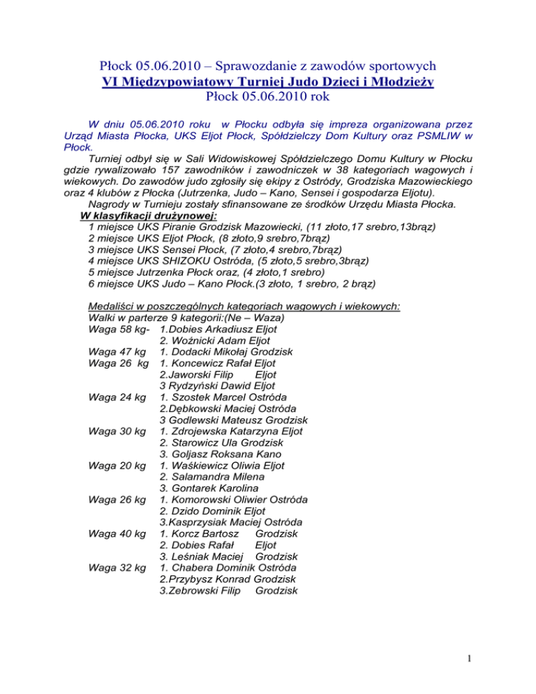 Płock 05.06.2010 – Sprawozdanie z zawodów sportowych VI Międzypowiatowy Turniej Judo Dzieci i MłodzieŜy Płock 05.06.2010 rok W dniu 05.06.2010 roku w Płocku odbyła się impreza organizowana przez Urząd Miasta Płocka, UKS Eljot Płock, Spółdzielczy Dom Kultury oraz PSMLIW w Płock. Turniej odbył się w Sali Widowiskowej Spółdzielczego Domu Kultury w Płocku gdzie rywalizowało 157 zawodników i zawodniczek w 38 kategoriach wagowych i wiekowych. Do zawodów judo zgłosiły się ekipy z Ostródy, Grodziska Mazowieckiego oraz 4 klubów z Płocka (Jutrzenka, Judo – Kano, Sensei i gospodarza Eljotu). Nagrody w Turnieju zostały sfinansowane ze środków Urzędu Miasta Płocka. W klasyfikacji druŜynowej: 1 miejsce UKS Piranie Grodzisk Mazowiecki, (11 złoto,17 srebro,13brąz) 2 miejsce UKS Eljot Płock, (8 złoto,9 srebro,7brąz) 3 miejsce UKS Sensei Płock, (7 złoto,4 srebro,7brąz) 4 miejsce UKS SHIZOKU Ostróda, (5 złoto,5 srebro,3brąz) 5 miejsce Jutrzenka Płock oraz, (4 złoto,1 srebro) 6 miejsce UKS Judo – Kano Płock.(3 złoto, 1 srebro, 2 brąz) Medaliści w poszczególnych kategoriach wagowych i wiekowych: Walki w parterze 9 kategorii:(Ne – Waza) Waga 58 kg- 1.Dobies Arkadiusz Eljot 2. Woźnicki Adam Eljot Waga 47 kg 1. Dodacki Mikołaj Grodzisk Waga 26 kg 1. Koncewicz Rafał Eljot 2.Jaworski Filip Eljot 3 Rydzyński Dawid Eljot Waga 24 kg 1. Szostek Marcel Ostróda 2.Dębkowski Maciej Ostróda 3 Godlewski Mateusz Grodzisk Waga 30 kg 1. Zdrojewska Katarzyna Eljot 2. Starowicz Ula Grodzisk 3. Goljasz Roksana Kano Waga 20 kg 1. Waśkiewicz Oliwia Eljot 2. Salamandra Milena 3. Gontarek Karolina Waga 26 kg 1. Komorowski Oliwier Ostróda 2. Dzido Dominik Eljot 3.Kasprzysiak Maciej Ostróda Waga 40 kg 1. Korcz Bartosz Grodzisk 2. Dobies Rafał Eljot 3. Leśniak Maciej Grodzisk Waga 32 kg 1. Chabera Dominik Ostróda 2.Przybysz Konrad Grodzisk 3.Zebrowski Filip Grodzisk 1 Walki w stójce 29 kategorii:(Tachi – Waza) MEDALIŚCI Waga 29 kg 1. Ciechomska Karina - Jutrzenka 2. Kacalińska Zuzanna - Grodzisk 3.Stachlewska Agata – Grodzisk Waga 50 kg 1. KrzyŜak Julia Grodzisk 2.Dzięcioł Ola Grodzisk Waga 33 kg 1. Morawski Bogdan Sensei 2.Rączkowski Michał Eljot 3.Przybysz Kamil Grodzisk Waga 35 kg 1. Petrykowski Dawid Jutrzenka 2.Boś Bartek Grodzisk 3.Brzeźiński Alan Ostróda Waga 41 kg 1. Kubicka Olga Grodzisk 2.Bakłarzec Justyna Grodzisk Waga 32 kg 1.Giersz AndŜelika Kano 2.Filipek Marika Ostróda 3.Nowaczyk Gabrysia Eljot Waga +66 kg 1. Sitkiewicz Radosław Sensei 2.Głowacki Tomasz Ostróda 3.Dobies Seweryn Eljot Waga 40 kg 1. Jasiński Norman Sensei 2.Stachlewski Daniel Grodzisk 3.Makarewicz Paweł Kano Waga 26 kg 1. Abramowicz Jan Grodzisk 2.Gostomski Krystian Sensei 3.Jezierski Bartosz Sensei Waga 40 kg 1.GołębiewskiAdam Jutrzenka 2.Strzemieczny Kamil Grodzisk Sensei 3.Gęsiarz Maciej Waga 30 kg 1. Sucharski Konrad Grodzisk 2.Kustosik Jan Eljot 3.Brzeźinka Paweł Grodzisk Waga 27 kg 1. Bieńkowski Łukasz Grodzisk 2.Zieliński Kuba Eljot 3.Kacaliński Kuba Grodzisk Waga 33 kg 1.Adamczyk Adam Sensei 2.Kapusta Kasia Grodzisk 3.Patanowska Sandra Grodzisk Waga 31 kg 1. Kozłowska Jagoda Grodzisk 2. Czerniak Natalia Eljot Waga 51 kg 1. Wojdyniak Piotr Eljot 2.Kowalczyk Michał Grodzisk 3.Miszczak Jakub Eljot Waga 33 kg 1. Patanowski Sebastian Grodzisk 2.Wypysiński Tomasz Sensei 3.Morawski Adam Sensei Waga 37 kg 1. Adamczyk Damian Sensei 2.Wangin Michał Grodzisk Ostróda 3.Śliwkowski Olaf 2 Waga 40 kg 1. Spychała Bartek Ostróda 2.Borek Marcin Grodzisk 3.Dulęba Piotr Eljot Waga 44 kg 1. Petrosan Gewor Kano 2.Sawka Kuba Grodzisk 3.Kłys Mateusz Sensei Waga77 kg 1. Stachula Dawid Eljot 2.Broda Jakub Jutrzenka Waga 54 kg 1. Bogiel Emil Sensei 2.Sikorski Kacper Sensei 3.Zieliński Mateusz Eljot Waga 45 kg 1.Rućkowska Klaudia Ostróda 2.Szudzińska Martyna Ostróda 3.Niedzińska Agata Grodzisk Waga 66 kg 1. Kustosik Konrad Eljot 2.Bogucki Kacper Grodzisk 3.Miedziński Mateusz Grodzisk Waga 62 kg 1. Pochodaj Ilona Kano 2.Ojrzyńska Alina Grodzisk 3.Kowalska śaneta Sensei Waga 61 kg 1. Duda Piotr Eljot 2.Brodowski Wojciech Sensei 3.Wydra Paweł Sensei Waga +70 kg 1. Balcerak Przemek Jutrzenka 2.Leśnikowski Adrian Ostróda 3.Ropniak Magdalena Grodzisk Waga 68 kg 1.Wasiak Łukasz Grodzisk 2.Nanartowicz Piotr Kano 3.Grabowski Paweł Grodzisk Waga 49 kg 1. Wachowicz Dawid Sensei 2.Rudolf Rafał Grodzisk 3.Strzelecki Patryk Sensei Waga 60 kg 1. Czupryński Mateusz Grodzisk 2.Pora Patryk Grodzisk 3.Czupryński Kamil Grodzisk Wszyscy uczestnicy Turnieju judo otrzymali upominki i słodycze oraz medaliści w poszczególnych kategoriach wagowych i wiekowych nagrody rzeczowe w postaci breloków, statuetek i długopisów, koszulki, czapeczki i smycze. Ponadto wszystkie osoby, które zajęły miejsca 1 – 3 otrzymały dyplomy i medale okolicznościowe(złote, srebrne i brązowe). W klasyfikacji DruŜynowej Puchary otrzymali: Grodzisk Mazowiecki – Puchar Prezesa PSMLIW w Płocku Eljot Płock – Puchar Prezydenta Miasta Płock Sensei Płock – Puchar Kierownik Zespołu Społeczne Kulturalnego SDK Puchary i medale wręczali: Pani Jagoda Marek – Z- ca kierownika SDK PSMLIW, Pan Stanisław Kacprzycki – Przewodniczący Komisji Odznaczeń PZ Judo- trener Judo 6Dan. Pan Tomasz Korpowski – instruktor judo UKS Eljot Płock – 2 dan. Kierownikiem zawodów był Leszek Januszewski, sedzią głównym Andrzej Berner. 3