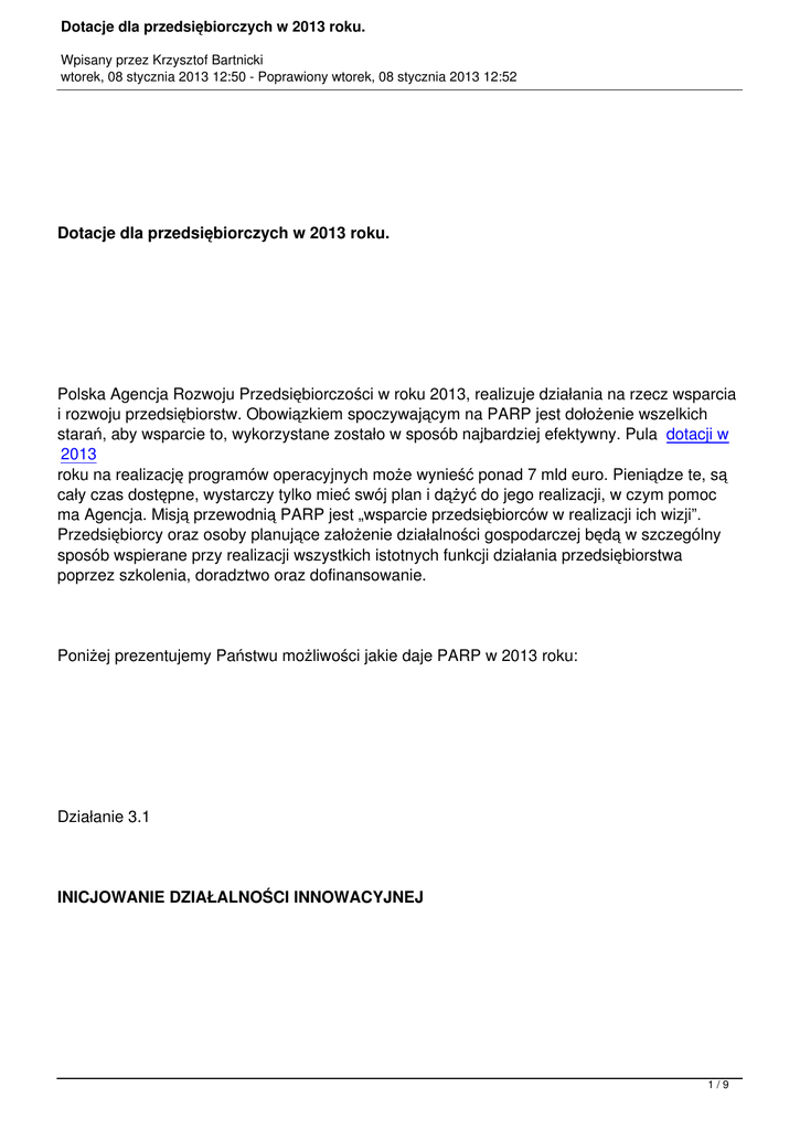 Dotacje dla przedsiębiorczych w 2013 roku. Wpisany przez Krzysztof Bartnicki wtorek, 08 stycznia 2013 12:50 - Poprawiony wtorek, 08 stycznia 2013 12:52 Dotacje dla przedsiębiorczych w 2013 roku. Polska Agencja Rozwoju Przedsiębiorczości w roku 2013, realizuje działania na rzecz wsparcia i rozwoju przedsiębiorstw. Obowiązkiem spoczywającym na PARP jest dołożenie wszelkich starań, aby wsparcie to, wykorzystane zostało w sposób najbardziej efektywny. Pula dotacji w 2013 roku na realizację programów operacyjnych może wynieść ponad 7 mld euro. Pieniądze te, są cały czas dostępne, wystarczy tylko mieć swój plan i dążyć do jego realizacji, w czym pomoc ma Agencja. Misją przewodnią PARP jest „wsparcie przedsiębiorców w realizacji ich wizji”. Przedsiębiorcy oraz osoby planujące założenie działalności gospodarczej będą w szczególny sposób wspierane przy realizacji wszystkich istotnych funkcji działania przedsiębiorstwa poprzez szkolenia, doradztwo oraz dofinansowanie. Poniżej prezentujemy Państwu możliwości jakie daje PARP w 2013 roku: Działanie 3.1 INICJOWANIE DZIAŁALNOŚCI INNOWACYJNEJ 1/9 Dotacje dla przedsiębiorczych w 2013 roku. Wpisany przez Krzysztof Bartnicki wtorek, 08 stycznia 2013 12:50 - Poprawiony wtorek, 08 stycznia 2013 12:52 O dotacje mogą się ubiegać: nowo powstali przedsiębiorcy oraz Instytucje wspierające powstawanie nowych firm innowacyjnych np. inkubatory przedsiębiorczości akademickiej, c entra transferu technologii i innowacji, akceleratory technologii, parki naukowo-technologiczne Dotacja przeznaczona jest na: - inkubację oraz na inwestycję w nowo utworzone przedsiębiorstwo innowacyjne. Działanie obejmuje również wybór w drodze konkursu podmiotów, które będą świadczyły usługę dwuetapowego wsparcia przedsiębiorców lub kandydatów na przedsiębiorców. Podmioty te, dokonują klasyfikacji najlepszych projektów składanych przez potencjalnych przedsiębiorców. Dofinansowanie składa się z dwóch składników tj. – dotacji na inkubację; – inwestycję w nowo utworzone przedsiębiorstwo (w formie objęcia udziałów); Uzyskanie dotacji możliwe jest w przypadku przedsiębiorstwa, którego działalność jest oparta na innowacyjnym pomyśle. 2/9 Dotacje dla przedsiębiorczych w 2013 roku. Wpisany przez Krzysztof Bartnicki wtorek, 08 stycznia 2013 12:50 - Poprawiony wtorek, 08 stycznia 2013 12:52 Działanie 4. 4 NOWE INWESTYCJE O WYSOKIM POTENCJALE INNOWACYJNYM O dotacje mogą się ubiegać: przedsiębiorcy z sektora MSP. Działanie skierowane jest na: - projekty inwestycyjne związane z zastosowaniem nowych rozwiązań technologicznych produktowych, usługowych lub organizacyjnych (rozwiązania technologiczne i organizacyjne stosowane na świecie nie dłużej niż 3 lata); - tworzenie nowych miejsc pracy związanych z nowymi inwestycjami; - projekty szkoleniowe oraz doradcze niezbędne dla realizacji projektów inwestycyjnych. Zgodność projektów zgłoszonych do dofinansowania będzie weryfikowana z regulacjami unijnymi na etapie oceny wniosków. W przypadku wątpliwości będzie możliwe uzupełnienie dokumentacji przez wnioskodawców. 3/9 Dotacje dla przedsiębiorczych w 2013 roku. Wpisany przez Krzysztof Bartnicki wtorek, 08 stycznia 2013 12:50 - Poprawiony wtorek, 08 stycznia 2013 12:52 Działanie 5. 1 WSPIERANIE POWIĄZAŃ KOOPERACYJNYCH O ZNACZENIU PONADREGIONALNYM O dotacje mogą się ubiegać: grupy przedsiębiorców oraz instytucje otoczenia biznesu. Działanie skierowane jest na: - wspólne przedsięwzięcia grup przedsiębiorców projektów doradczych, szkoleniowych i inwestycyjnych w zakresie: - tworzenia oraz zarządzania strukturą organizacyjną powiązania kooperacyjnego, - przygotowania wspólnych planów rozwoju powiązań kooperacyjnych, - wspólnych inwestycji grup przedsiębiorców, - inwestycji realizowanych przez kooperujących przedsiębiorców niezbędnych dla funkcjonowania i rozwoju powiązania działań marketingowych powiązań kooperacyjnych. Działanie 5. 2 4/9 Dotacje dla przedsiębiorczych w 2013 roku. Wpisany przez Krzysztof Bartnicki wtorek, 08 stycznia 2013 12:50 - Poprawiony wtorek, 08 stycznia 2013 12:52 WSPIERANIE INSTYTUCJI OTOCZENIA BIZNESU ŚWIADCZĄCYCH USŁUGI PROINNOWACYJNE ORAZ ICH SIECI O ZNACZENIU PONADREGIONALNYM W ramach działania, o dotacje mogą ubiegać się: instytucje otoczenia biznesu/sieci instytucji otoczenia biznesu. Działanie skierowane jest na: - wzmocnienie instytucji otoczenia biznesu (IOB)/sieci instytucji otoczenia biznesu (IOB) poprzez: - promowanie współpracy w ramach sieci, - wymiany doświadczeń, - wspólnej obsługi klientów, - rozwój oferty usług o charakterze proinnowacyjnym. W ramach działania udzielane będzie wsparcie z przeznaczeniem na dofinansowanie przygotowania i rozwoju pakietu usług o charakterze proinnowacyjnym (składającego się z usług doradczych, szkoleniowych, informacyjnych oraz sieciowe/poszukiwania partnera) służących podniesieniu innowacyjności przedsiębiorstw działających na terenie Polski, dofinansowanie kosztów świadczenia wybranych usług dla przedsiębiorców oraz wspólnych przedsięwzięć podejmowanych przez instytucje skupione w sieciach, a także dofinansowanie funkcjonowania jednostki koordynującej działalność sieci (o charakterze sekretariatu sieci). Poddziałanie 5. 4. 1 5/9 Dotacje dla przedsiębiorczych w 2013 roku. Wpisany przez Krzysztof Bartnicki wtorek, 08 stycznia 2013 12:50 - Poprawiony wtorek, 08 stycznia 2013 12:52 WSPARCIE NA UZYSKANIE/REALIZACJĘ OCHRONY WŁASNOŚĆI PRZEMYSOWEJ W ramach poddziałania, dotacje mogą ubiegać się: mikro, mali i średni przedsiębiorcy. Poddziałanie skierowane jest na projekty mające na celu: - wykorzystywanie możliwości ochrony przedmiotów własności przemysłowej (wynalazków, wzorów użytkowych oraz wzorów przemysłowych), szczególnie poza granicami kraju. Refundacja wydatków poniesionych na przygotowanie dokum