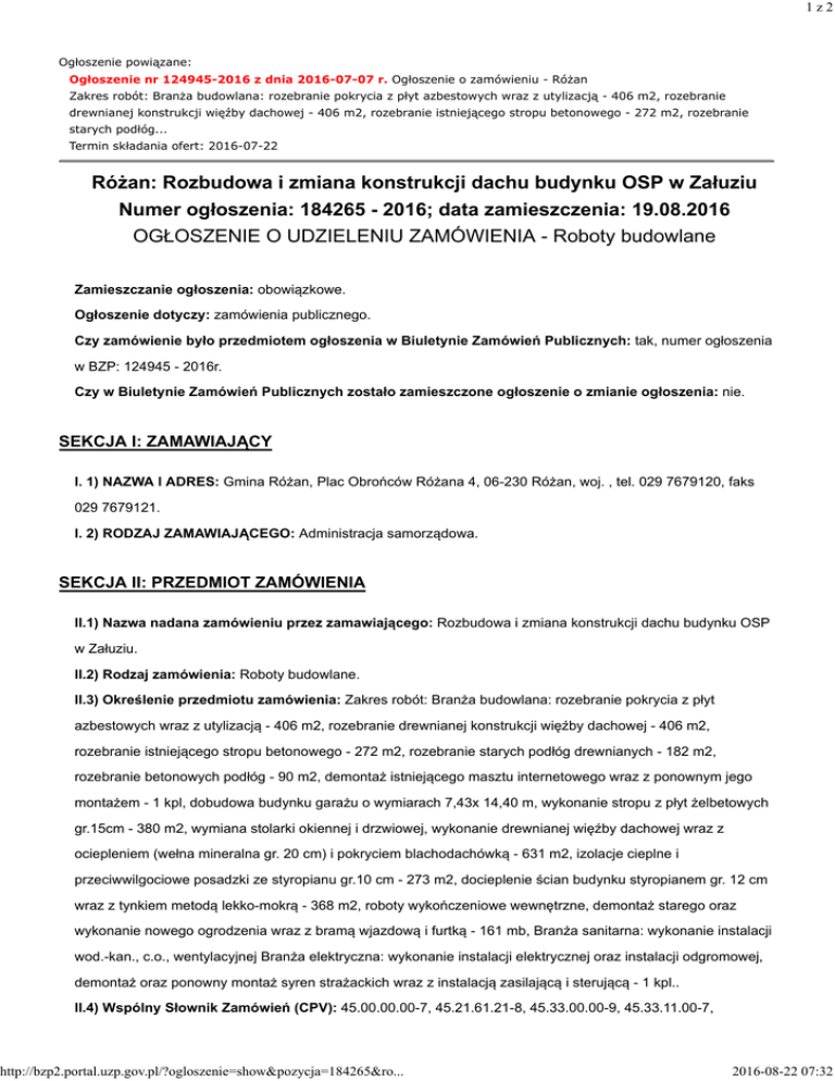 1z2 Ogłoszenie powiązane: Ogłoszenie nr 124945-2016 z dnia 2016-07-07 r. Ogłoszenie o zamówieniu - Różan Zakres robót: Branża budowlana: rozebranie pokrycia z płyt azbestowych wraz z utylizacją - 406 m2, rozebranie drewnianej konstrukcji więźby dachowej - 406 m2, rozebranie istniejącego stropu betonowego - 272 m2, rozebranie starych podłóg... Termin składania ofert: 2016-07-22 Różan: Rozbudowa i zmiana konstrukcji dachu budynku OSP w Załuziu Numer ogłoszenia: 184265 - 2016; data zamieszczenia: 19.08.2016 OGŁOSZENIE O UDZIELENIU ZAMÓWIENIA - Roboty budowlane Zamieszczanie ogłoszenia: obowiązkowe. Ogłoszenie dotyczy: zamówienia publicznego. Czy zamówienie było przedmiotem ogłoszenia w Biuletynie Zamówień Publicznych: tak, numer ogłoszenia w BZP: 124945 - 2016r. Czy w Biuletynie Zamówień Publicznych zostało zamieszczone ogłoszenie o zmianie ogłoszenia: nie. SEKCJA I: ZAMAWIAJĄCY I. 1) NAZWA I ADRES: Gmina Różan, Plac Obrońców Różana 4, 06-230 Różan, woj. , tel. 029 7679120, faks 029 7679121. I. 2) RODZAJ ZAMAWIAJĄCEGO: Administracja samorządowa. SEKCJA II: PRZEDMIOT ZAMÓWIENIA II.1) Nazwa nadana zamówieniu przez zamawiającego: Rozbudowa i zmiana konstrukcji dachu budynku OSP w Załuziu. II.2) Rodzaj zamówienia: Roboty budowlane. II.3) Określenie przedmiotu zamówienia: Zakres robót: Branża budowlana: rozebranie pokrycia z płyt azbestowych wraz z utylizacją - 406 m2, rozebranie drewnianej konstrukcji więźby dachowej - 406 m2, rozebranie istniejącego stropu betonowego - 272 m2, rozebranie starych podłóg drewnianych - 182 m2, rozebranie betonowych podłóg - 90 m2, demontaż istniejącego masztu internetowego wraz z ponownym jego montażem - 1 kpl, dobudowa budynku garażu o wymiarach 7,43x 14,40 m, wykonanie stropu z płyt żelbetowych gr.15cm - 380 m2, wymiana stolarki okiennej i drzwiowej, wykonanie drewnianej więźby dachowej wraz z ociepleniem (wełna mineralna gr. 20 cm) i pokryciem blachodachówką - 631 m2, izolacje cieplne i przeciwwilgociowe posadzki ze styropianu gr.10 cm - 273 m2, docieplenie ścian budynku styropianem gr. 12 cm wraz z tynkiem metodą lekko-mokrą - 368 m2, roboty wykończeniowe wewnętrzne, demontaż starego oraz wykonanie nowego ogrodzenia wraz z bramą wjazdową i furtką - 161 mb, Branża sanitarna: wykonanie instalacji wod.-kan., c.o., wentylacyjnej Branża elektryczna: wykonanie instalacji elektrycznej oraz instalacji odgromowej, demontaż oraz ponowny montaż syren strażackich wraz z instalacją zasilającą i sterującą - 1 kpl.. II.4) Wspólny Słownik Zamówień (CPV): 45.00.00.00-7, 45.21.61.21-8, 45.33.00.00-9, 45.33.11.00-7, http://bzp2.portal.uzp.gov.pl/?ogloszenie=show&pozycja=184265&ro... 2016-08-22 07:32 2z2 45.31.00.00-3. SEKCJA III: PROCEDURA III.1) TRYB UDZIELENIA ZAMÓWIENIA: Przetarg nieograniczony III.2) INFORMACJE ADMINISTRACYJNE Zamówienie dotyczy projektu/programu finansowanego ze środków Unii Europejskiej: nie SEKCJA IV: UDZIELENIE ZAMÓWIENIA IV.1) DATA UDZIELENIA ZAMÓWIENIA: 18.08.2016. IV.2) LICZBA OTRZYMANYCH OFERT: 5. IV.3) LICZBA ODRZUCONYCH OFERT: 0. IV.4) NAZWA I ADRES WYKONAWCY, KTÓREMU UDZIELONO ZAMÓWIENIA: Firma Budowlano-Handlowa EXPOL-WZ Sp.j J. Wydryszek, Z. Żebrowski, ul. Złotopolska 1/9, 03-567 Warszawa, kraj/woj. mazowieckie. IV.5) Szacunkowa wartość zamówienia (bez VAT): 739651,74 PLN. IV.6) INFORMACJA O CENIE WYBRANEJ OFERTY ORAZ O OFERTACH Z NAJNIŻSZĄ I NAJWYŻSZĄ CENĄ Cena wybranej oferty: 891677,21 Oferta z najniższą ceną: 891677,21 / Oferta z najwyższą ceną: 1000297,74 Waluta: PLN . http://bzp2.portal.uzp.gov.pl/?ogloszenie=show&pozycja=184265&ro... 2016-08-22 07:32