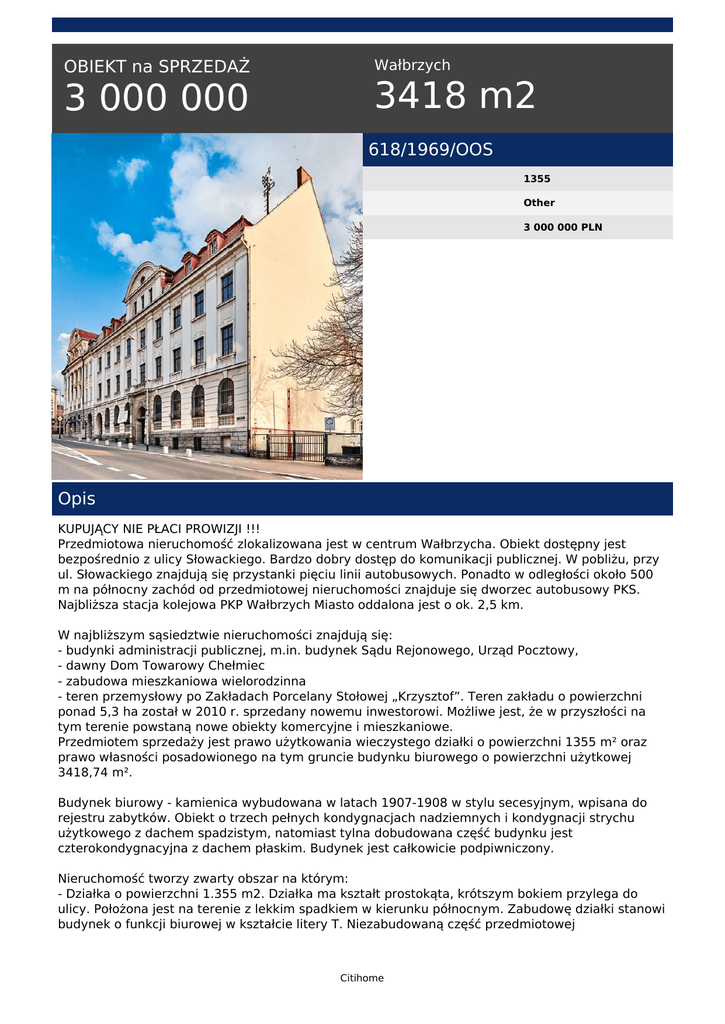OBIEKT na SPRZEDAŻ 3 000 000 Wałbrzych 3418 m2 618/1969/OOS 1355 Other 3 000 000 PLN Opis KUPUJĄCY NIE PŁACI PROWIZJI !!! Przedmiotowa nieruchomość zlokalizowana jest w centrum Wałbrzycha. Obiekt dostępny jest bezpośrednio z ulicy Słowackiego. Bardzo dobry dostęp do komunikacji publicznej. W pobliżu, przy ul. Słowackiego znajdują się przystanki pięciu linii autobusowych. Ponadto w odległości około 500 m na północny zachód od przedmiotowej nieruchomości znajduje się dworzec autobusowy PKS. Najbliższa stacja kolejowa PKP Wałbrzych Miasto oddalona jest o ok. 2,5 km. W najbliższym sąsiedztwie nieruchomości znajdują się: - budynki administracji publicznej, m.in. budynek Sądu Rejonowego, Urząd Pocztowy, - dawny Dom Towarowy Chełmiec - zabudowa mieszkaniowa wielorodzinna - teren przemysłowy po Zakładach Porcelany Stołowej „Krzysztof”. Teren zakładu o powierzchni ponad 5,3 ha został w 2010 r. sprzedany nowemu inwestorowi. Możliwe jest, że w przyszłości na tym terenie powstaną nowe obiekty komercyjne i mieszkaniowe. Przedmiotem sprzedaży jest prawo użytkowania wieczystego działki o powierzchni 1355 m² oraz prawo własności posadowionego na tym gruncie budynku biurowego o powierzchni użytkowej 3418,74 m². Budynek biurowy - kamienica wybudowana w latach 1907-1908 w stylu secesyjnym, wpisana do rejestru zabytków. Obiekt o trzech pełnych kondygnacjach nadziemnych i kondygnacji strychu użytkowego z dachem spadzistym, natomiast tylna dobudowana część budynku jest czterokondygnacyjna z dachem płaskim. Budynek jest całkowicie podpiwniczony. Nieruchomość tworzy zwarty obszar na którym: - Działka o powierzchni 1.355 m2. Działka ma kształt prostokąta, krótszym bokiem przylega do ulicy. Położona jest na terenie z lekkim spadkiem w kierunku północnym. Zabudowę działki stanowi budynek o funkcji biurowej w kształcie litery T. Niezabudowaną część przedmiotowej Citihome nieruchomości (dwa podwórza) stanową powierzchnie utwardzone kostką betonową użytkowane jako niewielkie parkingi, łącznie na 16 samochodów osobowych. - Parking na 14 miejsc postojowych urządzony jest na części działki będącej własnością Gminy Wałbrzych, przylegającej do przedmiotowej działki. Drugi wjazd na drugi parking wewnętrzny odbywa się poprzez prześwit bramowy w budynku biurowym Uzbrojenie: instalacja wodno-kanalizacyjna, instalacja elektryczna, instalacja gazowa. Infrastruktura teletechniczna Warunkiem sprzedaży jest ustanowienie nieodpłatnie i bezterminowo ograniczonych praw rzeczowych dostępu do infrastruktury telekomunikacyjnej pozostającej w obrębie nieruchomości, dotyczy: 1) powierzchni 481,63 m² w budynku na zasadzie użytkowania 2) gruntu na zasadzie służebności przesyłu. Przedmiotowa nieruchomość nie jest objęta miejscowym planem zagospodarowania przestrzennego. Zgodnie ze studium uwarunkowań i kierunków zagospodarowania przestrzennego zatwierdzonym Uchwałą nr XI/154/99 Rady Miasta Wałbrzych z dnia 30.06.1999 r. zmienioną Uchwałami: nr XII/142/03 z dnia 30.07.2003 r. i nr XX/197/08 Rady Miasta Wałbrzych z dnia 28.03.2008 r., przedmiotowa nieruchomość usytuowana jest na terenie oznaczonym symbolem I3.1 – uwarunkowania rozwoju, zabudowa staromiejska, centrum usługowo-handlowe i administracyjne miasta. Nieruchomość znajduje się w granicach strefy ochrony konserwatorskiej na podstawie decyzji z dnia 31.03.1984r. wpisana jest do rejestru zabytków pod numerem A/4683/1010/WŁ. Polecam i zachęcam do oglądania. Kontakt: Marcin Zakrzewski Specjalista ds. sprzedaży Tel: 513-401-901 [email protected] Marcin Zakrzewski tel. 513-401-901 email: [email protected] Citihome Powered by TCPDF (www.tcpdf.org)