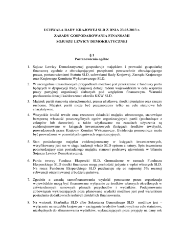 UCHWAŁA RADY KRAJOWEJ SLD Z DNIA 23.03.2013 r. ZASADY GOSPODAROWANIA FINANSAMI SOJUSZU LEWICY DEMOKRATYCZNEJ §1 Postanowienia ogólne 1. Sojusz Lewicy Demokratycznej gospodaruje majątkiem i prowadzi gospodarkę finansową zgodnie z obowiązującymi przepisami powszechnie obowiązującego prawa, postanowieniami Statutu SLD, uchwałami Rady Krajowej, Zarządu Krajowego oraz Krajowego Komitetu Wykonawczego SLD. 2. W szczególnie uzasadnionych przypadkach możliwe jest przekazanie z funduszy partii będących w dyspozycji Rady Krajowej dotacji radom wojewódzkim w celu wsparcia pracy partyjnej organizacji słabszych pod względem finansowym. Warunki przekazania dotacji każdorazowo określa KKW SLD. 3. Majątek partii stanowią nieruchomości, prawa użytkowe, środki pieniężne oraz rzeczy ruchome. Majątek partii może być przeznaczony tylko na cele statutowe lub charytatywne. 4. Wszystkie środki trwałe oraz rzeczowe składniki majątku obrotowego, stanowiące bezsporną własność poszczególnych ogniw organizacyjnych partii (pochodzące z zakupów lub darowizn), a także użytkowane na zasadach użyczenia są ewidencjonowane w księgach inwentarzowych (księgach środków trwałych), prowadzonych przez Krajowy Komitet Wykonawczy. Ewidencja pomocnicza może być prowadzona w pozostałych ogniwach organizacyjnych. 5. Stan posiadanego majątku ewidencjonowany w księgach inwentarzowych, weryfikowany jest raz w ciągu kadencji władz SLD spisem z natury. Spis inwentarza potwierdzający stan posiadanego majątku stanowi podstawę ujawnienia w bilansie Sojuszu Lewicy Demokratycznej. 6. Partia tworzy Fundusz Ekspercki SLD. Gromadzone w ramach Funduszu Eksperckiego SLD środki finansowe mogą pochodzić jedynie z wpłat własnych SLD. Na rzecz Funduszu Eksperckiego SLD przekazuje się co najmniej 5% rocznej subwencji otrzymywanej z budżetu państwa. 7. Zgodnie z zasadą samofinansowania wydatki ponoszone przez organizacje wojewódzkie mogą być finansowane wyłącznie ze środków własnych określonych w zatwierdzonych ramowych planach przychodów i wydatków. Podejmowanie zobowiązań wykraczających poza planowane wydatki możliwe jest pod warunkiem posiadania dodatkowych realnych źródeł ich finansowania. 8. Na wniosek Skarbnika SLD albo Sekretarza Generalnego SLD możliwe jest – wyłącznie na szczeblu krajowym – zaciąganie kredytów bankowych na cele statutowe, niezbędnych do sfinansowania wydatków, wykraczających poza przyjęty na dany rok plan finansowy. Decyzja w tej sprawie każdorazowo wymaga uchwały Zarządu Krajowego SLD. 9. Nabycie lub zbycie nieruchomości oraz nabycie lub zbycie obligacji Skarbu Państwa i bonów skarbowych Skarbu Pastwa wymaga uchwały Zarządu Krajowego SLD. 10. Środki finansowe będące w posiadaniu partii mogą być gromadzone jedynie na rachunkach bankowych. 11. Rachunki bankowe prowadzone są pod nazwą Sojusz Lewicy Demokratycznej z określeniem nazwy funduszu, którego dotyczą (Fundusz Statutowy, Fundusz Wyborczy, Fundusz Ekspercki). 12. Decyzje o utworzeniu rachunku bankowego oraz ustanowieniu pełnomocników uprawnionych do dysponowania rachunkiem, podejmują Sekretarz Generalny SLD i Skarbnik SLD. §2 Darowizny Darowizny pieniężne oraz niepieniężne mogą być przekazywane jedynie przez osoby fizyczne będące obywatelami polskimi, przy zachowaniu przepisów ustawy o partiach politycznych. §3 Składki członkowskie 1. Ustala się wpisowe w wysokości 10 złotych dla osób składających deklarację przynależności do SLD. Emeryci, renciści, uczniowie, studenci i bezrobotni wpłacają wpisowe w wysokości 5 złotych. 2. Opłata z tytułu wpisowego jest dochodem Rady Krajowej SLD. 3. Miesięczna składka członkowska wynosi 5 złotych. Emeryci, renciści, uczniowie, studenci i bezrobotni wpłacają comiesięczna składkę nie mniejszą niż 1 złoty. 4. Opłacanie wyższej od minimalnej kwoty składki określonej uchwałą Rady Krajowej SLD może nastąpić tylko na podstawie indywidualnej, dobrowolnej deklaracji członka SLD. 5. Członkowie kół SLD działających poza granicami Rzeczypospolitej Polskiej zwolnieni są z obowiązku opłacania składki członkowskiej. 6. Składka członkowska jest opłacana przez każdego członka w jego macierzystym kole. 7. Ewidencję i rozliczenie wpisowego oraz składek członkowskich prowadzi skarbnik koła w rejestrze składek członkowskich. Wzór rejestru określa Krajowy Komitet Wykonawczy SLD. 8. W uzasadnionych przypadkach zarząd gminny może okresowo zwolnić członka partii z koła działającego na jego terenie z opłacania składek członkowskich. 9. Zasady wykorzystania i podziału środków finansowych uzyskanych ze składek członkowskich określają w drodze uchwały zarządy powiatowe SLD. 2 §4 Składki specjalne 1. Członek SLD pełniący z jej poręczenia funkcje we władzach publicznych wszystkich szczebli, oprócz składki członkowskiej opłaca składkę specjalną. 2. Składka specjalna wynosi 7% przychodu z tytułu pełnionej funkcji brutto. 3. Składka specjalna płatna jest z dołu do 15 dnia każdego miesiąca. 4. Składki specjalne wnoszone przez parlamentarzystów europejskich i krajowych będących członkami SLD są dochodami Rady Krajowej SLD, a pozostałe składki specjalne opłacane przez członków SLD z tytułu pełnienia mandatu i funkcji we władzach publicznych wszystkich szczebli są dochodami organizacji wojewódzkich. Zasady gospodarowania i podziału funduszy pozyskanych z tych źródeł określają rady wojewódzkie SLD, w drodze uchwały. 5. Wysokość miesięcznej składki specjalnej dla członka SLD pełniącego mandat parlamentarzysty RP wynosi 700 złotych w przypadku parlamentarzysty zawodowego, 170 złotych w przypadku parlamentarzysty niezawodowego. 6. Wysokość miesięcznej składki specjalnej dla członka SLD pełniącego mandat parlamentarzysty RP, który pełni funkcję wiceprzewodniczącego komisji parlamentarnej wynosi 800 złoty