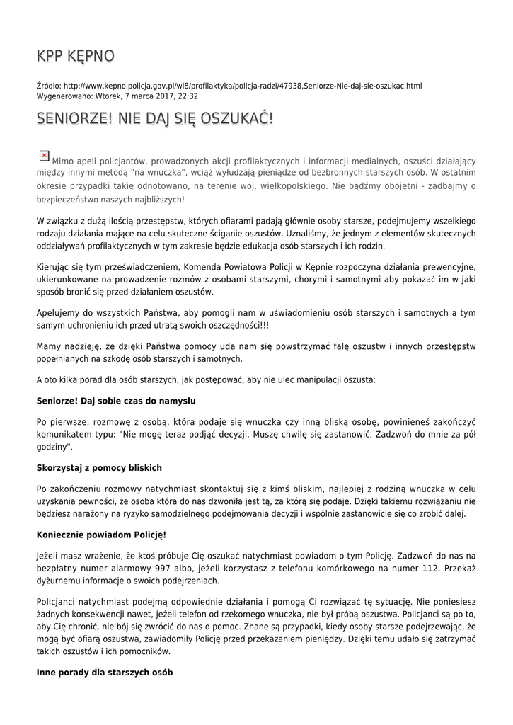 KPP KĘPNO Źródło: http://www.kepno.policja.gov.pl/wl8/profilaktyka/policja-radzi/47938,Seniorze-Nie-daj-sie-oszukac.html Wygenerowano: Wtorek, 7 marca 2017, 22:32 SENIORZE! NIE DAJ SIĘ OSZUKAĆ! Mimo apeli policjantów, prowadzonych akcji profilaktycznych i informacji medialnych, oszuści działający między innymi metodą "na wnuczka", wciąż wyłudzają pieniądze od bezbronnych starszych osób. W ostatnim okresie przypadki takie odnotowano, na terenie woj. wielkopolskiego. Nie bądźmy obojętni - zadbajmy o bezpieczeństwo naszych najbliższych! W związku z dużą ilością przestępstw, których ofiarami padają głównie osoby starsze, podejmujemy wszelkiego rodzaju działania mające na celu skuteczne ściganie oszustów. Uznaliśmy, że jednym z elementów skutecznych oddziaływań profilaktycznych w tym zakresie będzie edukacja osób starszych i ich rodzin. Kierując się tym przeświadczeniem, Komenda Powiatowa Policji w Kępnie rozpoczyna działania prewencyjne, ukierunkowane na prowadzenie rozmów z osobami starszymi, chorymi i samotnymi aby pokazać im w jaki sposób bronić się przed działaniem oszustów. Apelujemy do wszystkich Państwa, aby pomogli nam w uświadomieniu osób starszych i samotnych a tym samym uchronieniu ich przed utratą swoich oszczędności!!! Mamy nadzieję, że dzięki Państwa pomocy uda nam się powstrzymać falę oszustw i innych przestępstw popełnianych na szkodę osób starszych i samotnych. A oto kilka porad dla osób starszych, jak postępować, aby nie ulec manipulacji oszusta: Seniorze! Daj sobie czas do namysłu Po pierwsze: rozmowę z osobą, która podaje się wnuczka czy inną bliską osobę, powinieneś zakończyć komunikatem typu: "Nie mogę teraz podjąć decyzji. Muszę chwilę się zastanowić. Zadzwoń do mnie za pół godziny". Skorzystaj z pomocy bliskich Po zakończeniu rozmowy natychmiast skontaktuj się z kimś bliskim, najlepiej z rodziną wnuczka w celu uzyskania pewności, że osoba która do nas dzwoniła jest tą, za którą się podaje. Dzięki takiemu rozwiązaniu nie będziesz narażony na ryzyko samodzielnego podejmowania decyzji i wspólnie zastanowicie się co zrobić dalej. Koniecznie powiadom Policję! Jeżeli masz wrażenie, że ktoś próbuje Cię oszukać natychmiast powiadom o tym Policję. Zadzwoń do nas na bezpłatny numer alarmowy 997 albo, jeżeli korzystasz z telefonu komórkowego na numer 112. Przekaż dyżurnemu informacje o swoich podejrzeniach. Policjanci natychmiast podejmą odpowiednie działania i pomogą Ci rozwiązać tę sytuację. Nie poniesiesz żadnych konsekwencji nawet, jeżeli telefon od rzekomego wnuczka, nie był próbą oszustwa. Policjanci są po to, aby Cię chronić, nie bój się zwrócić do nas o pomoc. Znane są przypadki, kiedy osoby starsze podejrzewając, że mogą być ofiarą oszustwa, zawiadomiły Policję przed przekazaniem pieniędzy. Dzięki temu udało się zatrzymać takich oszustów i ich pomocników. Inne porady dla starszych osób Nie wpuszczaj do domu nieznanych Ci osób. Poproś rodzinę o wyposażenie drzwi w wizjer, czyli tak zwanego judasza i blokadę drzwi w postaci łańcucha. Wszystkie wizyty instalatorów i innych przedstawicieli administracji są zawsze zapowiadane na tablicy ogłoszeń, jeżeli mieszkasz na wsi, takie informacje mogą być przekazywane za pomocą kurendy. Nie bój się legitymować przychodzących do Ciebie osób przed wpuszczeniem do domu. Nigdy, pod żadnym pozorem nie powierzaj swoich pieniędzy obcym osobom. Kiedy wydaje Ci się, że ktoś próbuje Cię oszukać, natychmiast powiadom Policję. Najlepszym miejscem przechowywania pieniędzy jest konto bankowe. Nie trzymaj dużych sum gotówki w domu, takie miejsca ukrycia pieniędzy jak przysłowiowa skarpetka, szafka z bielizną, skrytka pod materacem, puszka po kawie czy schowanie pieniędzy pomiędzy kartki książki, nie uchronią Twoich pieniędzy przed złodziejem. Ocena: 0/5 (0) Tweetnij