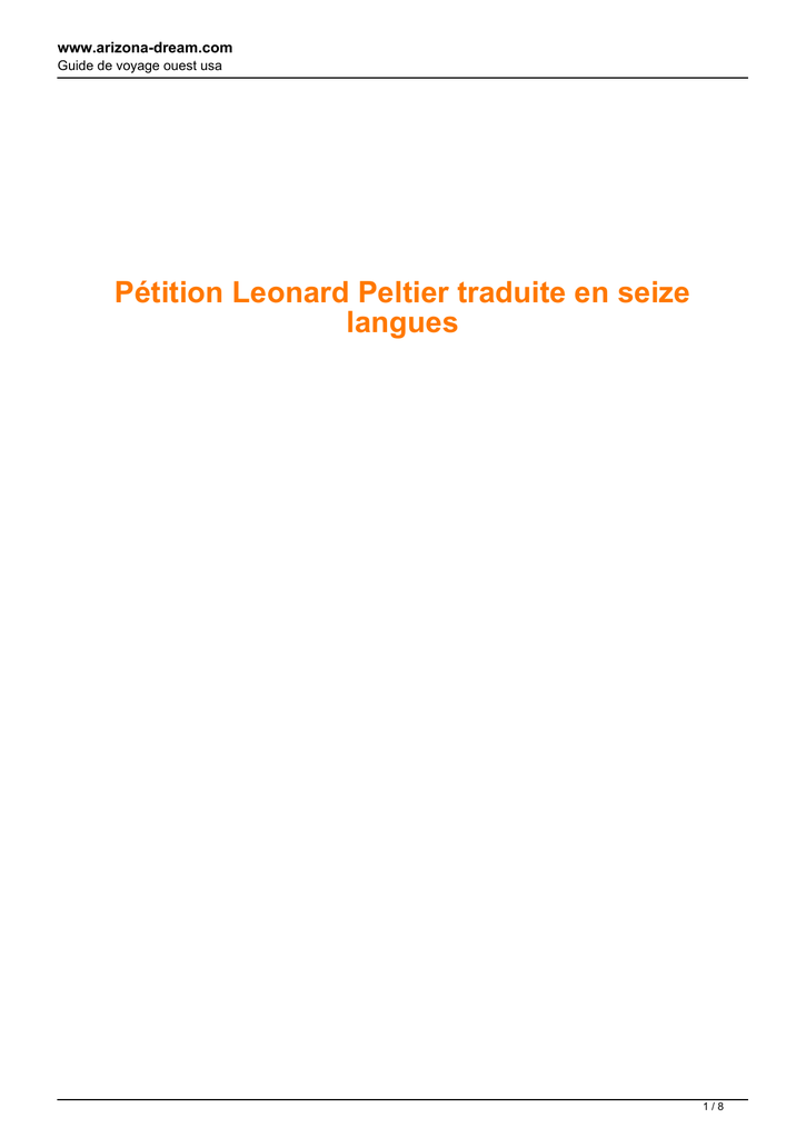 www.arizona-dream.com Guide de voyage ouest usa Pétition Leonard Peltier traduite en seize langues 1/8 www.arizona-dream.com Guide de voyage ouest usa Adresser la pétition à : Président Barack Obama The White House 1600 Pennsylvania Avenue Northwest Washington, DC 20500 United States Vous pouvez aussi signer la pétition en ligne à cette adresse : Signez la petition qui sera envoyée au président des Etats Unis ! Vous pouvez aussi télécharger la pétition : Format PDF ou Format Word Pétition Leonard Peltier FRANçAIS Par la présente, nous insistons auprès du président des Etats-Unis, Barack Obama, pour qu'il étudie le cas de Leonard Peltier. Il existe suffisamment de preuves de l'innocence de cet Anishinabe/Lakota, défenseur des droits de l'homme. Le Procureur a reconnu pendant le procès que ni le gouvernent des Etats-Unis, ni le FBI n'avaient la moindre idée de qui avait tué les agents Coler et Williams. La Cour d'Appel du 8ème circuit a établi que le FBI avait obtenu des témoignages par la contrainte; s'était rendu coupable de parjure; avait fabriqué des preuves contre l'accusé; avait empêché que soient présentées en session des preuves cruciales de l'innocence de Leonard Peltier. Nous insistons aussi auprès du Comité Judiciaire du Sénat des Etats-Unis pour qu'il entreprenne une enquête officielle sur les erreurs et manquements du FBI dans l'établissement du dossier de ce cas particulier. Après tout, 55 membres du Congrès ont déjà demandé la clémence présidentielle pour Leonard Peltier; de plus, les Parlements belge et européen ont voté chacun deux résolutions avec ces mêmes demandes. English petition Leonard Peltier We hereby urge U.S. President Barack Obama to look into the case of Leonard Peltier. There is sufficient evidence that this Anishinabe/Lakota human rights activist is innocent. In court, the prosecuting attorney admitted that the US government nor the FBI have any idea who killed FBI agents Coler and Williams; the 8th Circuit Court of Appeals decided that the FBI had coerced witnesses, had committed perjury, fabricated false evidence, and withheld crucial evidence proving Leonard Peltier's innocence. We also urge the U.S. Senate Judiciary Committee to start hearings into the misconduct of the FBI in this particular case. After all, 55 Congress members have already asked to grant Peltier executive clemency. Furthermore, the Belgian and European Parliaments have each adopted two resolutions with these same demands. 2/8 www.arizona-dream.com Guide de voyage ouest usa Verzoekschrift Nederlanders Leonard Peltier Met deze willen wij er bij V.S. president Barack Obama op aandringen zich te verdiepen in de zaak van Leonard Peltier. Er is voldoende bewijs dat deze Anishinabe/Lakota mensenrechtenactivist onschuldig is. De openbare aanklager gaf in de rechtbank toe dat de regering noch het FBI enig idee heeft wie de agenten Coler en Willams doodschoot; en het 8ste Hof van Beroep besloot dat het FBI getuigen onder dwang zette; meineed pleegde, vals bewijsmateriaal fabriceerde, en belangrijk bewijsmateriaal achterhield dat Leonard Peltier's onschuld bewees. My, nizej podpisani, apelujemy do prezydenta Stanow Zjednoczonych, Georg'a W. Bush'a o ponowne rozpatrzenie sprawy Leonarda Peltiera. Istnieje wystarczajaco duzo dowodow swiadczacych o niewinnosci Leonarda, wieznia politycznego z plemienia Anishinabe/Lakota. Sedziowie oswiadczyli pod przysiega, ze ani rzad ani FBI nie maja pojecia, kto zamordowal agentow Colera i Williamsa; rowniez '8th Circuit Court of Appeals' poswiadczyl, iz FBI przyznalo, ze zeznania w tej sprawie zostaly wymuszone a dowody spreparowane, popelniono krzywoprzysiestwa i zatajniono kluczowe informacje dowodowe niewinnosci Leonarda Peltiera.Wij vragen eveneens aan het U.S. Senate Judiciary Committee om een onderzoek te starten naar het wangedrag van het FBI in deze bijzondere zaak. Er hebben reeds 55 Congresleden openlijk gevraagd om Peltier presidentiële gratie te verlenen. Bovendien keurden het Belgisch en het Europees Parlement ieder twee resoluties goed met deze zelfde eisen. Deutsch petition Leonard Peltier Wir, die Unterzeichnenden, appellieren hiermit an den Präsidenten der USA, Barack Obama, den Fall Leonard Peltier einer Prüfung zu unterziehen. Es gibt ausreichend Beweise für die Unschuld des Anishinabe/Lakota Menschenrechtsverteidigers. Der Staatsanwalt hat vor Gericht zugegeben, dass weder die Regierung, noch das FBI eine Ahnung habe, wer die Morde an den Agenten Coler und Williams verübt habe; und der '8th Circuit Court of Appeals' stellte fest, dass das FBI Zeugen beeinflusst, Meineid gepflegt und Tatsachen verfälscht hatte, und Fakten verheimlicht die die Unschuld Peltiers bewiesen. Wir appellieren gleichermaßen an den US Senate Judiciary Committee, eine Untersuchung der rechtlichen Unregelmäßigkeiten seitens des FBI in diesem Fall durchzuführen. Schon 55 Mitglieder des amerikanischen Kongresses haben die Begnadigung Peltiers gefordernt. Des weiteren haben das Belgische und das Europäische Parlament jedes zwei Resolutionen mit den gleichen Forderungen verabschiedet. Petición en Español Leonard Peltier Nosotros por la presente instamos el Presidente de los E.U. Barack Obama para estudiar el caso de Leonard Peltier. Hay evidencia suficiente que este activista Anishinabe/Lakota de derechos humanos es inocente. En el tribunal, el abogado demandante admitió que el gobierno del E.U. y el FBI no tienen cualquier idea quien mató los agentes del FBI Coler y Williams; el Tribunal del 8vo Circuito decidió que el FBI había forzada los testigos, había cometido perjurio, 3/8 www.arizona-dream.com Guide de voyage ouest usa fabricó evidencia falsa, y había retenido evidencia crucial probando la inocencia de Leonard Peltier. Nosotros también instamos el Senate Judiciary Committee de los E.U. para comenzar audiencias sobre la mala conducta del FBI en este caso particular. A fin de cuentas, 55 miembros del C