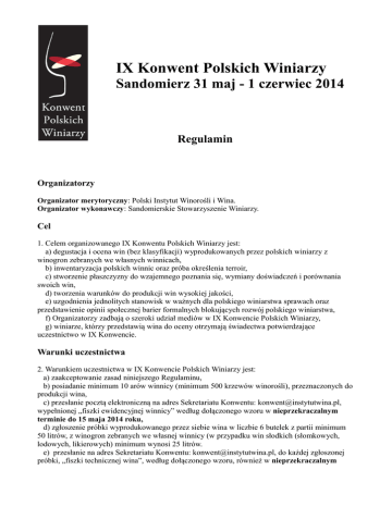 IX Konwent Polskich Winiarzy Sandomierz 31 maj - 1 czerwiec 2014 Regulamin Organizatorzy Organizator merytoryczny: Polski Instytut Winorośli i Wina. Organizator wykonawczy: Sandomierskie Stowarzyszenie Winiarzy. Cel 1. Celem organizowanego IX Konwentu Polskich Winiarzy jest: a) degustacja i ocena win (bez klasyfikacji) wyprodukowanych przez polskich winiarzy z winogron zebranych we własnych winnicach, b) inwentaryzacja polskich winnic oraz próba określenia terroir, c) stworzenie płaszczyzny do wzajemnego poznania się, wymiany doświadczeń i porównania swoich win, d) tworzenia warunków do produkcji win wysokiej jakości, e) uzgodnienia jednolitych stanowisk w ważnych dla polskiego winiarstwa sprawach oraz przedstawienie opinii społecznej barier formalnych blokujących rozwój polskiego winiarstwa, f) Organizatorzy zadbają o szeroki udział mediów w IX Konwencie Polskich Winiarzy, g) winiarze, którzy przedstawią wina do oceny otrzymają świadectwa potwierdzające uczestnictwo w IX Konwencie. Warunki uczestnictwa 2. Warunkiem uczestnictwa w IX Konwencie Polskich Winiarzy jest: a) zaakceptowanie zasad niniejszego Regulaminu, b) posiadanie minimum 10 arów winnicy (minimum 500 krzewów winorośli), przeznaczonych do produkcji wina, c) przesłanie pocztą elektroniczną na adres Sekretariatu Konwentu: [email protected], wypełnionej „fiszki ewidencyjnej winnicy” według dołączonego wzoru w nieprzekraczalnym terminie do 15 maja 2014 roku, d) zgłoszenie próbki wyprodukowanego przez siebie wina w liczbie 6 butelek z partii minimum 50 litrów, z winogron zebranych we własnej winnicy (w przypadku win słodkich (słomkowych, lodowych, likierowych) minimum wynosi 25 litrów. e) przesłanie na adres Sekretariatu Konwentu: [email protected], do każdej zgłoszonej próbki, „fiszki technicznej wina”, według dołączonego wzoru, również w nieprzekraczalnym terminie do 15 maja 2014 roku, f) każdy z uczestników Konwentu może zgłosić 2 próbki wina do degustacji panelowej i po 1 próbce wina do każdego z seminariów tematycznych (Hibernal, Regent). W degustacji panelowej może być ocenione maksymalnie 60 próbek wina, a w każdym z seminariów tematycznych maksymalnie 20 próbek wina, dlatego o przyjęciu próbek do oceny będzie decydować kolejność zgłoszeń. Organizatorzy zastrzegają sobie prawo do zmiany przeznaczenia próbki lub jej odrzucenia. Nadwyżki zgłoszonych próbek win do seminariów tematycznych będą przepisywane do listy oceny panelowej. O zakwalifikowaniu próbek tak do oceny panelowej, jak i seminariów tematycznych będzie decydować wyłącznie kolejność zgłoszeń i dostarczenia win na Konwent. Przekazane na Konwent próbki win przechodzą na własność organizatorów. g) udział w IX Konwencie Polskich Winiarzy jest bezpłatny. Transport i zakwaterowanie jest po stronie uczestniczących w Konwencie winiarzy. Winnice zgłaszające minimum 2 próbki wina na Konwent mogą być reprezentowane bezpłatnie przez dwie osoby, winnice zgłaszające tylko 1 próbkę, lub nie zgłaszające wina, tylko przez jedną osobę. Opłata za dodatkową osobę reprezentującą winnicę wynosi 150 zł. Dla osób z zewnątrz odpłatność za udział w ocenie panelowej wynosi 300 zł/os, a w każdym z seminariów tematycznych po 150 zł/os. Opłaty należy dokonać przed Konwentem, najpóźniej do 28 maja 2014 na konto Sandomierskiego Stowarzyszenia Winiarzy z dopiskiem w tytule "Konwent": Sandomierskie Stowarzyszenie Winiarzy, ul. Rynek 25/26, 27-600 Sandomierz, nr. 25114020040000300274907031 Osoby opłacające uczestnictwo powinny okazać się potwierdzeniem wpłaty. h) świadectwa uczestnictwa w IX Konwencie otrzymają wyłącznie winiarze, którzy zgłoszą wina do oceny panelowej lub seminariów tematycznych i w regulaminowym terminie nadeślą dokumenty konwentowe. Terminarz IX KPW IX Konwent Polskich Winiarzy odbędzie się 31 maja i 1 czerwca 2014 roku (sobota-niedziela) na Zamku w Sandomierzu. a) wszystkie wymagane dokumenty należy przesyłać wyłącznie pocztą elektroniczną na adres Sekretariatu Konwentów, e-mail: [email protected] , b) po weryfikacji zgłoszeń począwszy od dnia 20 maja uczestnicy będą mogli uzyskać informacje potwierdzające udział w IX Konwencie drogą telefoniczną lub e-mailową, c) zgłoszone próbki wina należy przesyłać lub dostarczać osobiście na adres: Marceli Małkiewicz, Góry Wysokie 136, 27-620 Dwikozy, tel. 782 679 034, w nieprzekraczalnym terminie do 20 maja 2014. Prosimy o zabezpieczenie wysyłanych win przed stłuczeniem. Odpowiedzialność za transport win ponoszą winiarze. Organizatorzy Konwentu przejmą odpowiedzialność za wina od momentu dostarczenia. Organizatorzy zadbają także o dostarczenie win na panel degustacyjny i seminaria tematyczne. Podział win na kategorie: Kategoria Wina białe - wytrawne - półwytrawne - półsłodkie - słodkie Wina różowe Wina czerwone Wina musujące Wina likierowe Cukier resztkowy (g/l) Symbol kategorii (0-4) (4-15) (15-45) (>45) I.a I.b I.c I.d II III IV V (0-4) (>80) Dodatkowych informacji udziela Sekretariat Konwentu Polskich Winiarzy, e-mail: [email protected]. Na pytania telefoniczne w sprawie zasad Regulaminu odpowiada: Roman Myśliwiec, tel. 602 375 851. Kontakt do organizatorów w Sandomierzu: Mateusz Paciura, e-mail.: [email protected], tel. 509 327 327 Marcin Płochocki Prezes Sandomierskiego Stowarzyszenia Winiarzy Roman Myśliwiec Prezes PIWiW