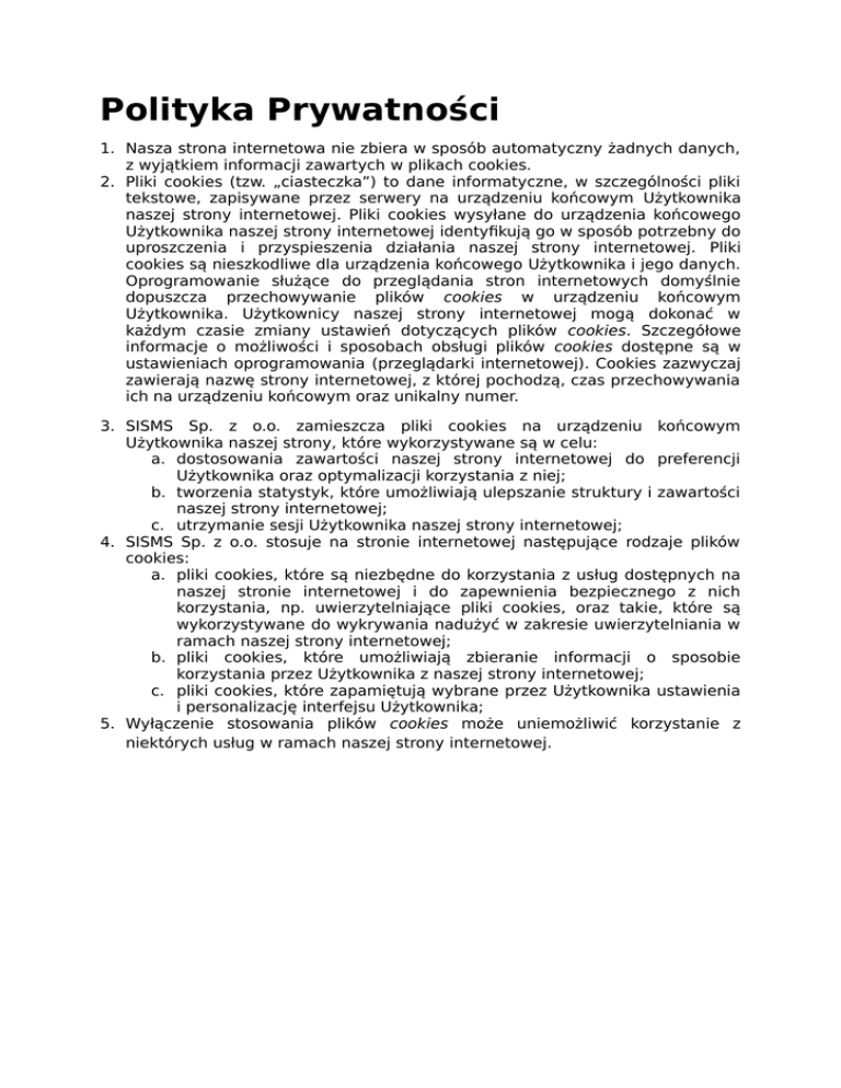 Polityka Prywatności 1. Nasza strona internetowa nie zbiera w sposób automatyczny żadnych danych, z wyjątkiem informacji zawartych w plikach cookies. 2. Pliki cookies (tzw. „ciasteczka”) to dane informatyczne, w szczególności pliki tekstowe, zapisywane przez serwery na urządzeniu końcowym Użytkownika naszej strony internetowej. Pliki cookies wysyłane do urządzenia końcowego Użytkownika naszej strony internetowej identyfikują go w sposób potrzebny do uproszczenia i przyspieszenia działania naszej strony internetowej. Pliki cookies są nieszkodliwe dla urządzenia końcowego Użytkownika i jego danych. Oprogramowanie służące do przeglądania stron internetowych domyślnie dopuszcza przechowywanie plików cookies w urządzeniu końcowym Użytkownika. Użytkownicy naszej strony internetowej mogą dokonać w każdym czasie zmiany ustawień dotyczących plików cookies. Szczegółowe informacje o możliwości i sposobach obsługi plików cookies dostępne są w ustawieniach oprogramowania (przeglądarki internetowej). Cookies zazwyczaj zawierają nazwę strony internetowej, z której pochodzą, czas przechowywania ich na urządzeniu końcowym oraz unikalny numer. 3. SISMS Sp. z o.o. zamieszcza pliki cookies na urządzeniu końcowym Użytkownika naszej strony, które wykorzystywane są w celu: a. dostosowania zawartości naszej strony internetowej do preferencji Użytkownika oraz optymalizacji korzystania z niej; b. tworzenia statystyk, które umożliwiają ulepszanie struktury i zawartości naszej strony internetowej; c. utrzymanie sesji Użytkownika naszej strony internetowej; 4. SISMS Sp. z o.o. stosuje na stronie internetowej następujące rodzaje plików cookies: a. pliki cookies, które są niezbędne do korzystania z usług dostępnych na naszej stronie internetowej i do zapewnienia bezpiecznego z nich korzystania, np. uwierzytelniające pliki cookies, oraz takie, które są wykorzystywane do wykrywania nadużyć w zakresie uwierzytelniania w ramach naszej strony internetowej; b. pliki cookies, które umożliwiają zbieranie informacji o sposobie korzystania przez Użytkownika z naszej strony internetowej; c. pliki cookies, które zapamiętują wybrane przez Użytkownika ustawienia i personalizację interfejsu Użytkownika; 5. Wyłączenie stosowania plików cookies może uniemożliwić korzystanie z niektórych usług w ramach naszej strony internetowej.