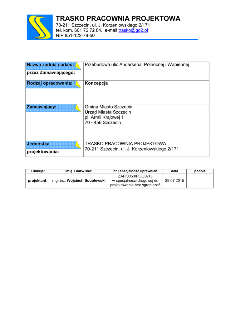 TRASKO PRACOWNIA PROJEKTOWA 70-211 Szczecin, ul. J. Korzeniowskiego 2/171 tel. kom. 601 72 72 84, e-mail [email protected] NIP 851-122-79-50 Nazwa zadnia nadana Przebudowa ulic Andersena, Północnej i Wapiennej przez Zamawiającego: Rodzaj opracowania: Koncepcja Zamawiający: Gmina Miasto Szczecin Urząd Miasta Szczecin pl. Armii Krajowej 1 70 - 456 Szczecin Jednostka TRASKO PRACOWNIA PROJEKTOWA 70-211 Szczecin, ul. J. Korzeniowskiego 2/171 projektowania: Funkcja: projektant: Imię i nazwisko: nr i specjalność uprawnień data mgr inŜ. Wojciech Sobolewski ZAP/0053/POOD/13 w specjalności drogowej do projektowania bez ograniczeń 29 07 2015 podpis SPIS ZAWARTOŚCI CZĘŚĆ OPISOWA 1 1.1 1.2 1.3 2 2.1 2.2 3 3.1 3.2 3.3 WSTĘP....................................................................................................................................... 2 Podstawa opracowania .............................................................................................................. 2 Przedmiot i zakres opracowania ................................................................................................ 2 Materiały wyjściowe do opracowania ......................................................................................... 2 ISTNIEJĄCE ZAGOSPODAROWANIE TERENU...................................................................... 2 Układ komunikacyjny.................................................................................................................. 2 Istniejąca infrastruktura techniczna ............................................................................................ 3 KONCEPCJA ZAGOSPODAROWANIA TERENU .................................................................... 3 ZałoŜenia projektowe do koncepcji ............................................................................................ 3 Kolizje ......................................................................................................................................... 4 Wydzielenia ................................................................................................................................ 4 CZĘŚĆ RYSUNKOWA nazwa rysunku nr rysunku 1 Koncepcja zagospodarowania terenu 2 Koncepcja zagospodarowania terenu 3 Koncepcja zagospodarowania terenu 1 1 1.1 WSTĘP Podstawa opracowania Podstawą opracowania jest umowa nr C.R.U./15/0002736 zawarta w dniu 30.06.2015 r. w Szczecinie pomiędzy Gminą Miasto Szczecin, a Trasko Pracownia Projektowa Zygmunt Sobolewski. 1.2 Przedmiot i zakres opracowania Przedmiotem opracowania jest koncepcja przebudowy ulic: Andersena od skrzyŜowania z ul. Miodową do ul. Królowej Śniegu, od Królowej Śniegu do skrzyŜowania pomiędzy ulicami Calineczki i Małej Syrenki, ul. Północnej od skrzyŜowania z ul. Małej Syrenki do skrzyŜowania z ul. Wapienną, ul. Szwedzkiej od skrzyŜowania z ul. Wapienną do skrzyŜowania z ul. Jantarową, ulicy Wapiennej od skrzyŜowania z ul. Feniksa do ulicy Duńskiej. Zakres koncepcji obejmuje zaprojektowanie układu drogowego na wymienionym odcinku. Przedmiotowy tom koncepcji zawiera generalne rozwiązania, które stanowić będą materiał wyjściowy dla dalszego etapu opracowania wielobranŜowej dokumentacji technicznej. 1.3 Materiały wyjściowe do opracowania Koncepcję sporządzono w oparciu o następujące materiały: 1) wizja lokalna w terenie przeprowadzona przez zespół projektowy, 2) kopia z mapy zasadniczej w skali 1:500, 3) uchwała nr IX/182/03 Rady Miasta Szczecina z dnia 22 września 2003 r. w sprawie Miejscowego planu zagospodarowania przestrzennego „Osów – Podbórzańska” w Szczecinie, 4) uchwała nr XXI/561/08 Rady Miasta Szczecin z dnia 24 kwietnia 2008 r. w sprawie Miejscowego planu zagospodarowania przestrzennego „ Warszawo - Duńska” w Szczecinie, 5) uchwała nr XXII/571/08 Rady Miasta Szczecin z dnia 19 maja 2008 r. w sprawie Miejscowego planu zagospodarowania przestrzennego „Osów – Andersena” w Szczecinie. 2 2.1 ISTNIEJĄCE ZAGOSPODAROWANIE TERENU Układ komunikacyjny Ul. Andersena i jej przedłuŜenie ul. Północna i Wapienna stanowią ciąg komunikacyjny zapewniający obsługę komunikacyjną rejonu Osów – Gubałówka i Warszewo. Ulica Andersena odgałęzia się od ulicy Miodowej i przechodzi przez tereny o zabudowie jednorodzinnej. PrzedłuŜenie jej stanowi ciąg ulic Północnej i Wapiennej łączącej się z ul. Duńską. Przedmiotowy ciąg ulic posiada liczne skrzyŜowania dochodzącymi do niej ulicami dojazdowymi do posesji i zamkniętych osiedli. Ulice Andersena, Północna i Wapienna posiadają pojedynczą jezdnię o szerokości od 4,5 m do 6,5 m. Szerokość jezdnia jest na całym odcinku zmienna i dostosowana jest zagospodarowania terenów przyległych do ulicy. W wielu miejscach istniejąca jezdnia jest usytuowana po za pasem drogowym, na uprzednio wyjeŜdŜonym gruncie. Jezdnia posiada nawierzchnię z mas mineralno asfaltowych oraz z destruktu bitumicznego. Na przewaŜającej długości brak jest chodników. Jednostronny chodnik występuje na odcinku ulicy Północnej i Wapiennej od skrzyŜowania z ulicą Duńską do skrzyŜowania z ulicą Feniksa. Utwardzone nawierzchnie ulic nie posiadają uporządkowanego odwodnienia. Woda opadowa jest odprowadzana na pobocza. W rejonie strumienia Warszowiec, ze względu na ukształtowanie profilu podłuŜnego w tym miejscu, zabudowany jest wpust odprowadzający wody opadowe z jedni do strumienia. Opracowanie obejmuje równieŜ ciąg ulicy Szwedzkiej , która to posiada jezdnię o szerokości 8,5 m z nawierzchnią z kostki kamiennej od ulicy Duńskiej do skrzyŜowania z ulicą ks. Jana DzierŜonia. Na dalszym odcinku jezdnia posiada nawierzchnię z mas mineralno-asfaltowych. 2 Chodniki usytuowane są po obu stronach jezdni i oddzielone są od jezdni pasem zieleni, w którym rosną stare dęby nadające alejowy charakter ulicy. 2.2 Istniejąca infrastruktura techniczna Na terenie projektowany