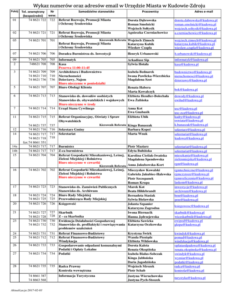 Wykaz numerów oraz adresów email w Urzędzie Miasta w Kudowie-Zdroju Pokój 01 Nr Samodzielne stanowisko Tel. zewnętrzny wew. (bezpośredni) 74 8621 722 722 Referat Rozwoju, Promocji Miasta i Ochrony Środowiska 02 74 8621 721 721 05 74 8621 701 701 Referat Rozwoju, Promocji Miasta i Ochrony Środowiska Pracownicy Dorota Dąbrowska Roman Smolnicki Wojciech Sołtysik Agnieszka Czerniachowicz Kierownik Referatu Wojciech Zimoch Adres e-mail [email protected] [email protected] [email protected] [email protected] Referat Rozwoju, Promocji Miasta i Ochrony Środowiska Katarzyna Kubik Wiesław Czapla [email protected] [email protected] [email protected] 07 74 8621 706 706 Doradca Burmistrza ds. Inwestycji Henryk Urbanowski [email protected] 09 2 74 8621 705 748621 708 705 708 Arkadiusz Sip Sylwia Hotała [email protected] [email protected] 3 74 8621 709 74 8621 710 74 8621 736 709 710 736 Izabela Bednarek Iwona Pawlicka-Wierzbicka Magdalena Szot [email protected] [email protected] [email protected] 5 74 8621 707 707 Informatyk Kasa Przerwa 11:00-11:45 Architektura i Budownictwo Nieruchomości Dzierżawy, Najem Biuro nieczynne w poniedziałki Biuro Obsługi Klienta 6 74 8621 713 713 7 74 8621 714 714 11 74 8621 715 715 737 716 717 718 14a 14b 15 74 8621 737 74 8621 716 74 8621 717 74 8621 718 fax:74 8661 351 74 8621 717 74 8621 717 74 8621 704 717 717 704 Burmistrz Z-ca burmistrza Referat Gospodarki Mieszkaniowej, Leśnej, Zieleni Miejskiej i Rolnictwa Biuro nieczynne w czwartki 16 74 8621 702 702 17 74 8621 723 723 18 74 8621 724 74 8621 725 74 8621 726 724 725 726 74 8621 727 74 8621 728 74 8621 730 74 8621 732 727 728 Referat Gospodarki Mieszkaniowej, Leśnej, Mieczysław Kowalski Zieleni Miejskiej i Rolnictwa Gabriela Jakubiec-Halewska Biuro nieczynne w czwartki Piotr Szczepanek Roman Krupa Stanowisko ds. Zamówień Publicznych Marek Kot Stanowisko ds. Archiwum Beata Hildebrandt Biuro Rady Miejskiej Bernadeta Stasiak Przewodnicząca Rady Miejskiej Sylwia Bielawska Księgowość Jolanta Szpanier Katarzyna Zagrodna Skarbnik Iwona Biernacik Z - ca Skarbnika Hanna Jędrzejewska Ewidencja Działalności Gospodarczej Elżbieta Sawicka Stanowisko ds. profilaktyki i rozwiązywania Katarzyna Oczkowska problemów uzależnień 24 25 74 8621 731 74 8621 712 731 712 26 74 8621 733 733 27 74 8621 734 734 28 74 8621 735 735 12 14 Renata Habera Marta Kowalczyk Elżbieta Hendler-Bolechała Stanowisko ds. dowodów osobistych Stanowisko ds. obywatelskich i wojskowych Ewa Żulińska Biuro nieczynne w środy Urząd Stanu Cywilnego Anna Kot Ewa Gnabasik Referat Organizacyjny, Oświaty i Spraw Elżbieta Ubik Obywatelskich Kierownik Referatu Kinga Banaszak Sekretarz Gminy Barbara Kopeć Sekretariat Marta Wnuk Piotr Maziarz Edyta Bubińska Karolina Cieślak-Iwańska Magdalena Spendowska Kierownik Referatu Anna Jakubowska-Kort 20 21 23 74 8661 387 74 8663 568 Aktualizacja:2017-02-03 730 732 Referat Finansowo-Budżetowy Referat Finansowo-Budżetowy Windykacja Gospodarowanie odpadami komunalnymi Podatki i Opłaty Lokalne Podatki Radca Prawny Kontrola wewnętrzna Informacja Turystyczna [email protected] [email protected] [email protected] [email protected] [email protected] [email protected] [email protected] [email protected] [email protected] [email protected] [email protected] [email protected] [email protected] [email protected] [email protected] [email protected] [email protected] [email protected] [email protected] [email protected] [email protected] [email protected] [email protected] [email protected] [email protected] [email protected] [email protected] [email protected] [email protected] Krystyna Świrk Wanda Pieniądz Elżbieta Wiklowska Dorota Kaleta Renata Okopińska Izabela Białas-Sobczak Kinga Jabłońska Daria Jagodzińska Wojciech Mrozek Piotr Schab [email protected] [email protected] [email protected] [email protected] [email protected] [email protected] [email protected] [email protected] [email protected] [email protected] Justyna Wieruchowska Justyna Pych-Stoszek [email protected]
