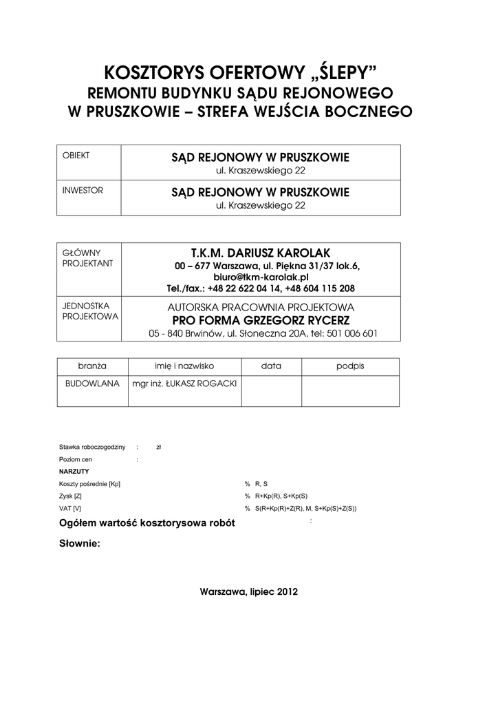 KOSZTORYS OFERTOWY „ŚLEPY” REMONTU BUDYNKU SĄDU REJONOWEGO W PRUSZKOWIE – STREFA WEJŚCIA BOCZNEGO OBIEKT SĄD REJONOWY W PRUSZKOWIE ul. Kraszewskiego 22 INWESTOR SĄD REJONOWY W PRUSZKOWIE ul. Kraszewskiego 22 GŁÓWNY PROJEKTANT T.K.M. DARIUSZ KAROLAK 00 – 677 Warszawa, ul. Piękna 31/37 lok.6, [email protected] Tel./fax.: +48 22 622 04 14, +48 604 115 208 JEDNOSTKA PROJEKTOWA AUTORSKA PRACOWNIA PROJEKTOWA PRO FORMA GRZEGORZ RYCERZ 05 - 840 Brwinów, ul. Słoneczna 20A, tel: 501 006 601 branŜa imię i nazwisko BUDOWLANA mgr inŜ. ŁUKASZ ROGACKI Stawka roboczogodziny : Poziom cen : data podpis zł NARZUTY Koszty pośrednie [Kp] % R, S Zysk [Z] % R+Kp(R), S+Kp(S) VAT [V] % S(R+Kp(R)+Z(R), M, S+Kp(S)+Z(S)) Ogółem wartość kosztorysowa robót Słownie: Warszawa, lipiec 2012 : Lp. Podstawa wyceny Opis Jedn. miary Ilość Cena zł Wartość zł (5 x 6) 1 2 3 4 5 6 7 1 Strefa wejścia bocznego 1 d.1 KNR 4-01 0811-07 Rozebranie posadzki z płytek na zapr.cem. m2 14.573 2 d.1 KNR 4-01 0211-01 Skucie nierówności betonu przy głębokości skucia do 1 cm na ścianach lub podłogach m2 12.219 3 d.1 NNRNKB 202 113001 (z.VII) Warstwy wyrównujące i wygładzające z zaprawy samopoziomującej gr. 5 mm wykonywane w pomieszczeniach o pow. do 8 m2 m2 12.219 4 d.1 KNR-W 202 012602 analogia Ścianki działowe pełne z cegieł pełnych lub dziurawek gr. 1/2 ceg wraz z Fundamentem - beton 15 cm zagłebiony 60 cm ppt . Posadzka – szlichta betonowa gr. 6 cm na podsypce z piasku gr. 20 cm. m2 0.95 5 d.1 KNNR 4 0142-03 Drzwiczki rewizyjne o wymiarach 500 x 700 mm malowane farba podkładowa na spoiwie chlorokauczukowym, alkidowym lub ftalowym, wykonczenie - emalia z farby chlorokauczukowej, standard firmy Nobiles, kolor - jasno szary RAL 9006. kpl. 1 6 d.1 KNR-W 202 090201 Tynki zewn.zwykłe kat.III na ścianach płaskich m2 8 7 d.1 KNR 0-33 0124-05 Tynki elewacyjne organiczne na bazie żywicy syntetycznej z różnobarwnych kamieni o walorach tynku zmywalnego (mozaikowego) o uziarnieniu 1,5 mm, wykonywane ręcznie m2 8 8 d.1 NNRNKB 202 113401 (z.VII) Gruntowanie podłoży preparatami "CERESIT CT 17" i "ATLAS UNI GRUNT" m2 14.573 9 d.1 NNRNKB 202 214701 (z.IV) Okładziny schodów z płyt o stosunku obwodu do pow.do 10 m/m2 z konglomeratów kamiennych na spoiwie poliestrowym - nastopnice - granit strzegomski płomieniowany gr. 3 cm, m2 0.31*2.14*10 = 6.634 10 NNRNKB d.1 202 214701 (z.IV) Okładziny schodów z płyt o stosunku obwodu do pow.do 10 m/m2 z konglomeratów kamiennych na spoiwie poliestrowym - podstopnie granit nero ipal polerowany gr. 2 cm m2 0.11*2.14*10 = 2.354 11 NNRNKB d.1 202 214601 (z.IV) Posadzki z płyt o stosunku obwodu do pow.do 10 m/m2 z konglomeratów kamiennych na spoiwie poliestrowym - granit strzegomski płomieniowany gr. 2 cm, m2 2.525+3.06 = 5.585 12 NNRNKB d.1 202 214601 (z.IV) Posadzki z płyt o stosunku obwodu do pow.do 10 m/m2 z konglomeratów kamiennych na spoiwie poliestrowym - cokoli - granit strzegomski polerowany gr. 2 cm, m2 2.7*0.10 = 0.270 13 KNR 4-01 d.1 0322-04 Obsadzenie ram,wycieraczek,wsypów stalowych o pow.do 0.5 m2 wycieraczka ażurowa palster miodu gr. 22mm szt. 1 14 KNR 2-02 d.1 1207-04 Wymiana balustrad schodowych- stal nierdzewna satynowana sr. 42,4 mm, słupki - stal nierdzewna satynowana 50 x 50 mm mocowanie boczne ( pierwsze słupki od dołu schodów - prawy i lewy - mocowane do posadzki od góry ), wypełnienie - szkło bezpieczne 4.4.2, łaczniki systemowe do szkła, rozeta maskujaca – standard firmy ESKATT- współczynnik do R 130% za demontaż zwiekszający m 15 KNR 4-04 d.1 1101-03 Transport gruzu z terenu rozbiórki przy ręcznym załadowaniu i wyładowaniu samochodem dostawczym na odl. do 1 km m3 14.573*0.03 = 0.437 16 KNR 4-04 d.1 1101-06 Transport gruzu z terenu rozbiórki przy ręcznym załadowaniu i wyładowaniu samochodem dostawczym - dod.za każdy nast.rozp. 1 km Krotność = 24 m3 0.437 Wartość kosztorysowa robót bez podatku VAT Podatek VAT Ogółem wartość kosztorysowa robót Słownie: zł 5.25