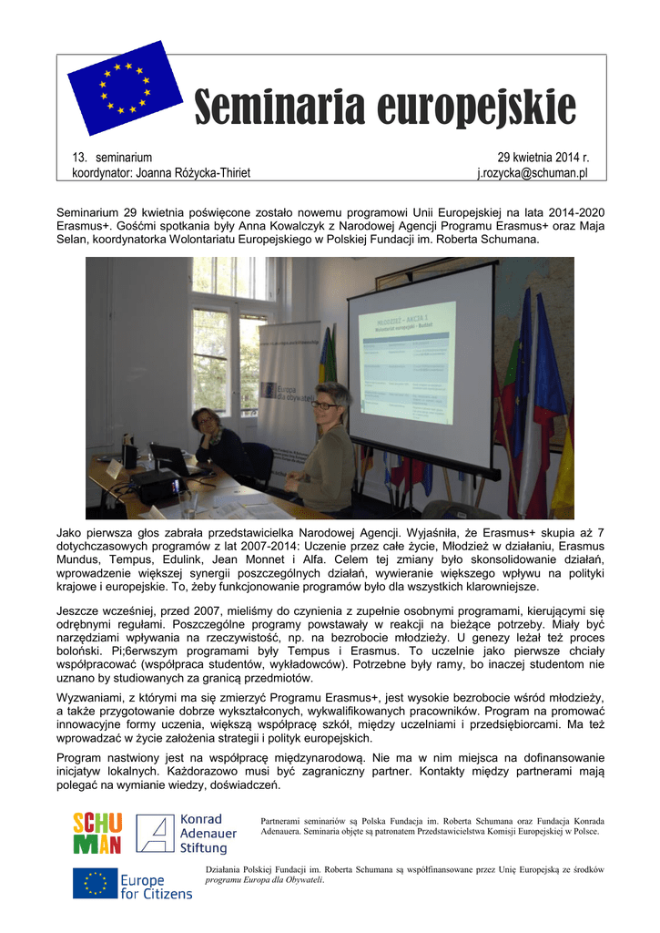 Seminaria europejskie 13. seminarium koordynator: Joanna Różycka-Thiriet 29 kwietnia 2014 r. [email protected] Seminarium 29 kwietnia poświęcone zostało nowemu programowi Unii Europejskiej na lata 2014-2020 Erasmus+. Gośćmi spotkania były Anna Kowalczyk z Narodowej Agencji Programu Erasmus+ oraz Maja Selan, koordynatorka Wolontariatu Europejskiego w Polskiej Fundacji im. Roberta Schumana. Jako pierwsza głos zabrała przedstawicielka Narodowej Agencji. Wyjaśniła, że Erasmus+ skupia aż 7 dotychczasowych programów z lat 2007-2014: Uczenie przez całe życie, Młodzież w działaniu, Erasmus Mundus, Tempus, Edulink, Jean Monnet i Alfa. Celem tej zmiany było skonsolidowanie działań, wprowadzenie większej synergii poszczególnych działań, wywieranie większego wpływu na polityki krajowe i europejskie. To, żeby funkcjonowanie programów było dla wszystkich klarowniejsze. Jeszcze wcześniej, przed 2007, mieliśmy do czynienia z zupełnie osobnymi programami, kierującymi się odrębnymi regułami. Poszczególne programy powstawały w reakcji na bieżące potrzeby. Miały być narzędziami wpływania na rzeczywistość, np. na bezrobocie młodzieży. U genezy leżał też proces boloński. Pi;6erwszym programami były Tempus i Erasmus. To uczelnie jako pierwsze chciały współpracować (współpraca studentów, wykładowców). Potrzebne były ramy, bo inaczej studentom nie uznano by studiowanych za granicą przedmiotów. Wyzwaniami, z którymi ma się zmierzyć Programu Erasmus+, jest wysokie bezrobocie wśród młodzieży, a także przygotowanie dobrze wykształconych, wykwalifikowanych pracowników. Program na promować innowacyjne formy uczenia, większą współpracę szkół, między uczelniami i przedsiębiorcami. Ma też wprowadzać w życie założenia strategii i polityk europejskich. Program nastwiony jest na współpracę międzynarodową. Nie ma w nim miejsca na dofinansowanie inicjatyw lokalnych. Każdorazowo musi być zagraniczny partner. Kontakty między partnerami mają polegać na wymianie wiedzy, doświadczeń. Partnerami seminariów są Polska Fundacja im. Roberta Schumana oraz Fundacja Konrada Adenauera. Seminaria objęte są patronatem Przedstawicielstwa Komisji Europejskiej w Polsce. Działania Polskiej Fundacji im. Roberta Schumana są współfinansowane przez Unię Europejską ze środków programu Europa dla Obywateli. W Programie Erasmus+ bierze udział 28 krajów członkowskich UE. Docelowo mają w nim brać udział także inne państwa (niektóre umowy nie zostały jeszcze podpisane): Islandia, Lichtenstein, Norwegia, Szwajcaria, Turcja, Macedonia, a także kraje partnerskie (państwa Partnerstwa Wschodniego, śródziemnomorskie, Bałkany Zachodnie, Rosja). W niektórych obszarach programu mogą też brać udział inne kraje, jeśli ich udział jest niezbędny. Erasmus+ wrzuca programy edukacyjne i młodzieżowe do jednego worka. Podzielony został na 3 akcje. Akcja 1 to wyjazdy w celach edukacyjnych (wolontariat, stypendia, staże), Akcja 2 to długotrwała współpraca instytucji (organizacji młodzieżowych, uczelni i pracodawców, władz lokalnych itd.), które wypracowują wspólne rezultaty. Akcja 3 to wsparcie dla reform edukacyjnych (projekty z udziałem decydentów zajmujących się edukacją; projekty wpływające na władze, od których zależy polityka edukacyjna). Erasmus+ zakłada, że ludzie wyjeżdżają, żeby się czegoś nauczyć i wracają do swojego kraju. Budżet programu na lata 2014-2020 to 14,7 mld euro. Jest to wzrost o 40% w stosunku do wcześniejszych programów. Widać, ze działania tego typu są ważne dla Komisji Europejskiej. Z tej kwoty 77% idzie na szkolenia i kształcenie, 10% na młodzież. Natomiast Akcja 1 to 63% całego budżetu. Następnie Anna Kowalczyk omówiła ofertę programu w dwóch obszarach – szkolnictwa wyższego i młodzieży. Co do szkolnictwa wyższego, od razu zapewniła, że wyjazdy na zagraniczne stypendia nadal będą możliwe. Ale najpierw uczelnie korzystające z dobrodziejstw programu muszą mieć „Kartę Erasmusa”, akredytację. Co do zagranicznych stypendiów, kiedyś można było wyjechać tylko raz. Teraz będzie to możliwe kilka razy pod warunkiem, że stypendia nie przekroczą dozwolonej długości (okres stypendiów nie może łącznie przekroczyć 12 miesięcy w przypadku licencjatu, 12 miesięcy w przypadku studiów magisterskich, 24 miesięcy w przypadku studiów jednolitych oraz 12 miesięcy dla doktorantów). Wysyła macierzysta uczelnia, na którą się potem wraca. Uczelnie wprowadzają własne kryteria określające, kto może być stypendystą. Jednak uczelnie wyższe nie będą już mogły zmieniać wysokości stypendiów. Stawki na utrzymanie i koszty podróży będą sztywne. Wcześniej uniwersytety zaniżały czasem stypendia, żeby móc wysłać większą liczbę osób. Ponadto, stypendium musi być wypłacane przez cały okres wyjazdu. Wcześniej zdarzało się, że stypendium kończyło się w trakcie pobytu studenta zagranicą (uczelnia przymykała oko, że student zostawał na dłużej). Stawki zależeć będą od kraju ojczystego i kraju wyjazdu. Nowością jest to, że absolwenci też mogą wyjechać na Erasmusa, jeśli powrót będzie miał miejsce przed upłynięciem roku od ukończenia uczelni. Jak stwierdziła przedstawicielka Agencji, chodzi tu jednak raczej o możliwość wyjazdu na praktyki, a nie na zajęcia na uczelni (Erasmus+ oferuje studentom również możliwość odbycia praktyki w przedsiębiorstwach). Taki absolwent musi zostać zakwalifikowany na wyjazd jeszcze jako student. Praktyki mogą trwać od 2 do 12 miesięcy, a stypendia studenckie od 3 do 12 miesięcy. Przewidziano też wspólne studia drugiego stopnia (Joint Masters Degree) oraz system gwarancji spłaty pożyczek zaciągniętych w celu zrealizowania studiów drugiego stopnia za granicą. Odnośnie tego ostatniego, aktualnie wyłaniane są banki, które będą wchodzić w ten