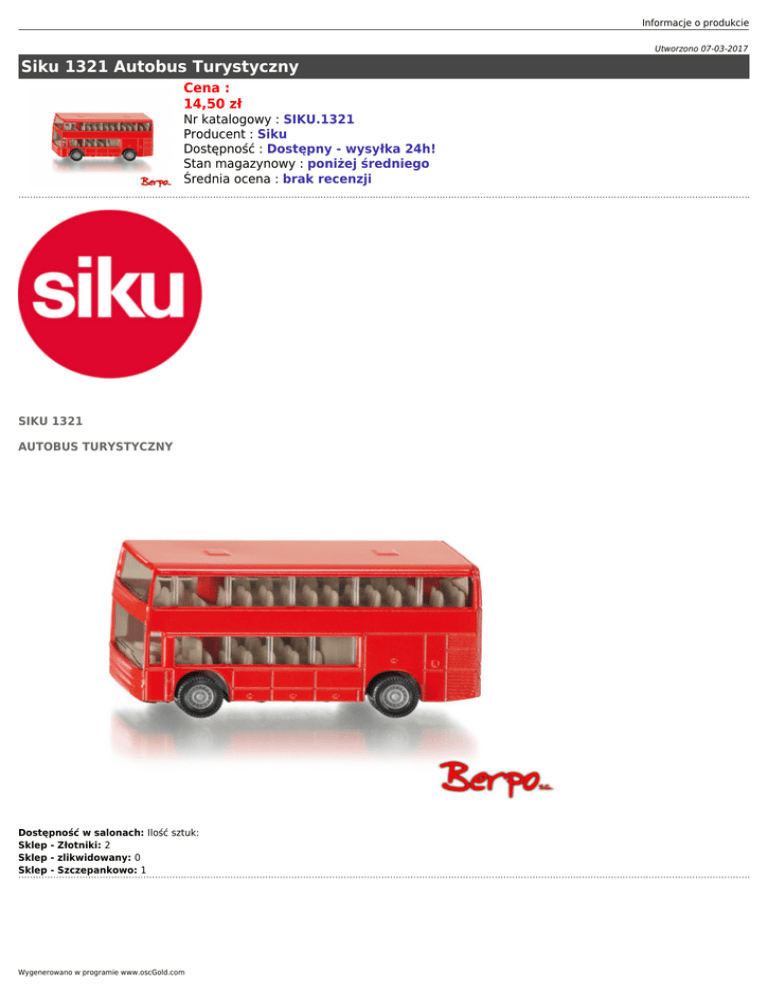 Informacje o produkcie Utworzono 07-03-2017 Siku 1321 Autobus Turystyczny Cena : 14,50 zł Nr katalogowy : SIKU.1321 Producent : Siku Dostępność : Dostępny - wysyłka 24h! Stan magazynowy : poniżej średniego Średnia ocena : brak recenzji SIKU 1321 AUTOBUS TURYSTYCZNY Dostępność w salonach: Ilość sztuk: Sklep - Złotniki: 2 Sklep - zlikwidowany: 0 Sklep - Szczepankowo: 1 Wygenerowano w programie www.oscGold.com