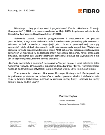 Roczyny, dn.15.12.2015 Niniejszym chcę podziękować i pogratulować Firmie „Akademia Rozwoju Umiejętności” ( ARU ) za przeprowadzone w Maju 2015, trzydniowe szkolenie dla Doradców Techniczno-Handlowych firmy FIBRO. Szkolenie zostało idealnie przygotowane i dostosowane do potrzeb pracowników, a ogromne doświadczenie i wiedza osób prowadzących zarówno z zakresu technik sprzedaży, negocjacji jak i branży przemysłowej pomogły zrozumieć wiele dotąd nieznanych bądź nierozumianych zagadnień. Wyjątkowo ciekawa formuła przeprowadzonego przez ARU szkolenia, pokazała zastosowanie zawartych w nim treści w codziennej pracy. Od czasu szkolenia, nawet stresujące sytuacje, spotkania czy „trudni” partnerzy biznesowi okazują się wyzwaniem a nie jak to często bywało: „murem” nie do przejścia. „Techniki sprzedaży i sprzedaż perswazyjna” to już drugie z kolei szkolenie jakie Akademia Rozwoju Umiejętności przeprowadziła dla firmy FIBRO. Potwierdzeniem naszego zadowolenia i satysfakcji jest planowane w roku 2016 kolejne szkolenie. Zdecydowanie polecam Akademię Rozwoju Umiejętności! Profesjonalizm, indywidualne podejście do problemów a także ogromna wiedza i doświadczenie m.in. w branży technicznej, pomogą w rozwoju każdej firmy i sprawią że każdy dzień w pracy będzie udany! Marcin Piętka Doradca Techniczny Elementy Znormalizowane FIBRO FIBRO GmbH · Werk 2 August-Läpple-Weg D-74855 Hassmersheim Postfach 1120 D-74851 Hassmersheim Kontakt T +49 6266 73-0 F +49 6266 73-237 [email protected] www.fibro.com Bankverbindung Kreissparkasse Heilbronn (BLZ 62050000) Konto-Nr. 013603339 SWIFT-Code: HEIS DE 66 · IBAN DE20620500000013603339 Deutsche Bank AG Heilbronn (BLZ 62070081) Konto-Nr. 012077400 SWIFT-Code: DEUT DESS 620 · IBAN DE81620700810012077400 Volksbank Heilbronn (BLZ 62090100) Konto-Nr. 116844000 SWIFT-Code: GENO DESG Handelsregister HRB 100248 Stuttgart Steuernummer 65200/38903 USt.-ID.Nr. DE145764961 Geschäftsführung Jürgen Gurt