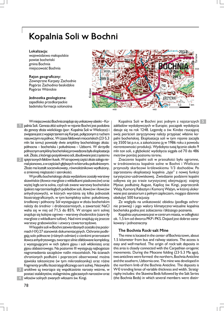 Kopalnia Soli w Bochni Jednostka geologiczna: zapadlisko przedkarpackie badeñska formacja solonoœna 5538 Kraków Rejon geograficzny: Zewnêtrzne Karpaty Zachodnie Pogórze Zachodnio-beskidzkie Pogórze Wiœnickie Tarnów Lokalizacja: województwo ma³opolskie powiat bocheñski gmina Bochnia miejscowoœæ Bochnia W miejscowoœci Bochnia znajduje siê unikatowy obiekt – Ko1 palnia Soli. Geneza z³ó¿ solnych w rejonie Bochni jest podobna do genezy z³o¿a wielickiego (por. Kopalnia Soli w Wieliczce) i zwi¹zana jest z wypiêtrzaniem siê Karpat, po³¹czonym z ruchem nasuwczym na pó³noc. W czasie fa³dowañ mioceñskich (23-5,3 mln lat temu) powsta³y dwie antykliny bocheñskiego z³o¿a: pó³nocna – bocheñska i po³udniowa – Uzborni. W skrzydle pó³nocnym antykliny bocheñskiej prowadzona by³a eksploatacja soli. Z³o¿e, z którego pozyskiwano sól, zbudowane jest z systemu 2 spiêtrzonych fa³dów i ³usek. W stropowej czêœci z³o¿e zalega niemal pionowo, a w czêœciach g³êbszych w kierunku po³udniowym. Z³o¿e ma kszta³t soczewkowaty, równole¿nikowo wyd³u¿ony, o zmiennej mi¹¿szoœci i szerokoœci. W profilu bocheñskiego z³o¿a wydzielone zosta³y warstwy skawiñskie (i³owce margliste z wk³adkami piaskowców) oraz wy¿ej leg³a seria solna, czyli tak zwane warstwy bocheñskie (pakiet naprzemianleg³ych pok³adów soli, i³owców i i³owców anhydrytowych), w których wyró¿nia siê kilka jednostek litostratygraficznych, w tym kompleksy solne: po³udniowy, œrodkowy i pó³nocny. Sól wystêpuj¹ca w z³o¿u bocheñskim nale¿y do œrednio- i drobnoziarnistych, a zawartoœæ NaCl waha siê w niej od 71,5 do 85%. W stropie serii solnej znajduje siê kolejne ogniwo – warstwy chodenickie (szare i³y margliste z wk³adkami tufów). Nad nimi znajduj¹ siê jeszcze warstwy grabowieckie i utwory czwartorzêdowe. W kopalni soli w Bochni zatwierdzonych zosta³o (na poziomach I-IX) 27 stanowisk dokumentacyjnych. Ochronie podlegaj¹ sole pó³nocne (ró¿nych odmian) z cienkimi przerostami i³owca anhydrytowego, tworz¹ce silnie sfa³dowane kompleksy, z wystêpuj¹cymi w nich ¿y³ami gipsu i soli w³óknistej oraz gipsu alabastrowego. Na poziomie III wystêpuj¹ najbogatsze nagromadzenia szcz¹tków roœlin mioceñskich. Na œcianach chronionych pod³u¿ni i poprzeczni obserwowaæ mo¿na zjawiska tektoniczne (w tym mikrotektonikê) oraz ró¿ne fragmenty profilu litostratygraficznego serii solnej. Niezwykle 3 urokliwe s¹ tworz¹ce siê wspó³czeœnie narosty wtórne, w postaci stalaktytów, stalagmitów, g¹bczastych narostów oraz 4 w³osów solnych zwanych w³osami œw. Kingi. 78 4458 4460 Kopalnia Soli w Bochni jest jednym z najstarszych 5 zak³adów wydobywczych w Europie; pocz¹tek wydobycia datuje siê na rok 1248. Legendê o œw. Kindze rzucaj¹cej swój pierœcieñ zarêczynowy nale¿y przypisaæ w³aœnie kopalni bocheñskiej. Eksploatacja soli w tym rejonie zaczê³a siê 3500 lat p.n.e, a zakoñczono j¹ w 1986 roku z powodu nierentownoœci produkcji. Wydobyto tutaj ³¹cznie oko³o 9 mln ton soli, a g³êbokoœæ wydobycia siêga³a od 70 do 486 metrów poni¿ej poziomu terenu. Znaczenie kopalni soli w przesz³oœci by³o ogromne, w œredniowieczu kopalnie solne w Bochni i Wieliczce przynosi³y skarbcowi królewskiemu 1/3 dochodów. Po zaprzestaniu eksploatacji kopalnia „¿yje” z nowej funkcji turystyczno-uzdrowiskowej. Zwiedzanie podziemi kopalni odbywa siê po trasie turystycznej obejmuj¹cej: stajniê Mysiur, pod³u¿niê August, Kaplicê œw. Kingi, poprzecznik Wa¿y, Komorê Rabsztyn i Komorê Wa¿yn, w której ulokowane jest sanatorium z pe³nym zapleczem, mog¹ce dziennie obs³u¿yæ 500 kuracjuszy. Ze wzglêdu na unikatowoœæ obiektu (podlega ochronie prawnej) i jego walory klimatyczno-wizualne kopalnia bocheñska godna jest zobaczenia i bli¿szego poznania. Kopalnia usytuowana jest w centrum miasta, w odleg³oœci ok. 1,5 km od dworca PKP i PKS. Dojazd jest dobrze oznakowany i jednoznaczny. The Bochnia Rock-salt Mine The mine is located in the center of Bochnia town, about 1.5 kilometer from bus and railway stations. The access is easy and well-marked. The origin of rock-salt deposits in this area is closely connected with the Carpathian orogenic movements. During the Miocene folding (23-5.3 Ma ago), two anticlines were formed: the northern, Bochnia Anticline and the southern, Uzbornia one. The mine was developed in the northern limb of the Bochnia Anticline. The deposits is W-E-trending lense of variable thickness and width. Stratigraphy includes: the Skawina Beds followed by the Salt Series (the Bochnia Beds) in which several members were distin- Bochnia guished, among others the southern, central and northern salt complexes. The rock-salt from the Bochnia deposit is medium- and fine-crystalline, and NaCl contents vary from 71.5 to 85%. The Salt Series is covered by the Chodenice Beds, the Grabowiec Beds and the Quaternary. At the mine 27 documentation sites were established at 9 mining levles. Protected are: strongly folded northern salt complex (several varieties) with thin interbeds of anhydritic claystone and veins of gypsum, fibrous halite and alabaster. At the Level III most abundant accumulations of Miocene fossil plants were found. In the walls of underground workings the tectonic features can be observed (including microtectonics) together with several fragments of lithostratigraphic members. Charming are recent, secondary precipitates: stalactites, stalagmites, spongeous halite accumulations and fibrous halite called “the hair of St. Kinga”. The Bochnia rock-salt mine belongs to the oldest mining sites in Europe. The written history of mining activity dates back to 1248 but salt has been extracted in Bochnia area since 3,500 years B.C. In 1986 the mine was closed due to economic reasons. Cummulative tonnage of halite extracted from the depth interval 70-486 meters below surface reaches 9 million tonnes. The underground 