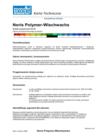 Karta Techniczna PIELĘGNACJA PODŁÓG Noris Polymer-Wischwachs Środek czystości kod: GU 40 Zakres pH skoncetrownego produktu: Charakterystyka: Skoncentrowany wosk o świeżym zapachu na bazie wosków polietylenowych i dyspersji. Odpowiednio dobrane substancje powierzchniowo czynne zapewniają znakomite rozprowadzanie produktu i powodują, że podczas zmywania nie tworzą się smugi. Zakres stosowania / przeznaczenie: Noris Polymer-Wischwachs nadaje się doskonale do codziennego utrzymywania czystości i pielęgnacji podłóg, na które nałożono środki dyspersyjne (np. Noris Supersol metallic). Dzięki ogromnej łatwości polerownia można go stosowad również bez problemu do wszystkich polerowanych kamieni. Przygotowanie miejsca pracy: Sprawdzid, czy powierzchnia podłogi jest odporna na działanie wody. Podłogi drewniane przecierad jedynie lekko zwilżoną ścierką. Stosowanie: Dozowanie: w celu zwykłego utrzymania czystości powierzchni wystarczy ok. 200 ml środka na 10 l wody. Stosowanie: podłogi odporne na działanie wody można przecierad zarówna na mokro, jak i tylko wilgotną ścierką. Podłogi drewniane przeciera się zasadniczo tylko na wilgotno. Po zastosowaniu środka nie wolno przecierad powierzchni wodą, ponieważ spowoduje to usunięcie powłoki ochronnej. Identyfikacja zagrożeo dla zdrowia: Stosując produkt zgodnie z przeznaczeniem nie ma żadnych zagrożeo dla zdrowia. Należy przestrzegad zwykłych reguł dotyczących obchodzenia się z chemikaliami. Produkt na podstawie przedłożonych nam danych zgodnie z ustawami o chemikaliach lub substancjach niebezpiecznych / wytyczne WE 67/548/EWG, w ich obecnie aktualnym ujęciu nie stanowi niebezpiecznej substancji lub preparatu. Strona 1 z 4 Stan: marzec 2006 Noris Polymer-Wischwachs Karta Techniczna Skład: Woski polietylenowe, dyspersja akrylowa, substancje powierzchniowo czynne, substancje pielęgnacyjne, zapachowe i pomocnicze. Środki zapobiegawcze: W miejscu pracy nie należy przechowywad żadnych artykułów spożywczych, ani jeśd, pid, zażywad tabaki czy palid! Unikad kontaktu z oczami, skórą i ubraniem! Po zakooczeniu pracy i przed pójściem na przerwę należy dokładnie umyd ręce! Zabrudzone ubrania przebrad i wyczyścid! Techniczne i organizacyjne środki ochronne: Nie wolno mieszad z innymi produktami i chemikaliami. Przy przelewaniu do innych pojemników, uważad by nie pryskad środkiem. W miejscu pracy powinno się zapewnid możliwośd umycia się. Mied w pobliżu butelkę z wodą w razie konieczności przepłukania oczu. Środki ochrony osobistej: Ochrona oczu: unikad kontaktu z oczami. Ochrona rąk: częsty kontakt, szczególnie po zaschnięciu może prowadzid do podrażnieo skóry. Stosując skoncentrowany produkt zalecamy noszenie gumowych rękawic ochronnych. Zaleca się również stosowanie pod rękawice gumowe rękawic bawełnianych. Ochrona skóry: wszystkie niezakryte części ciała należy chronid stosując tłusty krem do ciała! Pierwsza pomoc: Udzielając pierwszej pomocy należy dbad o własne bezpieczeostwo (np. stosując rękawiczki ochronne, czy ochronę górnych dróg oddechowych)!. Po dostaniu się do oczu: przez 10 minut spłukiwad pod bieżącą woda przy otwartych powiekach lub zakropid środek do płukania oczu. W razie utrzymujących się dolegliwości skontaktowad się z okulistą. Po kontakcie ze skórą: zdjąd zabrudzone ubranie. Wyczyścid dużą ilością wody i mydła. Nie stosowad rozcieoczalników itp. Strona 2 z 4 Stan: marzec 2006 Noris Polymer-Wischwachs Karta Techniczna W razie połknięcia: Nie wywoływad wymiotów (zagrożenie aspiracji) Pid małymi łykami dużo wody. Udad się do lekarza. W żadnym razie nie należy podawad domowych środków mleka lub alkoholu itp.! Dane techniczne: Wygląd: Zapach: Gęstośd: Wartośd pH: Rozpuszczalnośd w wodzie: płynny, mleczno-biały (zabarwiony czerwonobrązowy) słaby ~1,0 ~8 dowolnie rozpuszczalny (mieszany) również czarny lub Transport substancji niebezpiecznych: Produkt nie stanowi substancji niebezpiecznej w rozumieniu Rozporządzenia o substancjach niebezpiecznych i nie podlega ADR/RID 2005. Usuwanie odpadów: Woski i polimery zawarte w produkcie po dostaniu się do ścieków wytrącają płatki i nie powodują żadnego zauważalnego zużycia tlenu. Zawarte w produkcie substancje powierzchniowo czynne są zgodnie z VwVwS (przepisy dotyczące substancji stanowiących zagrożenie dla wody) z dnia 17.05.99 biodegradowalne. Klasa zagrożenia dla wody: 1 UBA 0389 013 Nie dopuścid by nierozcieoczony środek dostał się do kanalizacji! Nie mieszad odpadów! By była możliwa zgodna z przepisami ich utylizacja bądź pozyskanie, należy składowad je oddzielnie w wytrzymałych, zamykanych i oznakowanych pojemnikach. Pozostałości środka należy dostarczyd zgodnie z miejscowymi przepisami do miejsca utylizacji odpadów. Mogące mied zastosowanie przepisy EAK: 07 06 99 Odpady z produkcji, przygotowania, obrotu i stosowania tłuszczów, natłustek, mydeł, detergentów, środków dezynfekujących i kosmetyków i in. nie wymienione Składowanie: Po przelaniu do innych pojemników niż oryginalne należy oznakowad je tak jak oryginalne. Jak wszystkie detergenty należy przechowywad je z dala od dzieci. Strona 3 z 4 Stan: marzec 2006 Noris Polymer-Wischwachs Karta Techniczna Obsługa: nie są konieczne żadne szczególne środki. Wskazówki dotyczące ochrony przeciwpożarowej i ochrony przed eksplozją: nie są konieczne żadne szczególne środki Składowanie: Wymagania co do powierzchni magazynowych i pojemników: nie są konieczne żadne szczególne środki Wskazówki dotyczące składowania z innymi substancjami: nie są konieczne żadne szczególne środki Klasa zagrożenia VbF: nie dotyczy Trwałośd: w oryginalnych nieotwieranych pojemnikach przynajmniej 24 miesiące Klasa magazynowania: 12 – nie palne płyny Warunki składowania: nie są konieczne żadne szczególne środki Temperatura składowania