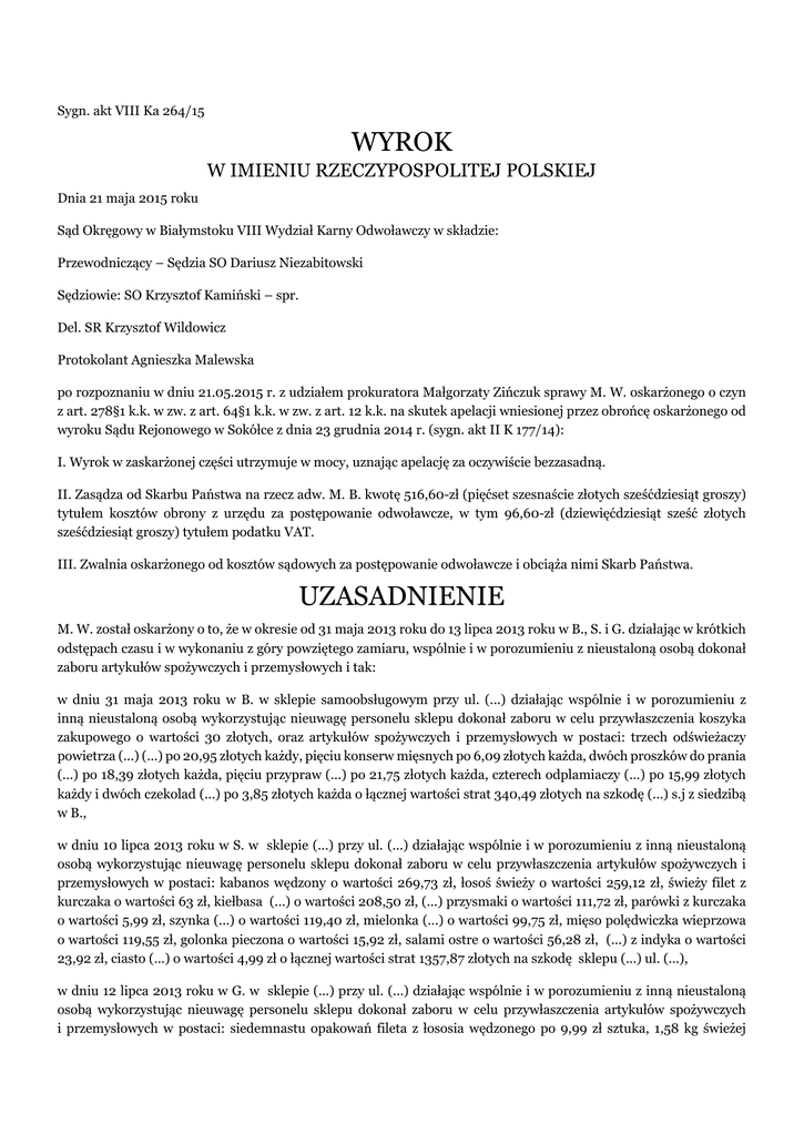 Sygn. akt VIII Ka 264/15 WYROK W IMIENIU RZECZYPOSPOLITEJ POLSKIEJ Dnia 21 maja 2015 roku Sąd Okręgowy w Białymstoku VIII Wydział Karny Odwoławczy w składzie: Przewodniczący – Sędzia SO Dariusz Niezabitowski Sędziowie: SO Krzysztof Kamiński – spr. Del. SR Krzysztof Wildowicz Protokolant Agnieszka Malewska po rozpoznaniu w dniu 21.05.2015 r. z udziałem prokuratora Małgorzaty Zińczuk sprawy M. W. oskarżonego o czyn z art. 278§1 k.k. w zw. z art. 64§1 k.k. w zw. z art. 12 k.k. na skutek apelacji wniesionej przez obrońcę oskarżonego od wyroku Sądu Rejonowego w Sokółce z dnia 23 grudnia 2014 r. (sygn. akt II K 177/14): I. Wyrok w zaskarżonej części utrzymuje w mocy, uznając apelację za oczywiście bezzasadną. II. Zasądza od Skarbu Państwa na rzecz adw. M. B. kwotę 516,60-zł (pięćset szesnaście złotych sześćdziesiąt groszy) tytułem kosztów obrony z urzędu za postępowanie odwoławcze, w tym 96,60-zł (dziewięćdziesiąt sześć złotych sześćdziesiąt groszy) tytułem podatku VAT. III. Zwalnia oskarżonego od kosztów sądowych za postępowanie odwoławcze i obciąża nimi Skarb Państwa. UZASADNIENIE M. W. został oskarżony o to, że w okresie od 31 maja 2013 roku do 13 lipca 2013 roku w B., S. i G. działając w krótkich odstępach czasu i w wykonaniu z góry powziętego zamiaru, wspólnie i w porozumieniu z nieustaloną osobą dokonał zaboru artykułów spożywczych i przemysłowych i tak: w dniu 31 maja 2013 roku w B. w sklepie samoobsługowym przy ul. (...) działając wspólnie i w porozumieniu z inną nieustaloną osobą wykorzystując nieuwagę personelu sklepu dokonał zaboru w celu przywłaszczenia koszyka zakupowego o wartości 30 złotych, oraz artykułów spożywczych i przemysłowych w postaci: trzech odświeżaczy powietrza (...) (...) po 20,95 złotych każdy, pięciu konserw mięsnych po 6,09 złotych każda, dwóch proszków do prania (...) po 18,39 złotych każda, pięciu przypraw (...) po 21,75 złotych każda, czterech odplamiaczy (...) po 15,99 złotych każdy i dwóch czekolad (...) po 3,85 złotych każda o łącznej wartości strat 340,49 złotych na szkodę (...) s.j z siedzibą w B., w dniu 10 lipca 2013 roku w S. w sklepie (...) przy ul. (...) działając wspólnie i w porozumieniu z inną nieustaloną osobą wykorzystując nieuwagę personelu sklepu dokonał zaboru w celu przywłaszczenia artykułów spożywczych i przemysłowych w postaci: kabanos wędzony o wartości 269,73 zł, łosoś świeży o wartości 259,12 zł, świeży filet z kurczaka o wartości 63 zł, kiełbasa (...) o wartości 208,50 zł, (...) przysmaki o wartości 111,72 zł, parówki z kurczaka o wartości 5,99 zł, szynka (...) o wartości 119,40 zł, mielonka (...) o wartości 99,75 zł, mięso polędwiczka wieprzowa o wartości 119,55 zł, golonka pieczona o wartości 15,92 zł, salami ostre o wartości 56,28 zł, (...) z indyka o wartości 23,92 zł, ciasto (...) o wartości 4,99 zł o łącznej wartości strat 1357,87 złotych na szkodę sklepu (...) ul. (...), w dniu 12 lipca 2013 roku w G. w sklepie (...) przy ul. (...) działając wspólnie i w porozumieniu z inną nieustaloną osobą wykorzystując nieuwagę personelu sklepu dokonał zaboru w celu przywłaszczenia artykułów spożywczych i przemysłowych w postaci: siedemnastu opakowań fileta z łososia wędzonego po 9,99 zł sztuka, 1,58 kg świeżej polędwiczki po 25,99 zł za kg, dziewięciu opakowań bekonu rolowanego po 7,99 zł sztuka, trzech opakowań pieczywa po 4,79 zł sztuka, 2,48 kg boczku wędzonego po 16,90 zł za kg, pięć opakowań kiełbasy (...) po 10,99 zł, dwóch opakowań płatków H. po 3,99 zł, czterech opakowań mięsa mielonego po 7,99 zł, dwóch opakowań tostów pszennych o wartości 2,25 zł, trzech sztuk kwiatu B. po 18,99 zł, torba izolacyjna o wartości 2,49 zł o łącznej wartości 495,44 zł na szkodę sklepu (...) ul. (...) G., w dniu 13 lipca 2013 roku w S. w sklepie (...) przy ul. (...) działając wspólnie i w porozumieniu z inną nieustaloną osobą wykorzystując nieuwagę personelu sklepu dokonał zaboru w celu przywłaszczenia artykułów spożywczych i przemysłowych w postaci: mięso polędwiczka wieprzowa o wartości 121,76 zł, bułka (...) francuski o wartości 4,59 zł, mięso kurczak wieprzowy bez kości o wartości 52,45 zł, mięso schab wieprzowy bez kości o wartości 39,90 zł, filet z łososia świeży o wartości 71,10 zł, torba izolacyjna o wartości 2,49 zł, płatki (...) o wartości 5,58 zł, boczek wędzony „(...)" o wartości 16,90 zł, płyn do prania (...) 31 o wartości 69,95 zł, płyn pod prysznic (...) o wartości 13,98 zł, proszek (...) regular o wartości 55,98 zł, piwo (...)-pak o wartości 13,99 zł, fluid maskujący o wartości 69.93 zł, rajstopy (...) o wartości 27,93 zł, kawa rozpuszczalna (...) clasic o wartości 18,49 zł, herbata (...) o wartości 11,45 zł, brzoskwinie w syropie puszka o wartości 3,99 zł, skarpety męskie o wartości 5,98 zł o łącznej wartości strat 606,44 zł na szkodę sklepu (...) ul. (...) (...)-(...) S., przy czym czynu tego dopuścił się w ciągu pięciu lat po odbyciu kary co najmniej sześciu miesięcy pozbawienia wolności orzeczonej za umyślne przestępstwo podobne, tj. o czyn z art. 278§1 k.k. w zw. z art. 64§1 k.k. w zw. z art. 12 k.k. Sąd Rejonowy w Sokółce wyrokiem z dnia 23 grudnia 2014 r. w sprawie o sygn. akt II K 177/14 przyjmując, że oskarżony działał wspólnie i w porozumieniu z inną ustaloną osobą, uznał oskarżonego M. W. za winnego popełnienia zarzuconego mu czynu i za to na mocy art. 278§1 k.k. w zw. z art. 64§1 k.k. w zw. z art. 12 k.k. skazał go na karę 1 (jednego) roku pozbawienia wolności. Na mocy art. 46§1 k.k. zobowiązał oskarżonego do naprawienia wyrządzonej szkody w całości poprzez zapłatę na rzecz pokrzywdzonych: - (...) s.j z siedzibą w B. - kwoty 340,49 zł (trzystu czterdziestu złotych, czterdziestu