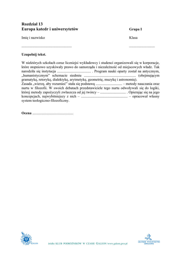 Rozdział 13 Europa katedr i uniwersytetów Grupa I Imię i nazwisko Klasa ....................................................... ............................ Uzupełnij tekst. W niektórych szkołach coraz liczniejsi wykładowcy i studenci organizowali się w korporacje, które stopniowo uzyskiwały prawo do samorządu i niezależność od miejscowych władz. Tak narodziła się instytucja ..................................... . Program nauki oparty został na antycznym, „humanistycznym” schemacie siedmiu ......................................................... (obejmującym gramatykę, retorykę, dialektykę, arytmetykę, geometrię, muzykę i astronomię). Zasada „wierzę, aby rozumieć” stała się podstawą ............................. – metody nauczania oraz nurtu w filozofii. W swoich debatach przedstawiciele tego nurtu odwoływali się do logiki, której metody zapożyczyli zwłaszcza od jej twórcy – ............................ . Opierając się na jego koncepcjach, najwybitniejszy z nich – ................................................... – opracował własny system teologiczno-filozoficzny. Ocena ............................................. źródło: KLUB PODRÓŻNIKÓW W CZASIE GALEON /www.galeon.gwo.pl