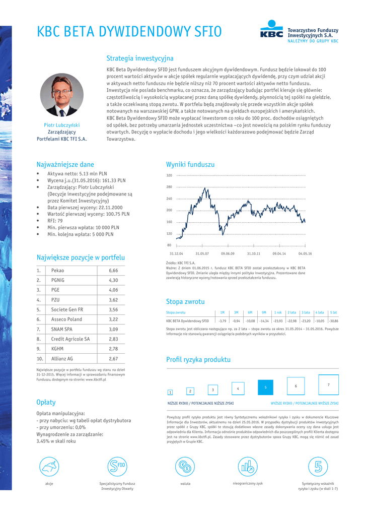 KBC BETA DYWIDENDOWY SFIO Strategia inwestycyjna Piotr Lubczyński Zarządzający Portfelami KBC TFI S.A. KBC Beta Dywidendowy SFIO jest funduszem akcyjnym dywidendowym. Fundusz będzie lokował do 100 procent wartości aktywów w akcje spółek regularnie wypłacających dywidendę, przy czym udział akcji w aktywach netto funduszu nie będzie niższy niż 70 procent wartości aktywów netto funduszu. Inwestycja nie posiada benchmarku, co oznacza, że zarządzający budując portfel kieruje się głównie: częstotliwością i wysokością wypłacanej przez daną spółkę dywidendy, płynnością tej spółki na giełdzie, a także oczekiwaną stopą zwrotu. W portfelu będą znajdowały się przede wszystkim akcje spółek notowanych na warszawskiej GPW, a także notowanych na giełdach europejskich i amerykańskich. KBC Beta Dywidendowy SFIO może wypłacać inwestorom co roku do 100 proc. dochodów osiągniętych od spółek, bez potrzeby umarzania jednostek uczestnictwa –co jest nowością na polskim rynku funduszy otwartych. Decyzję o wypłacie dochodu i jego wielkości każdorazowo podejmować będzie Zarząd Towarzystwa. Najważniejsze dane • • • • • • • • Wyniki funduszu Aktywa netto: 5.13 mln PLN Wycena j.u.(31.05.2016): 161.33 PLN Zarządzający: Piotr Lubczyński (Decyzje inwestycyjne podejmowane są przez Komitet Inwestycyjny) Data pierwszej wyceny: 22.11.2000 Wartość pierwszej wyceny: 100.75 PLN RFI: 79 Min. pierwsza wpłata: 10 000 PLN Min. kolejna wpłata: 5 000 PLN 320 280 240 200 160 120 80 Największe pozycje w portfelu 1. Pekao 6,66 2. PGNiG 4,30 3. PGE 4,06 4. PZU 3,62 5. Societe Gen FR 3,56 6. Asseco Poland 3,22 7. SNAM SPA 3,09 8. Credit Agricole SA 2,83 9. KGHM 2,78 10. Allianz AG 2,67 31.12.04 31.05.07 09.06.09 31.10.11 09.04.14 04.05.16 Żródło: KBC TFI S.A. Ważne: Z dniem 01.06.2015 r. fundusz KBC BETA SFIO został przekształcony w KBC BETA Dywidendowy SFIO. Zmianie uległa między innymi polityka inwestycyjna. Prezentowane dane zawierają historyczne wyceny/notowania sprzed przekształcenia funduszu. Stopa zwrotu Stopa zwrotu KBC BETA Dywidendowy SFIO 1M 3M 6M 9M 1 rok 2 lata 3 lata 4 lata 5 lat -3,79 -0,94 -10,08 -14,34 -23,93 -22,98 -23,20 -10,05 -30,86 Stopa zwrotu jest obliczana następująco np. za 2 lata – stopa zwrotu za okres 31.05.2014 - 31.05.2016. Powyższe informacje nie stanowią gwarancji osiągnięcia podobnych wyników w przyszłości. Profil ryzyka produktu Największe pozycje w portfelu funduszu wg stanu na dzień 31-12-2015. Więcej informacji w sprawozdaniu finansowym Funduszu, dostępnym na stronie: www.kbctfi.pl Opłaty NIŻSZE RYZKO / POTENCJALNIE NIŻSZE ZYSKI Opłata manipulacyjna: - przy nabyciu: wg tabeli opłat dystrybutora - przy umorzeniu: 0,0% Wynagrodzenie za zarządzanie: 3.45% w skali roku Powyższy profil ryzyka produktu jest równy Syntetycznemu wskaźnikowi ryzyka i zysku w dokumencie Kluczowe Informacje dla Inwestorów, aktualnemu na dzień 25.05.2016. W przypadku dystrybucji produktów inwestycyjnych przez spółki z Grupy KBC, spółki te stosują dodatkowo własne zasady dokonywania oceny czy dana usługa jest odpowiednia dla Klienta. Informacja odnośnie produktów odpowiednich dla poszczególnych profili Klienta dostępna jest na stronie www.kbctfi.pl. Zasady stosowane przez dystrybutorów spoza Grupy KBC, mogą się różnić od zasad przyjętych w Grupie KBC. akcje Specjalistyczny Fundusz Inwestycyjny Otwarty waluta nieograniczony zysk WYŻSZE RYZKO / POTENCJALNIE WYŻSZE ZYSKI Syntetyczny wskaźnik ryzyka i zysku (w skali 1-7) KBC BETA DYWIDENDOWY SFIO Struktura portfela funduszu AKCJE – 97,75% AKTYWA W WALUTACH – 1,93% OBLIGACJE SKARBOWE I GWARANTOWANE PRZEZ SP – 0,32% Struktura walutowa PLN – 67,1% EUR – 30,8% CHF – 2,0% Struktura geograficzna Struktura sektorowa dla części akcyjnej POLSKA – 66,4% F INANSE – 24,2% NIEMCY – 14,4% USŁUGI KOMUNALNE – 17,8% FRANCJA – 6,5% DOBRA LUKSUSOWE – 12,0% HOLANDIA – 3,5% MATERIAŁY – 11,2% WŁOCHY – 3,3% ENERGETYKA – 10,4% SZWAJCARIA – 2,0% PRZEMYSŁ – 6,5% UNIA EUROPEJSKA – 1,9% TECHNOLOGIE INFORMACYJNE – 6,5% HISZPANIA – 1,2% DOBRA PODSTAWOWE – 6,1% LITWA – 0,7% USŁUGI TELEKOMUNIKACYJNE – 5,3% ŹRÓDŁO: OBLICZENIA WŁASNE KBC TFI S.A., DANE NA 31.05.2016 R. KBC Towarzystwo Funduszy Inwestycyjnych S.A. Informacje Podstawowe: Siedziba: ul. Chmielna 85/87, 00-805 Warszawa Kontakt: [email protected]; infolinia: (22) 582 88 58 Aktywa w zarządzaniu: 4,4 mld PLN (stan na 31.12.2015) Akcjonariusz: 100% KBC Asset Management Data powstania: 20.04.2005 r.; połączenie WARTA TFI S.A., WARTA AM S.A., TFI KB S.A., KB ZA S.A. Zezwolenie Komisji Nadzoru Finansowego z dn. 14.05.2002, decyzja nr DFN1 - 4030–23-1/02-1452 Gdzie kupić fundusze KBC TFI? informacja na www.kbctfi.pl WAŻNE INFORMACJE Wypłata dochodu obniża wartość wyceny jednostki uczestnictwa w dniu, w którym ustalone jest prawo do dywidendy. Decyzję o wypłacie dochodu i jego wielkości podejmuje Zarząd Towarzystwa, kierując się następującymi czynnikami: wysokością uzyskanych dochodów, płynnością finansową Funduszu w ciągu trzech kolejnych miesięcy od dnia uzyskania dochodów, możliwościami inwestycyjnymi związanymi z inwestowaniem w dopuszczalne kategorie lokat oraz projektowanymi w najbliższym roku kalendarzowym kosztami działalności Funduszu. Subfundusz nie gwarantuje osiągnięcia celu inwestycyjnego ani uzyskania określonego wyniku inwestycyjnego. Uczestnik subfunduszu musi liczyć się z możliwością utraty przynajmniej części wpłaconych środków. Ze względu na dużą ekspozycję portfela na rynek akcji oraz ryzyko walutowe, Subfundusz charakteryzuje się wysokim ryzykiem inwestycyjnym oraz znacznymi wahaniami wartości jednostek uczestnictwa w krótkim okresie. Subfundusz może lokować powyżej 35% wartości swoich aktywów w papiery wartościowe emitowane, gwarantowane lub poręczone przez Skarb Państw
