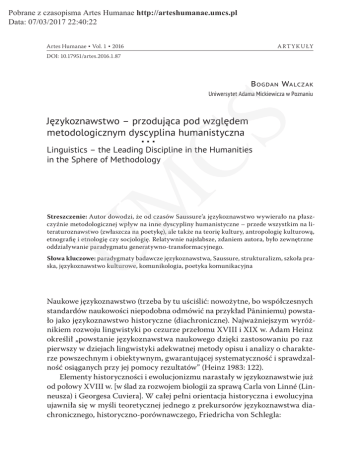 Pobrane z czasopisma Artes Humanae http://arteshumanae.umcs.pl Data: 07/03/2017 22:40:22 Artes Humanae ■ Vol. 1 ■ 2016 A RT Y K U ŁY DOI: 10.17951/artes.2016.1.87 B ogdan Walcz ak Uniwersytet Adama Mickiewicza w Poznaniu ■ ■ ■ CS Językoznawstwo – przodująca pod względem metodologicznym dyscyplina humanistyczna M Linguistics – the Leading Discipline in the Humanities in the Sphere of Methodology U Streszczenie: Autor dowodzi, że od czasów Saussure’a językoznawstwo wywierało na płaszczyźnie metodologicznej wpływ na inne dyscypliny humanistyczne – przede wszystkim na literaturoznawstwo (zwłaszcza na poetykę), ale także na teorię kultury, antropologię kulturową, etnografię i etnologię czy socjologię. Relatywnie najsłabsze, zdaniem autora, było zewnętrzne oddziaływanie paradygmatu generatywno-transformacyjnego. Słowa kluczowe: paradygmaty badawcze językoznawstwa, Saussure, strukturalizm, szkoła praska, językoznawstwo kulturowe, komunikologia, poetyka komunikacyjna Naukowe językoznawstwo (trzeba by tu uściślić: nowożytne, bo współczesnych standardów naukowości niepodobna odmówić na przykład Pāniniemu) powstało jako językoznawstwo historyczne (diachroniczne). Najważniejszym wyróżnikiem rozwoju lingwistyki po cezurze przełomu XVIII i XIX w. Adam Heinz określił „powstanie językoznawstwa naukowego dzięki zastosowaniu po raz pierwszy w dziejach lingwistyki adekwatnej metody opisu i analizy o charakterze powszechnym i obiektywnym, gwarantującej systematyczność i sprawdzalność osiąganych przy jej pomocy rezultatów” (Heinz 1983: 122). Elementy historyczności i ewolucjonizmu narastały w językoznawstwie już od połowy XVIII w. [w ślad za rozwojem biologii za sprawą Carla von Linné (Linneusza) i Georgesa Cuviera]. W całej pełni orientacja historyczna i ewolucyjna ujawniła się w myśli teoretycznej jednego z prekursorów językoznawstwa diachronicznego, historyczno-porównawczego, Friedricha von Schlegla: Pobrane z czasopisma Artes Humanae http://arteshumanae.umcs.pl Data: 07/03/2017 22:40:22 88 Artes Humanae ■ 1/2016 ■ artykuły W procedurze porównywania języków [Schlegel jest twórcą terminu vergleichende Grammatik – B. W.] za czynnik najbardziej istotny i decydujący uważał [on] sięganie w przeszłość: fakty językowe należy porównywać pod kątem widzenia historycznym, bo tylko taka procedura gwarantuje tu naukową ścisłość i skuteczność (Heinz: 129). CS To Schlegel pierwszy expressis verbis sformułował tezę, że „naukowy to znaczy historyczny”, utożsamił więc naukowość z podejściem historycznym: [W]enn man die Sprache und ihre Entstehung wissenschaftlich, das heißt durchaus historisch betrachten will (Heinz). U M Teza ta stała się ideą przewodnią całej nauki dziewiętnastowiecznej. Zdaniem ówczesnych uczonych bez podejścia historycznego możliwe jest tylko ujęcie idiograficzne, czyli czysto opisowe (w odniesieniu do językoznawstwa mówiło się w takich wypadkach o gramatykach „szkolnych” albo „praktycznych”), niemożliwe jest natomiast ujęcie nomotetyczne, czyli wyjaśniające, które jest ostatecznym celem nauki. Historyzm i ewolucjonizm można więc uznać za fundament językoznawstwa historyczno-porównawczego spod znaku Franza Boppa, Rasmusa Kristiana Raska, Jakuba Grimma, Augusta Friedricha Potta, Friedricha Dieza, Georga Curtiusa, Augusta Schleichera itd. Jeśli to możliwe, jeszcze dalej posunęła się w tym względzie w ostatniej ćwierci stulecia szkoła lipska (młodogramatycy). Regularne zmiany (procesy) językowe (w praktyce fonetyczne) podnieśli oni w swojej teorii (najwybitniejszym teoretykiem szkoły był Hermann Paul1) do rangi bezwyjątkowych praw głosowych (Lautgesetze), choć, jak wiadomo, nie mają one waloru uniwersalności, gdyż są ograniczone pod względem czasowym i przestrzennym: działają tylko w określonym czasie i na określonym terytorium (dziś wiemy, że istnieją w obszarze języka prawidłowości, które obowiązują zawsze i wszędzie, tzn. we wszystkich językach świata i we wszystkich okresach ich rozwoju – i tylko one zasługują na miano praw językowych, choć mogą to być prawidłowości o charakterze statystycznym, tzn. wcale nie muszą być bezwyjątkowe2). Jak łatwo się zorientować z tego, co powiedziano wyżej, językoznawstwo dziewiętnastowieczne, choć niewątpliwie autonomiczne ze względu na przedmiot 1 2 Głównym dziełem Hermanna Paula jest książka Prinzipien der Sprachgeschichte. O sensu stricto prawach językowych zob. Mańczak 1996. Autor stwierdził expressis verbis: „prawo może być bezwyjątkowe, ale bezwyjątkowe być nie musi, wystarczy, jeśli się odnosi do większości faktów” (Mańczak 1996: 29). Pobrane z czasopisma Artes Humanae http://arteshumanae.umcs.pl Data: 07/03/2017 22:40:22 bogdan walczak ■ Językoznawstwo – przodująca pod względem metodologicznym… 89 3 4 5 U M CS swoich badań, pozostawało pod wielkim wpływem nauk historycznych, a nawet nauk przyrodniczych z biologią na czele (zwłaszcza wielki wpływ na teorię i metodologię badań lingwistycznych wywarł Karol Darwin i jego teoria ewolucji gatunków). Sytuacja zmieniła się diametralnie wraz z wystąpieniem Ferdinanda de Saussure’a. Jak wiadomo, Saussure zapoczątkował w językoznawstwie paradygmat strukturalistyczny. Koncepcja genewskiego lingwisty zakładająca, że język jest systemem (strukturą), czyli zamkniętym układem elementów wzajemnie się warunkujących, a więc zhierarchizowanych i pełniących określoną funkcję na podstawie określonej formy (czyli układem formalno-funkcjonalnym, w których, według słynnego określenia Saussure’a: „tout se tient”), implicite zaowocowała kilkoma fundamentalnymi (co nie znaczy, że zawsze w całej rozciągłości oryginalnymi i nowatorskimi3) tezami i rozróżnieniami. Należy do nich teza o arbitralnym charakterze znaku językoweg