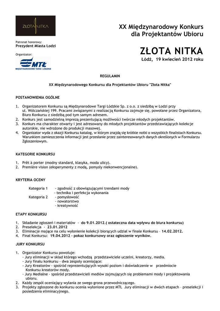 XX Międzynarodowy Konkurs dla Projektantów Ubioru Patronat honorowy: Prezydent Miasta Łodzi ZŁOTA NITKA Organizator: Łódź, 19 kwiecień 2012 roku REGULAMIN XX Międzynarodowego Konkursu dla Projektantów Ubioru "Złota Nitka" POSTANOWIENIA OGÓLNE 1. Organizatorem Konkursu są Międzynarodowe Targi Łódzkie Sp. z o.o. z siedzibą w Łodzi przy ul. Wólczańskiej 199. Pracami związanymi z realizacją Konkursu zajmuje się, powołane przez Organizatora, Biuro Konkursu z siedzibą pod tym samym adresem. 2. Konkurs jest samodzielną imprezą prezentującą moŜliwości twórcze młodych projektantów. 3. Konkurs ma charakter otwarty i jest adresowany do młodych projektantów przedstawiających kolekcje autorskie, nie wdroŜone do produkcji masowej. 4. Organizator wyda z okazji Konkursu katalog, w którym znajdą się krótkie notki o wszystkich finalistach Konkursu. Warunkiem zamieszczenia informacji jest przesłanie przez zainteresowanych danych określonych w Formularzu Zgłoszeniowym. KATEGORIE KONKURSU 1. Prêt à porter (modny standard, klasyka, moda ulicy). 2. Première vision (eksperymenty z modą, pomysły niekonwencjonalne). KRYTERIA OCENY Kategoria 1 Kategoria 2 - zgodność z obowiązującymi trendami mody - technika i perfekcja wykonania - pomysłowość - nowatorstwo - kreatywność ETAPY KONKURSU 1. 2. 3. 4. Składanie zgłoszeń i materiałów - do 9.01.2012.( ostateczna data wpływu do biura konkursu) Preselekcja - 23.01.2012 Eliminacje mające na celu wyłonienie kolekcji biorących udział w finale Konkursu – 14.02.2012. Finał Konkursu: 19.04.2012 - pokaz konkursowy oraz ogłoszenie wyników. JURY KONKURSU 1. Organizator Konkursu powołuje: - Jury eliminacji w skład którego wchodzą przedstawiciele uczelni, kreatorzy, media. - Jury finału konkursu - dwa zespoły oceniające: - Jury Kreatorów - spośród reprezentujących wysoki poziom i doświadczenie w przedmiocie Konkursu kreatorów mody. - Jury Medialne - spośród przedstawicieli mediów zajmujących się problemami mody i projektowania ubioru. 2. KaŜdy zespół oceniający wyłania ze swego grona przewodniczącego. 3. Projekty zgłoszone do konkursu ocenia wyłonione przez MTŁ Jury eliminacji w dwóch etapach – preselekcji i posiedzenia eliminacyjnego. 4. Jury finału konkursu ocenia kolekcje finałowe wyłonione przez Jury eliminacji. 5. Do Finału moŜe być zakwalifikowanych maksimum 10 kolekcji w kaŜdej kategorii. 6. MTŁ ma prawo wprowadzenia do Finału poza wybranymi przez Jury 20 kolekcjami maksymalnie 2 kolekcji wybranych przez MTŁ na konkursach krajowych i międzynarodowych podobnego typu. 7. KaŜdy z zespołów oceniających pracuje niejawnie i jego decyzje są ostateczne. Członkowie Jury zobowiązują się do utrzymania tajemnicy obrad do momentu ogłoszenia wyników. WARUNKI PRZYSTĄPIENIA DO KONKURSU 1. Przesłanie na adres Biura Konkursu wypełnionego Formularza Zgłoszeniowego, opisu kolekcji, płyty CD lub DVD prezentującej kolekcję zgłoszoną do Konkursu. 2. Studenci i uczniowie przesyłają Formularz Zgłoszeniowy ze stemplem szkoły, co uprawnia ich do uzyskania zniŜki przy płatności za udział w Finale Konkursu. 3. Udział w eliminacjach jest płatny. KaŜda osoba zgłaszająca kolekcję do eliminacji wpłaca do dnia 9.01.2012, na konto organizatora, wpisowe w wysokości 300 PLN i przekazuje do Biura Konkursu poświadczenie dokonanej wpłaty. 4. Osoby, które zakwalifikowały się do finału Konkursu, dokonują na konto Organizatora wpłaty w wysokości 300 PLN / 150 PLN (studenci) do dnia 9.03.2012. 5. Organizator zastrzega sobie moŜliwość zakwalifikowania wybranego przez siebie projektanta do finału Konkursu poza regulaminowym trybem, lub na wniosek Jury zmianę kategorii do której kolekcja została zgłoszona. 6. Osoby, które zakwalifikowały się do finału Konkursu: a) przygotowują kolekcję składającą się z 8 do 10 wzorów wraz z dodatkami. Wzory zgłoszone do Konkursu muszą spełniać następujące wymagania: stroje damskie - rozmiar 36-38, na wzrost od 173 cm do 178 cm; stroje męskie – wzrost od 183 cm do 186 cm. Nie wolno bez zgody MTŁ wprowadzać do finału sylwetek nie zaprezentowanych w eliminacjach. b) do dnia 9.03.2012 przesyłają zdjęcia dwóch wybranych modeli z kolekcji drogą mailową na adres [email protected] (format: 15 x 21 cm, tiff, 300 dpi, CMYK). c) do dnia 9.03. finaliści przesyłają pisemne oświadczenie, Ŝe posiadają uregulowane prawa autorskie do przekazanych MTŁ zdjęć uŜytych do publikacji MTŁ ( make-up, fryzury, fotograf, modelka) i Ŝadna z osób nie wnosi praw do wynagrodzenia autorskiego i publikacji danych twórców zdjęć, a ewentualne spory mogące wynikać z praw autorskich finalista konkursu bierze na siebie. 7. Finaliści Konkursu zobowiązani są dostarczyć kolekcje wraz z akcesoriami i dowodem wpłaty w terminie określonym przez Realizatora Pokazu. 8. Laureaci Złotych Nitek przyznawanych przez Jury Kreatorów nie mogą być uczestnikami kolejnych edycji Konkursu. INFORMACJE DODATKOWE DLA UCZESTNIKÓW KONKURSU 1. Zgłoszenia do Konkursu powinny zawierać: a) Formularz Zgłoszeniowy wypełniony drukowanymi literami, b) Opis kolekcji c) Kopię dowodu wpłaty, d) Płytę CD lub DVD zawierająca prezentacje minimum 5 pełnych sylwetek - przód, tył sylwetki, w formie zdjęć lub materiału Video, dodatkowo mogą być dostarczone rysunki kolekcji (format zdjęć i rysunków JPG, video odtwarzane w Windows Media Player). e) Próbki tkanin, f) Rekomendacja uczelni – (dodatkowe punkty w kwalifikacji) 2. Prace powinny być złoŜone w teczkach ofertowych lub Portfolio, kaŜdy element zgłoszenia w oddzielnej przezroczystej koszulce. Płyty podpisane imieniem i nazwiskiem z nazwa kolekcji. Brak jakiegokolwiek elementu wymienionego w punkcie 1 poza pozycją f, dyskwalifikuje prace. 3. Biuro Konkursu niezwłocznie powiadomi osoby, które zakwalifikowały się do finału Konkursu. Wpłat za udział w Konkursi