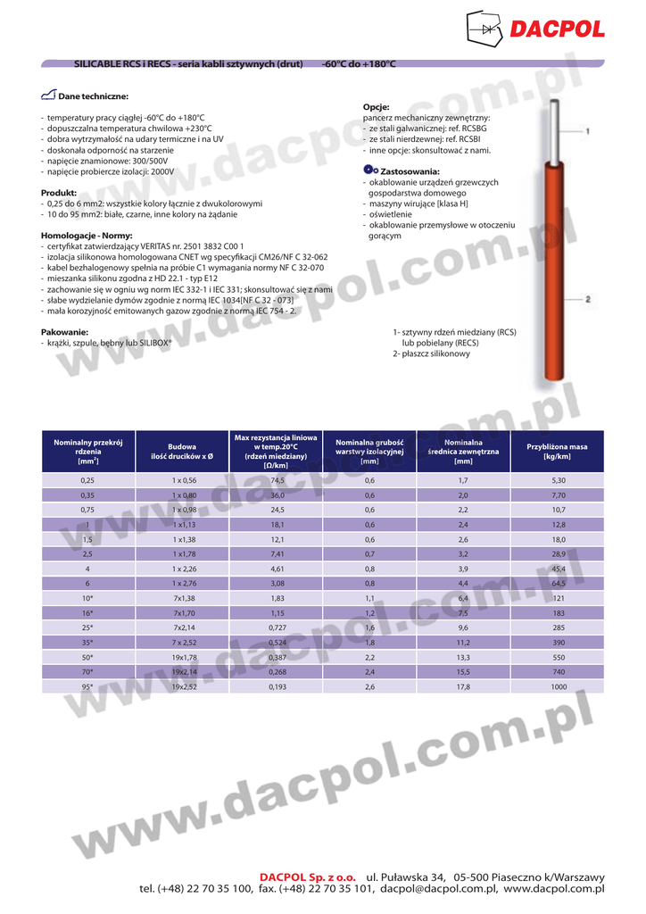 SILICABLE RCS i RECS - seria kabli sztywnych (drut) -60°C do +180°C Dane techniczne: - Opcje: pancerz mechaniczny zewnętrzny: - ze stali galwanicznej: ref. RCSBG - ze stali nierdzewnej: ref. RCSBI - inne opcje: skonsultować z nami. temperatury pracy ciągłej -60°C do +180°C dopuszczalna temperatura chwilowa +230°C dobra wytrzymałość na udary termiczne i na UV doskonała odporność na starzenie napięcie znamionowe: 300/500V napięcie probiercze izolacji: 2000V Produkt: - 0,25 do 6 mm2: wszystkie kolory łącznie z dwukolorowymi - 10 do 95 mm2: białe, czarne, inne kolory na żądanie Homologacje - Normy: - certyfikat zatwierdzający VERITAS nr. 2501 3832 C00 1 - izolacja silikonowa homologowana CNET wg specyfikacji CM26/NF C 32-062 - kabel bezhalogenowy spełnia na próbie C1 wymagania normy NF C 32-070 - mieszanka silikonu zgodna z HD 22.1 - typ E12 - zachowanie się w ogniu wg norm IEC 332-1 i IEC 331; skonsultować się z nami - słabe wydzielanie dymów zgodnie z normą IEC 1034[NF C 32 - 073] - mała korozyjność emitowanych gazow zgodnie z normą IEC 754 - 2. Zastosowania: - okablowanie urządzeń grzewczych gospodarstwa domowego - maszyny wirujące [klasa H] - oświetlenie - okablowanie przemysłowe w otoczeniu gorącym Pakowanie: - krążki, szpule, bębny lub SILIBOX® Nominalny przekrój rdzenia [mm2] 1- sztywny rdzeń miedziany (RCS) lub pobielany (RECS) 2- płaszcz silikonowy Budowa ilość drucików x Ø Max rezystancja liniowa w temp.20°C (rdzeń miedziany) [Ω/km] Nominalna grubość warstwy izolacyjnej [mm] Nominalna średnica zewnętrzna [mm] Przybliżona masa [kg/km] 0,25 1 x 0,56 74,5 0,6 1,7 5,30 0,35 1 x 0,80 36,0 0,6 2,0 7,70 0,75 1 x 0,98 24,5 0,6 2,2 10,7 1 1 x1,13 18,1 0,6 2,4 12,8 1,5 1 x1,38 12,1 0,6 2,6 18,0 2,5 1 x1,78 7,41 0,7 3,2 28,9 4 1 x 2,26 4,61 0,8 3,9 45,4 6 1 x 2,76 3,08 0,8 4,4 64,5 10* 7x1,38 1,83 1,1 6,4 121 16* 7x1,70 1,15 1,2 7,5 183 25* 7x2,14 0,727 1,6 9,6 285 35* 7 x 2,52 0,524 1,8 11,2 390 50* 19x1,78 0,387 2,2 13,3 550 70* 19x2,14 0,268 2,4 15,5 740 95* 19x2,52 0,193 2,6 17,8 1000 Dacpol Sp. z o.o. ul. Puławska 34, 05-500 Piaseczno k/Warszawy tel. (+48) 22 70 35 100, fax. (+48) 22 70 35 101, [email protected], www.dacpol.com.pl
