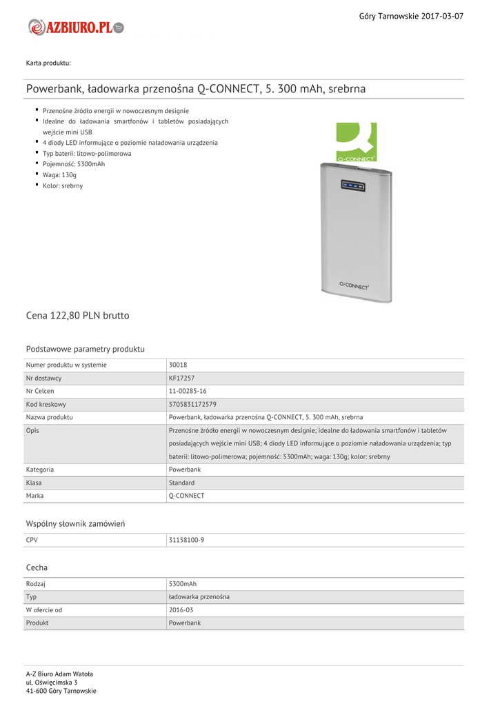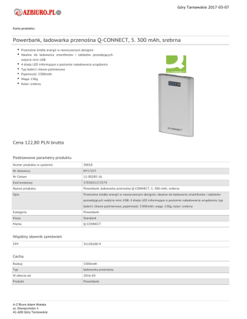 Góry Tarnowskie 2017-03-07 Karta produktu: Powerbank, ładowarka przenośna Q-CONNECT, 5. 300 mAh, srebrna Przenośne źródło energii w nowoczesnym designie Idealne do ładowania smartfonów i tabletów posiadających wejście mini USB 4 diody LED informujące o poziomie naładowania urządzenia Typ baterii: litowo-polimerowa Pojemność: 5300mAh Waga: 130g Kolor: srebrny Cena 122,80 PLN brutto Podstawowe parametry produktu Numer produktu w systemie 30018 Nr dostawcy KF17257 Nr Celcen 11-00285-16 Kod kreskowy 5705831172579 Nazwa produktu Powerbank, ładowarka przenośna Q-CONNECT, 5. 300 mAh, srebrna Opis Przenośne źródło energii w nowoczesnym designie; idealne do ładowania smartfonów i tabletów posiadających wejście mini USB; 4 diody LED informujące o poziomie naładowania urządzenia; typ baterii: litowo-polimerowa; pojemność: 5300mAh; waga: 130g; kolor: srebrny Kategoria Powerbank Klasa Standard Marka Q-CONNECT Wspólny słownik zamówień CPV 31158100-9 Cecha Rodzaj 5300mAh Typ ładowarka przenośna W ofercie od 2016-03 Produkt Powerbank A-Z Biuro Adam Watoła ul. Oświęcimska 3 41-600 Góry Tarnowskie Góry Tarnowskie 2017-03-07 Karta katalogowa produktu cd. Powerbank, ładowarka przenośna Q-CONNECT, 5. 300 mAh, srebrna Certyfikaty Nowy produkt w ofercie Standard Hit Standard Kolor Kolor Pozostałe zdjęcia produktu Serdecznie zapraszamy do współpracy A-Z Biuro Adam Watoła zespół. A-Z Biuro Adam Watoła ul. Oświęcimska 3 41-600 Góry Tarnowskie Srebrny