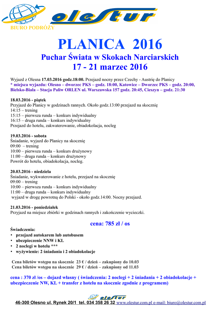 BIURO PODRÓŻY PLANICA 2016 Puchar Świata w Skokach Narciarskich 17 - 21 marzec 2016 Wyjazd z Olesna 17.03.2016 godz.18:00. Przejazd nocny przez Czechy - Austrię do Planicy * miejsca wyjazdu: Olesno – dworzec PKS – godz. 18:00, Katowice – Dworzec PKS – godz. 20:00, Bielsko-Biała – Stacja Paliw ORLEN ul. Warszawska 157 godz. 20:45, Cieszyn – godz. 21:30 18.03.2016 - piątek Przyjazd do Planicy w godzinach rannych. Około godz.13:00 przejazd na skocznię 14:15 – trening 15:15 – pierwsza runda – konkurs indywidualny 16:15 – druga runda – konkurs indywidualny Przejazd do hotelu, zakwaterowanie, obiadokolacja, nocleg 19.03.2016 - sobota Śniadanie, wyjazd do Planicy na skocznię 09:00 – trening 10:00 – pierwsza runda – konkurs drużynowy 11:00 – druga runda – konkurs drużynowy Powrót do hotelu, obiadokolacja, nocleg. 20.03.2016 - niedziela Śniadanie, wykwaterowanie z hotelu, przejazd na skocznię 09:00 – trening 10:00 – pierwsza runda – konkurs indywidualny 11:00 – druga runda – konkurs indywidualny wyjazd w drogę powrotną do Polski - około godz.14:00. Nocny przejazd. 21.03.2016 - poniedziałek Przyjazd na miejsce zbiórki w godzinach rannych i zakończenie wycieczki. cena: 785 zł / os Świadczenia: • przejazd autokarem lub autobusem • ubezpieczenie NNW i KL • 2 noclegi w hotelu *** • wyżywienie: 2 śniadania i 2 obiadokolacje Cena biletów wstępu na skocznie 23 € / dzień – zakupiony do 10.03 Cena biletów wstępu na skocznie 29 € / dzień – zakupiony od 11.03 cena : 370 zł /os – dojazd własny ( świadczenia: 2 noclegi + 2 śniadania + 2 obiadokolacje + ubezpieczenie NW, KL + transfer z hotelu na skocznie zgodnie z programem) 46-300 Olesno ul. Rynek 20/1 tel. 034 358 26 32 www.olestur.com.pl e-mail: [email protected]