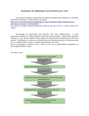 Komentarz do zakłamania rzeczywistości przez ALP Na początek chciałbym zapytać kto jest autorem anonimowego artykułu pt. „Kto płaci robotnikowi leśnemu?” zamieszczonym na stronie http://www.szczecinek.lasy.gov.pl/aktualnosci/-/asset_publisher/1M8a/content/kto-placirobotnikowi-lesnemu-#.VhAIpJxkMnC ? Czy autorzy są objęci odpowiedzialnością zbiorową tak jak to było w latach 80-tych XX wieku? Nawiązując do wypowiedzi pani rzecznik ALP Anny Malinowskiej – ta pani wypowiada się jakby nie znała problemów finansowych firm leśnych. Tłumaczenie dyrektora Wasiaka, że lasy muszą zapłacić jakieś daniny nie usprawiedliwia niskich stawek dla firm leśnych. Twierdzenie, że zulowiec to robotnik leśny jest nieporozumieniem. Dla sprostowania ZUL to Zakład Usług Leśnych, w którym pracują pracownicy leśni. Kwoty wymienione w artykule, może i takie są, lecz nie są sprawiedliwie podzielone na poszczególne RDLP w kraju. Ad. Stały wzrost Stały wzrost wydatków ALP na usługi leśne Spowodowane przez Wzrost ilości pozyskiwanego surowca Co prowadzi do Zwiększenia ilości pracy dla pilarzy i operatorów maszyn wielofunkcyjnych Wymusza Zwiększenie ilości zatrudnionych pilarzy w ZUL-ach Tym samym Zwiększają się koszty zatrudnienia i inne koszty poniesione przez pracodawcę ALE STAWKA Z WYLICZEŃ KATALOGOWYCH NIE ZWIĘKSZA SIĘ Ad. Przetargi: ograniczenia i możliwości To ALP kreowało i kreuje rynek usług w lasach (kto ma kasę ten rządzi). Ci, którzy widzą winę w ZUL-ach, chyba nie wiedzą o co chodzi. Ci, którzy wiedzą o co chodzi doskonale zdają sobie sprawę z kłamstw ALP. ALP nie walczy z nieuczciwą konkurencją, ponieważ im mniej wydadzą na ZUL-e, tym więcej mają dla siebie. Dbają jedynie o swoje interesy skłócając firmy leśne i robią to w „białych rękawiczkach”. Można zauważyć, że dalej chcą oszukiwać płacąc w jednostkach naturalnych. Każdy doskonale wie, że w Polsce mamy różne tereny – góry i niziny. Oczywiste jest, że inaczej płaci się za pracę w górach i inaczej na nizinach, co pokazuje katalog. Stosując katalog posłużę się przykładem przy pozyskaniu: - niziny 0,65 rg Pozysk × 20 zł = 13,00zł/m3 - góry 0,82 rg Pozysk × 20 zł = 16,40zł/m3 Kryteria pozacenowe 20% - jest to dobry ruch, lecz mam wątpliwości co do egzekwowania tego zapisu w naszym RDLP. Cytując artukuł: „nie mogą doprowadzić do sytuacji, w której pod tym pretekstem nastąpi uprzywilejowanie części firm, a innym - zwłaszcza nowym - zostanie zablokowany dostęp do rynku” Chcecie wesprzeć rozwój sektora usług leśnych wprowadzając nowe firmy, a do przetargu wymagany jest „przerób i doświadczenie”. Zapis ten automatycznie eliminuje nowe firmy chcące wejść na rynek usług leśnych. Czyżby chodziło o szewców i zegarmistrzów (może oni byliby dokładniejsi)? Lasy Państwowe to dobro narodowe, a więc katalogi pracochłonności też należą się wszystkim firmom leśnym. Niestety tak nie jest co pokazują rządy monopolisty. Jedynym rozwiązaniem jest sprywatyzowanie ALP, dla jasności nie dotyczy to lasów. Tak jak sprywatyzowanie usług leśnych przyniosło wiele oszczędności dla lasów, tak i prywatyzacja rozbudowanej administracji lasów państwowych przyniosłaby korzyści dla lasów i dla firm leśnych. Szanowna ALP, jednostki naturalne to oszustwo i złodziejstwo. Wynagrodzenia naszych pracowników są uzależnione od tego jakie kwoty uzyskamy od ALP za wykonane usługi. Nie Wam analizować ile my płacimy pracownikom. W artykule przywołano przykład z RDLP w Pile. Przytoczony przykład nie mówi nam nic o warunkach w jakich praca była wykonywana i nie przekonuje mnie o waszej racji, bo ja też zatrudniam 20 pilarzy i z moich wyliczeń wychodzi zupełnie inaczej. Proszę używać nazwy ALP, a nie LP, bo lasy nie są tu nic winne. Na spotkaniu w Ministerstwie Ochrony Środowiska w dniu 28.09.2015 r. pani Minister Kępka i Dyrektor Wasiak pokazali na co ich stać, a stać ich na niewiele. Natomiast w dniu protestu tj. 2.10.2015 r. dowiadujemy się, że będą zatrudniać do pracy w lesie. Myślę, że chyba nie na czarno, bo jeśli legalnie to dotychczas wydawane pieniądze na sektor usług leśnych nie są wystarczające. Jestem już w podeszłym wieku i chciałbym dożyć do normalnego traktowania nas - ZUL-i, a normalne traktowanie tj. m.in. zastosowanie katalogów pracochłonności z godziwą stawką za rg, bo to jest sprawiedliwe rozliczanie. Mamy XXI wiek, a w zielonym betonie dalej komuna. Uczestnik spotkania w Ministerstwie Ochrony Środowiska w dniu 28.09.2015 r. oraz protestu 2.10.2015 r. w Warszawie Z poważaniem Prezes SPL oddział Szczecinek Winkowski Waldemar