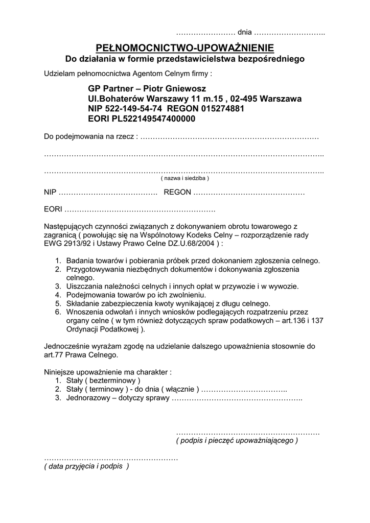 …………………… dnia ……………………….. PEŁNOMOCNICTWO-UPOWAśNIENIE Do działania w formie przedstawicielstwa bezpośredniego Udzielam pełnomocnictwa Agentom Celnym firmy : GP Partner – Piotr Gniewosz Ul.Bohaterów Warszawy 11 m.15 , 02-495 Warszawa NIP 522-149-54-74 REGON 015274881 EORI PL522149547400000 Do podejmowania na rzecz : ……………………………………………………………… ………………………………………………………………………………………………….. ………………………………………………………………………………………………….. ( nazwa i siedziba ) NIP …………………………………. REGON ……………………………………… EORI ……………………………………………………. Następujących czynności związanych z dokonywaniem obrotu towarowego z zagranicą ( powołując się na Wspólnotowy Kodeks Celny – rozporządzenie rady EWG 2913/92 i Ustawy Prawo Celne DZ.U.68/2004 ) : 1. Badania towarów i pobierania próbek przed dokonaniem zgłoszenia celnego. 2. Przygotowywania niezbędnych dokumentów i dokonywania zgłoszenia celnego. 3. Uiszczania naleŜności celnych i innych opłat w przywozie i w wywozie. 4. Podejmowania towarów po ich zwolnieniu. 5. Składanie zabezpieczenia kwoty wynikającej z długu celnego. 6. Wnoszenia odwołań i innych wniosków podlegających rozpatrzeniu przez organy celne ( w tym równieŜ dotyczących spraw podatkowych – art.136 i 137 Ordynacji Podatkowej ). Jednocześnie wyraŜam zgodę na udzielanie dalszego upowaŜnienia stosownie do art.77 Prawa Celnego. Niniejsze upowaŜnienie ma charakter : 1. Stały ( bezterminowy ) 2. Stały ( terminowy ) - do dnia ( włącznie ) …………………………….. 3. Jednorazowy – dotyczy sprawy …………………………………………….. …………………………………………………. ( podpis i pieczęć upowaŜniającego ) ……………………………………………… ( data przyjęcia i podpis )