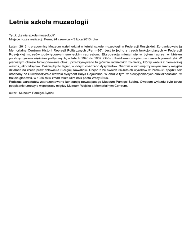 Letnia szkoła muzeologii Tytuł: „Letnia szkoła muzeologii” Miejsce i czas realizacji: Perm, 24 czerwca – 3 lipca 2013 roku Latem 2013 r. pracownicy Muzeum wzięli udział w letniej szkole muzeologii w Federacji Rosyjskiej. Zorganizowało ją Memorialne Centrum Historii Represji Politycznych „Perm-36”. Jest to jedno z trzech funkcjonujących w Federacji Rosyjskiej muzeów poświęconych sowieckim represjom. Ekspozycja mieści się w byłym łagrze, w którym przetrzymywano więźniów politycznych, w latach 1946 do 1987. Obóz zlikwidowano dopiero w czasach pierestrojki. W pierwszym okresie funkcjonowania obozu przetrzymywano tu głównie radzieckich żołnierzy, którzy wrócili z niemieckiej niewoli, jako zdrajców. Później był to łagier, w którym osadzano dysydentów. Siedział w nim między innymi znany rosyjski działacz na rzecz praw człowieka Siergiej Kowaliow. Część z ze swoich 35-letnich wyroków w Perm-36 spędził też urodzony na Suwalszczyźnie litewski dysydent Balys Gajauskas. W obozie tym, w niewyjaśnionych okolicznościach, w trakcie głodówki, w 1985 roku zmarł także ukraiński poeta Wasyl Stus. Podczas warsztatów zaprezentowano koncepcję powstającego Muzeum Pamięci Sybiru. Owocem wyjazdu było także podpisanie umowy o współpracy między Muzeum Wojska a Memorialnym Centrum. autor: Muzeum Pamięci Sybiru