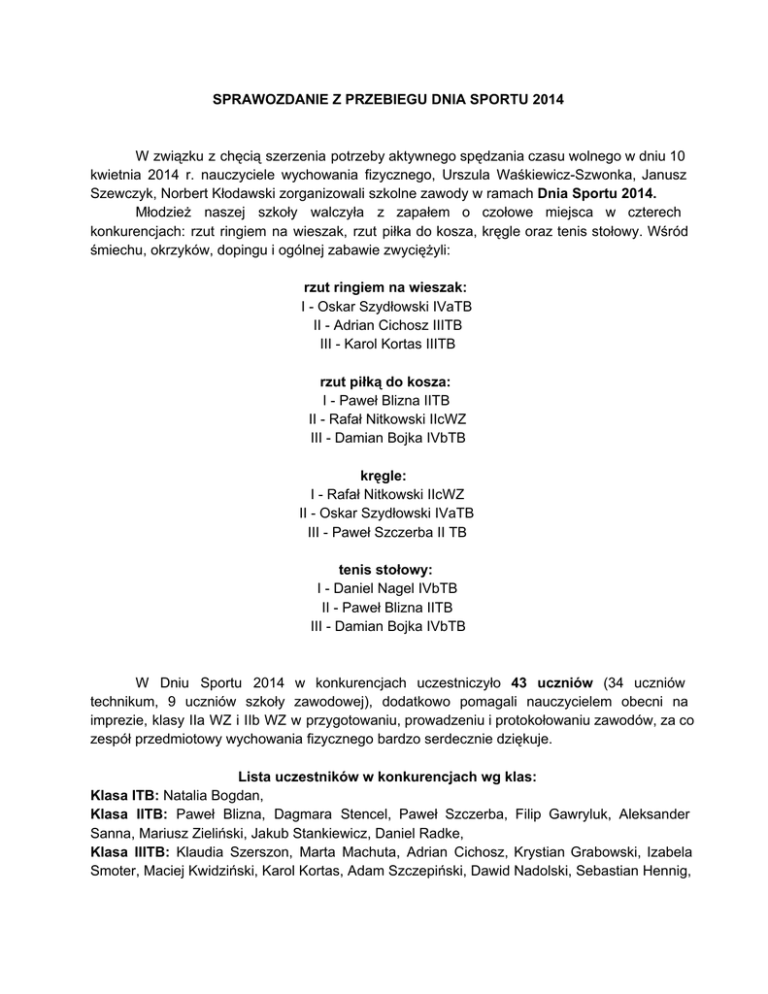 SPRAWOZDANIE Z PRZEBIEGU DNIA SPORTU 2014 W związku z chęcią szerzenia potrzeby aktywnego spędzania czasu wolnego w dniu 10 kwietnia 2014 r. nauczyciele wychowania fizycznego, Urszula WaśkiewiczSzwonka, Janusz Szewczyk, Norbert Kłodawski zorganizowali szkolne zawody w ramach Dnia Sportu 2014. Młodzież naszej szkoły walczyła z zapałem o czołowe miejsca w czterech konkurencjach: rzut ringiem na wieszak, rzut piłka do kosza, kręgle oraz tenis stołowy. Wśród śmiechu, okrzyków, dopingu i ogólnej zabawie zwyciężyli: rzut ringiem na wieszak: I Oskar Szydłowski IVaTB II Adrian Cichosz IIITB III Karol Kortas IIITB rzut piłką do kosza: I Paweł Blizna IITB II Rafał Nitkowski IIcWZ III Damian Bojka IVbTB kręgle: I Rafał Nitkowski IIcWZ II Oskar Szydłowski IVaTB III Paweł Szczerba II TB tenis stołowy: I Daniel Nagel IVbTB II Paweł Blizna IITB III Damian Bojka IVbTB W Dniu Sportu 2014 w konkurencjach uczestniczyło 43 uczniów (34 uczniów technikum, 9 uczniów szkoły zawodowej), dodatkowo pomagali nauczycielem obecni na imprezie, klasy IIa WZ i IIb WZ w przygotowaniu, prowadzeniu i protokołowaniu zawodów, za co zespół przedmiotowy wychowania fizycznego bardzo serdecznie dziękuje. Lista uczestników w konkurencjach wg klas: Klasa ITB: Natalia Bogdan, Klasa IITB: Paweł Blizna, Dagmara Stencel, Paweł Szczerba, Filip Gawryluk, Aleksander Sanna, Mariusz Zieliński, Jakub Stankiewicz, Daniel Radke, Klasa IIITB: Klaudia Szerszon, Marta Machuta, Adrian Cichosz, Krystian Grabowski, Izabela Smoter, Maciej Kwidziński, Karol Kortas, Adam Szczepiński, Dawid Nadolski, Sebastian Hennig, Klasa IVaTB: Oskar Szydłowski, Adam Ciężkowski, Lucjan Kass, Mateusz Kass, Kamila Zbrzeska, Maciej Kieliński, Aleksandra Reschke, Paulina Schmulta, Dawid Ratajczak, Jakub Woźniak, Klasa IVbTB: Damian Bojka, Seweryn Gęsicki, Sławomir Wolschon, Dawid Walder, Daniel Nagel, Klasa IIaWZ: Daria Treder, Mateusz Kondaszewski, Andrzej Plichta, Darek Pollikeit, Patryk Pollikeit, Klasa IIbWZ: Paweł Truskolawski Klasa IIcWZ: Marcin Bach, Kacper Waleczkowski, Rafał Nitkowski Impreza zakończyła się wręczeniem przez Panią Dyrektor Dorotę Borys dyplomów, medali i statuetek dla najlepszych uczniów poszczególnych konkurencji. Dzięki dogodnemu terminowi /środek tygodnia/ frekwencjia przeszła najśmielsze oczekiwania. Przedmiotowy zespół wychowania fizycznego: Urszula WaśkiewiczSzwonka Janusz Szewczyk Norbert Kłodawski