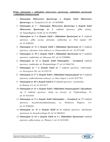 Wykaz gimnazjum z oddziałami mistrzostwa sportowego, oddziałami sportowymi i oddziałami dwujęzycznymi 1. Gimnazjum Mistrzostwa Sportowego w Zespole Szkół Mistrzostwa Sportowego, os. Tysiąclecia 43, tel. 61 6639800; 2. Gimnazjum nr 3 – Gimnazjum Mistrzostwa Sportowego w Zespole Szkół Mistrzostwa Sportowego nr 2, (oddział sportowy: piłka nożna), Al. Niepodległości 32/40, tel. 61 8526001; 3. Gimnazjum nr 5 w Zespole Szkół z Oddziałami Sportowymi nr 1, (oddział sportowy: piłka ręczna, pływanie, siatkówka) os. Pod Lipami 105 tel. 61 8200591; 4. Gimnazjum nr 31 w Zespole Szkół z Oddziałami Sportowymi nr 3 (oddział sportowy: pływanie, tenis stołowy), os. Piastowskie 65, tel. 61 8771300; 5. Gimnazjum nr 30 w Zespole Szkół z Oddziałami Sportowymi nr 5 (oddział sportowy: siatkówka), ul. Głuszyna 187, tel. 61 8788006; 6. Gimnazjum nr 33 w Zespole Szkół Gimnazjalno - Licealnych (oddział sportowy: siatkówka), ul. Wyspiańskiego 27, tel. 61 8664734; 7. Gimnazjum nr 7 w Zespole Szkół nr 7 (oddział sportowy: taekwondo), os. Zwycięstwa 101, tel. 61 823179; 8. Gimnazjum nr 27 w Zespole Szkół z Oddziałami Integracyjnymi nr 1 (oddział sportowy: siatkowka/tenis stołowy), os. Stare Zegrze 1, tel.61 8797791; 9. Gimnazjum nr 40 w Zespole Szkół nr 5 (oddział sportowy: szermierka) ul. Różana 1/3, tel. 61 8351417; 10. Gimnazjum nr 41 w Zespole Szkół z Oddziałami Integracyjnymi i Specjalnym nr 2 (oddział sportowy: hokej na trawie), ul. Prądzyńskiego 53, tel. 61 8331010: 11. Gimnazjum nr 9 w Zespole Szkół Gimnazjalno – Licealnych nr 37 (oddział sportowy: koszykówka/lekkoatletyka), os. Wichrowe Wzgórze 111, tel. 61 8208203; 12. Gimnazjum nr 53 w Zespole Szkół nr 8 (oddział sportowy: akrobatyka sportowa), ul. Jarachowskiego 62, tel. 61 8663621; 13. Gimnazjum nr 64 w Zespole Szkół nr 4 z Oddziałami Sportowymi (oddział sportowy: piłka nożna), os. Winiary 2, tel. 61 8233389; Systemowa obsługa rekrutacji oświatowej NABÓR 2015 © 2003-2014 Poznańskie Centrum Superkomputerowo-Sieciowe 14. Gimnazjum nr 54 z Oddziałami Sportowymi, (oddział sportowy: koszykówka, piłka nożna, piłka ręczna, pływanie), ul. Newtona 2, tel. 61 8670929; 15. Gimnazjum nr 12 (oddział sportowy: piłka wodna/zapasy), os. S.Batorego 101, tel. 61 8217131; 16. Gimnazjum nr 23 (oddział sportowy: lekkoatletyka), os. Jagiellońskie 128, tel. 61 879144; 17. Gimnazjum nr 20 (oddział sportowy: piłka nożna), ul. Główna 42,tel. 8780950; 18. Gimnazjum nr 51 (oddział sportowy: judo), ul. Klaudyny Potockiej 38, tel. 8665937; 19. Gimnazjum Dwujęzyczne (język francuski) w Zespole Szkół Zespole Szkół Ogólnokształcących nr 1, ul. Bukowska 16, tel. 61 8480671; 20. Gimnazjum Dwujęzyczne (język niemiecki) w Ogólnokształcących nr 10, ul. Żeromskiego 8/12, tel. 61 8472502; 21. Gimnazjum nr 26 z Oddziałami Dwujęzycznymi (język hiszpański) w Zespole Szkół Ogólnokształcących nr 4, os. Czecha 59, tel. 61 8776058; 22. Gimnazjum nr 29 z Oddziałami Dwujęzycznymi (język angielski) w Zespole Szkół Ogólnokształcących nr 2, ul. Tarnowska 27, tel. 61 8798090; 23. Gimnazjum nr 33 w Zespole Szkół Gimnazjalno-Licealnych (język angielski) ul. Wyspiańskiego 27, tel. 61 8664734; 24. Gimnazjum nr 58 (język angielski), ul. Małoszyńska 38, tel. 61 8680432; 25. Gimnazjum nr 50 (język rosyjski), ul. Ściegiennego 10, tel. 61 8660516; 26. Gimnazjum nr 68 w Zespole Szkół nr 2 (język angielski), ul. Hangarowa 14, tel. 61 8417410; 27. Gimnazjum nr 9 w Zespole Szkół Gimnazjalno-Licealnych nr 37 (język angielski), os. Wichrowe Wzgórze 111, tel. 61 8208203. Uwaga: wniosek Gimnazjum nr 60 w trakcie rozpatrywania Systemowa obsługa rekrutacji oświatowej NABÓR 2015 © 2003-2014 Poznańskie Centrum Superkomputerowo-Sieciowe