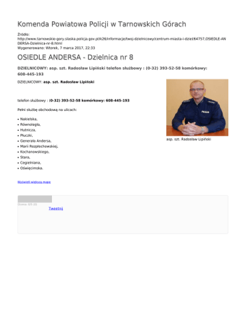 Komenda Powiatowa Policji w Tarnowskich Górach Źródło: http://www.tarnowskie-gory.slaska.policja.gov.pl/k26/informacje/twoj-dzielnicowy/centrum-miasta-i-dziel/64757,OSIEDLE-AN DERSA-Dzielnica-nr-8.html Wygenerowano: Wtorek, 7 marca 2017, 22:33 OSIEDLE ANDERSA - Dzielnica nr 8 DZIELNICOWY: asp. szt. Radosław Lipiński telefon służbowy : (0-32) 393-52-58 komórkowy: 608-445-193 DZIELNICOWY: asp. szt. Radosław Lipiński telefon służbowy : (0-32) 393-52-58 komórkowy: 608-445-193 Pełni służbę obchodową na ulicach: ● Nakielska, ● Równoległa, ● Hutnicza, ● Płuczki, ● Generała Andersa, ● Marii Rozpłochowskiej, ● Kochanowskiego, ● Stara, ● Cegielniana, ● Oświęcimska. Wyświetl większą mapę Ocena: 0/5 (0) Tweetnij asp. szt. Radosław Lipiński