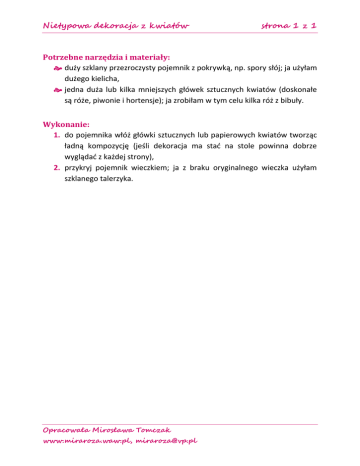 Nietypowa dekoracja z kwiatów strona 1 z 1 Potrzebne narzędzia i materiały: duży szklany przezroczysty pojemnik z pokrywką, np. spory słój; ja użyłam dużego kielicha, jedna duża lub kilka mniejszych główek sztucznych kwiatów (doskonałe są róże, piwonie i hortensje); ja zrobiłam w tym celu kilka róż z bibuły. Wykonanie: 1. do pojemnika włóż główki sztucznych lub papierowych kwiatów tworząc ładną kompozycję (jeśli dekoracja ma stać na stole powinna dobrze wyglądać z każdej strony), 2. przykryj pojemnik wieczkiem; ja z braku oryginalnego wieczka użyłam szklanego talerzyka. Opracowała Mirosława Tomczak www.miraroza.waw.pl, [email protected]
