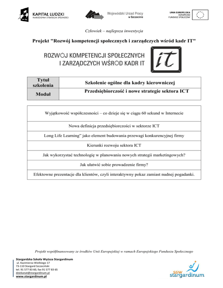 Człowiek – najlepsza inwestycja Projekt "Rozwój kompetencji społecznych i zarządczych wśród kadr IT" Tytuł szkolenia Szkolenie ogólne dla kadry kierowniczej Przedsiębiorczość i nowe strategie sektora ICT Moduł Wyjątkowość współczesności – co dzieje się w ciągu 60 sekund w Internecie Nowa definicja przedsiębiorczości w sektorze ICT Long Life Learning” jako element budowania przewagi konkurencyjnej firmy Kierunki rozwoju sektora ICT Jak wykorzystać technologię w planowaniu nowych strategii marketingowych? Jak ułatwić sobie prowadzenie firmy? Efektowne prezentacje dla klientów, czyli interaktywny pokaz zamiast nudnej pogadanki. Projekt współfinansowany ze środków Unii Europejskiej w ramach Europejskiego Funduszu Społecznego Stargardzka Szkoła Wyższa Stargardinum ul. Kazimierza Wielkiego 17 73-110 Stargard Szczeciński tel. 91 577 83 60, fax 91 577 83 65 [email protected] www.stargardinum.pl