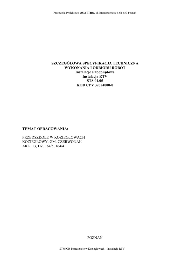 Pracownia Projektowa QUATTRO, ul. Brandstaettera 4, 61-659 Pozna SZCZEGÓ OWA SPECYFIKACJA TECHNICZNA WYKONANIA I ODBIORU ROBÓT Instalacje s abopr dowe Instalacja RTV STS 01.05 KOD CPV 32324000-0 TEMAT OPRACOWANIA: PRZEDSZKOLE W KOZIEG OWACH KOZIEG OWY, GM. CZERWONAK ARK. 13, DZ. 164/5, 164/4 POZNA STWiOR Przedszkole w Kozieg owach – Instalacja RTV Pracownia Projektowa QUATTRO, ul. Brandstaettera 4, 61-659 Pozna 1. Wst p ..............................................................................................................................................................3 1.1.Przedmiot Specyfikacji ..............................................................................................................................3 1.2.Zakres stosowania Specyfikacji..................................................................................................................3 1.3.Zakres robót obj tych Specyfikacj ............................................................................................................3 1.4.Okre lenia podstawowe .............................................................................................................................3 1.5.Ogólne wymagania dotycz ce robót ...........................................................................................................3 2. Materia y .........................................................................................................................................................3 2.1.Ogólne wymagania dotycz ce materia ów..................................................................................................3 2.2. Wymagania szczegó owe dotycz ce materia ów........................................................................................3 2.2.1. Odbiór materia ów na budowie. .........................................................................................................3 2.2.2. Sk adowanie materia ów na budowie. ................................................................................................3 2.2.3. Inne wymagania. ...............................................................................................................................3 3. Sprz t ..............................................................................................................................................................3 3.1. Ogólne wymagania dotycz ce sprz tu.......................................................................................................3 3.2. Szczególne wymagania dotycz ce sprz tu.................................................................................................4 4. Transport .........................................................................................................................................................4 4.1. Ogólne wymagania dotycz ce transportu...................................................................................................4 4.2. Szczególne wymagania dotycz ce transportu.............................................................................................4 5. Wykonanie robót..............................................................................................................................................4 5.1. Ogóle zasady wykonania robót..................................................................................................................4 5.2. Szczególne zasady wykonania robót..........................................................................................................4 5.2.1. Uk adanie przewodów koncentrycznych ............................................................................................4 5.2.1.2. Instalacje w tynku .........................................................................................................................4 5.2.1.2.1. Trasowanie............................................................................................................................4 5.2.1.2.2. Mocowanie puszek .................................................................................................................4 5.2.1.2.3. Uk adanie i mocowanie przewodów..............................................................................................4 5.2.2. Monta gniazd RTV ..........................................................................................................................4 6. Kontrola jako ci robót ......................................................................................................................................4 6.1.Zasady ogólne kontroli jako ci...................................................................................................................4 6.2.Szczególne zasady kontroli jako ci ............................................................................................................5 7. Obmiar robót. ..................................................................................................................................................5 8. Odbiór robót ....................................................................................................................................................5 8.1. Ogólne zasady odbioru robót.....................................................................................................................5 8.2. Szczególne zasady odbioru robót ..............................................................................................................5 9.Podstawa p atno ci............................................................................................................................................5 9.1. Ogólne zasady dotycz ce ustalania podstawy p atno ci..............................................................................5 9.2. Szczególne zasady dotycz ce podstawy p atno ci ........................................................................