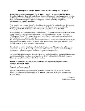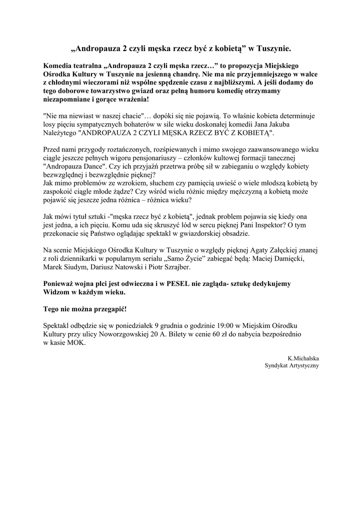 „Andropauza 2 czyli męska rzecz być z kobietą” w Tuszynie. Komedia teatralna „Andropauza 2 czyli męska rzecz…” to propozycja Miejskiego Ośrodka Kultury w Tuszynie na jesienną chandrę. Nie ma nic przyjemniejszego w walce z chłodnymi wieczorami niż wspólne spędzenie czasu z najbliższymi. A jeśli dodamy do tego doborowe towarzystwo gwiazd oraz pełną humoru komedię otrzymamy niezapomniane i gorące wrażenia! "Nie ma niewiast w naszej chacie"… dopóki się nie pojawią. To właśnie kobieta determinuje losy pięciu sympatycznych bohaterów w sile wieku doskonałej komedii Jana Jakuba Należytego "ANDROPAUZA 2 CZYLI MĘSKA RZECZ BYĆ Z KOBIETĄ". Przed nami przygody roztańczonych, rozśpiewanych i mimo swojego zaawansowanego wieku ciągle jeszcze pełnych wigoru pensjonariuszy – członków kultowej formacji tanecznej "Andropauza Dance". Czy ich przyjaźń przetrwa próbę sił w zabieganiu o względy kobiety bezwzględnej i bezwzględnie pięknej? Jak mimo problemów ze wzrokiem, słuchem czy pamięcią uwieść o wiele młodszą kobietą by zaspokoić ciągle młode żądze? Czy wśród wielu różnic między mężczyzną a kobietą może pojawić się jeszcze jedna różnica – różnica wieku? Jak mówi tytuł sztuki -"męska rzecz być z kobietą", jednak problem pojawia się kiedy ona jest jedna, a ich pięciu. Komu uda się skruszyć lód w sercu pięknej Pani Inspektor? O tym przekonacie się Państwo oglądając spektakl w gwiazdorskiej obsadzie. Na scenie Miejskiego Ośrodka Kultury w Tuszynie o względy pięknej Agaty Załęckiej znanej z roli dziennikarki w popularnym serialu „Samo Życie” zabiegać będą: Maciej Damięcki, Marek Siudym, Dariusz Natowski i Piotr Szrajber. Ponieważ wojna płci jest odwieczna i w PESEL nie zagląda- sztukę dedykujemy Widzom w każdym wieku. Tego nie można przegapić! Spektakl odbędzie się w poniedziałek 9 grudnia o godzinie 19:00 w Miejskim Ośrodku Kultury przy ulicy Noworzgowskiej 20 A. Bilety w cenie 60 zł do nabycia bezpośrednio w kasie MOK. K.Michalska Syndykat Artystyczny