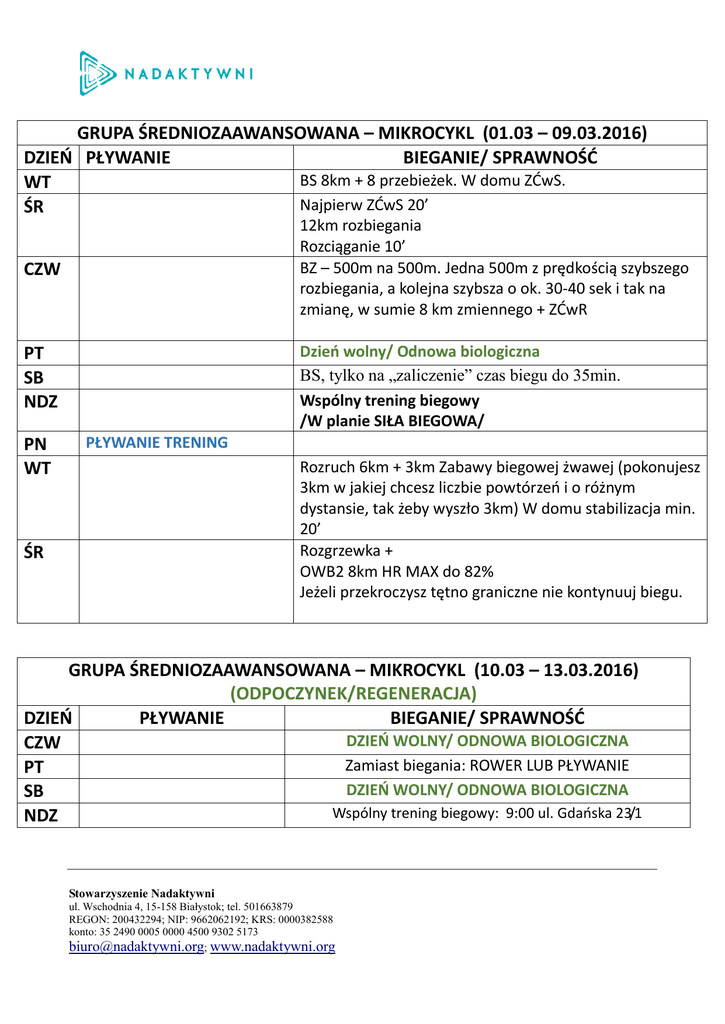 GRUPA ŚREDNIOZAAWANSOWANA – MIKROCYKL (01.03 – 09.03.2016) DZIEŃ PŁYWANIE BIEGANIE/ SPRAWNOŚĆ BS 8km + 8 przebieżek. W domu ZĆwS. WT Najpierw ZĆwS 20’ ŚR 12km rozbiegania Rozciąganie 10’ BZ – 500m na 500m. Jedna 500m z prędkością szybszego rozbiegania, a kolejna szybsza o ok. 30-40 sek i tak na zmianę, w sumie 8 km zmiennego + ZĆwR CZW Dzień wolny/ Odnowa biologiczna BS, tylko na „zaliczenie” czas biegu do 35min. Wspólny trening biegowy /W planie SIŁA BIEGOWA/ PT SB NDZ PN WT PŁYWANIE TRENING Rozruch 6km + 3km Zabawy biegowej żwawej (pokonujesz 3km w jakiej chcesz liczbie powtórzeń i o różnym dystansie, tak żeby wyszło 3km) W domu stabilizacja min. 20’ Rozgrzewka + OWB2 8km HR MAX do 82% Jeżeli przekroczysz tętno graniczne nie kontynuuj biegu. ŚR GRUPA ŚREDNIOZAAWANSOWANA – MIKROCYKL (10.03 – 13.03.2016) (ODPOCZYNEK/REGENERACJA) DZIEŃ PŁYWANIE BIEGANIE/ SPRAWNOŚĆ DZIEŃ WOLNY/ ODNOWA BIOLOGICZNA CZW Zamiast biegania: ROWER LUB PŁYWANIE PT DZIEŃ WOLNY/ ODNOWA BIOLOGICZNA SB Wspólny trening biegowy: 9:00 ul. Gdańska 23/1 NDZ Stowarzyszenie Nadaktywni ul. Wschodnia 4, 15-158 Białystok; tel. 501663879 REGON: 200432294; NIP: 9662062192; KRS: 0000382588 konto: 35 2490 0005 0000 4500 9302 5173 [email protected]; www.nadaktywni.org GRUPA ŚREDNIOZAAWANSOWANA – MIKROCYKL (14.03 – 24.03.2016) (MOCNY)* DZIEŃ PŁYWANIE BIEGANIE/ SPRAWNOŚĆ Wspólny trening pływacki – {ew. Siłownia - trening stricte ogólnorozwojowy, z PN uwzględnieniem wszystkich partii mięśniowych. Serie na górę przeplataj z partiami dolnymi, a na koniec mm brzucha i mm grzbietu.} WT A. Easy running 30’ Dalej: dogrzanie tzn. 5' poświęć na górę (np. krążenia ramion, tułowia, skrętoskłony) i 5' kończyny dolne (wypady, wykroki, wymachy nóg, podskoki lekko) Cz. główna: B. Bieg po schodach (wbieg, zbieg) 3x 3’/ przerwa 90'’ C. Wskoki obunóż na schody (co każdy stopień) – 6 serii wskoków ŚR CZW PT SB NDZ PN WT Pomiary: waga, obwód pasa, tętno. D. Wskoki PN i LN na schody – 6 serii na każdą nogę wskoków Inny rodzaj aktywności fizycznej, niż bieganie. BS, tylko na „zaliczenie” czas biegu do 40min + Praca nad szybkością: 10 rytmów z narast. prędk. na odcinku 80-120m DZIEŃ WOLNY: ODNOWA BIOLOGICZNA Cross przełajowy w formie Interwałów: 4x2000m (górka, dół, przełaj) prz. 3-4’ Wspólny trening biegowy, godz. 9:00 PŁYWANIE TRENING BNP 12KM. Zaczynamy łagodnie, podkręcamy nie wcześniej niż po 7km. Ostatni 1km mocno. Rozbieganie 35’ + 20 rytmów w różnych modyfikacjach (np. lotne, z narast. predk, krótkie, dłuższe, z górki itp.) ŚR Stowarzyszenie Nadaktywni ul. Wschodnia 4, 15-158 Białystok; tel. 501663879 REGON: 200432294; NIP: 9662062192; KRS: 0000382588 konto: 35 2490 0005 0000 4500 9302 5173 [email protected]; www.nadaktywni.org BT Po solidnej rozgrzewce 5km w tempie jakim chcesz przebiec półmaraton na wiosnę 2016. CZW GRUPA ŚREDNIOZAAWANSOWANA – MIKROCYKL (25.03 – 28.03.2016) (ODPOCZYNEK/REGENERACJA) DZIEŃ PŁYWANIE BIEGANIE/ SPRAWNOŚĆ DZIEŃ WOLNY/ ODNOWA BIOLOGICZNA PT Trening uzupełniający [np. rower, siłownia, basen] + SB gimnastyka 15minut + rozciąganie 5’ DZIEŃ WOLNY/ ODNOWA BIOLOGICZNA BNP 14KM. Zaczynamy łagodnie, podkręcamy nie wcześniej niż po 8km. Ostatnie 2km mocno NDZ PN Stowarzyszenie Nadaktywni ul. Wschodnia 4, 15-158 Białystok; tel. 501663879 REGON: 200432294; NIP: 9662062192; KRS: 0000382588 konto: 35 2490 0005 0000 4500 9302 5173 [email protected]; www.nadaktywni.org
